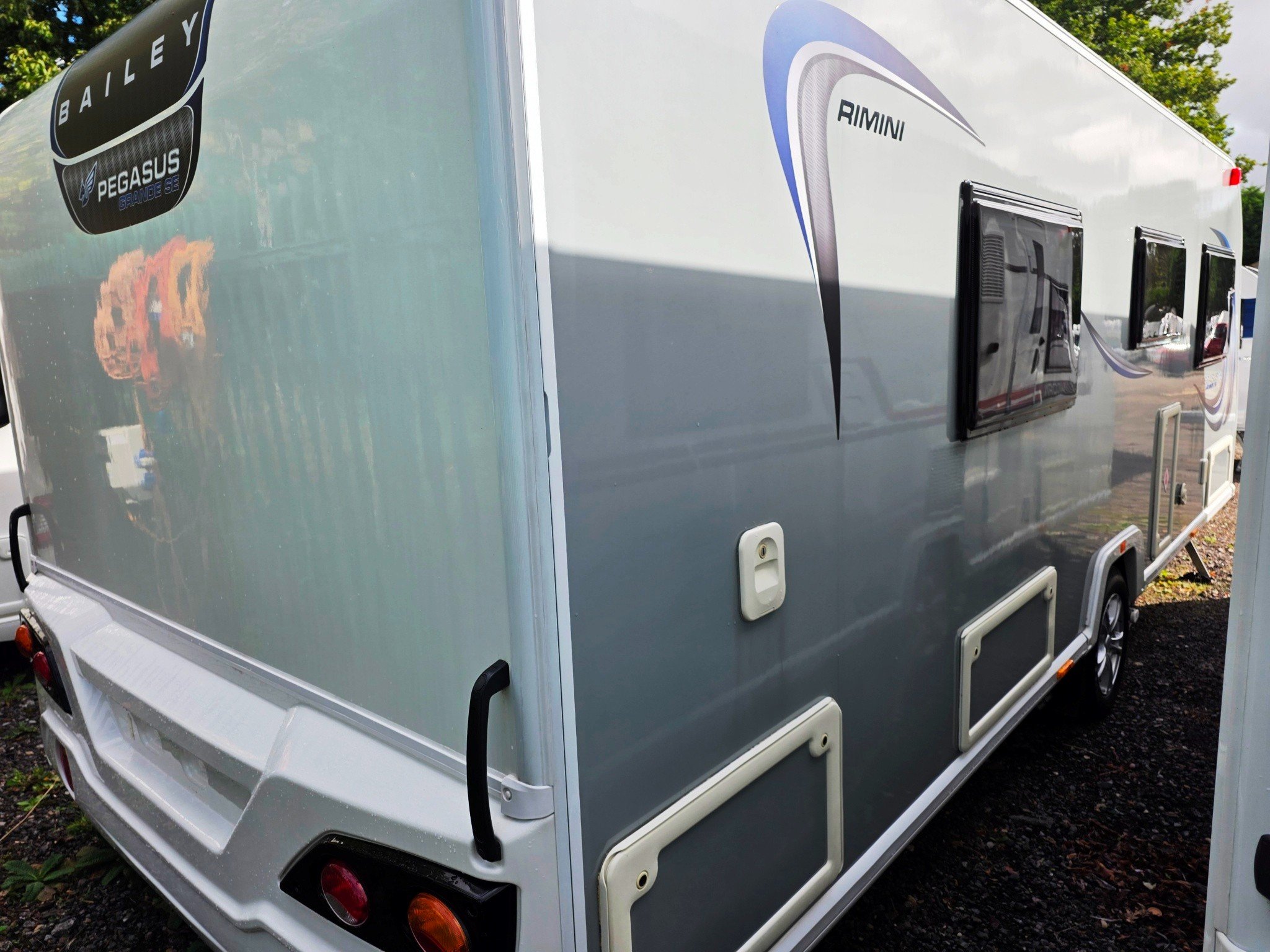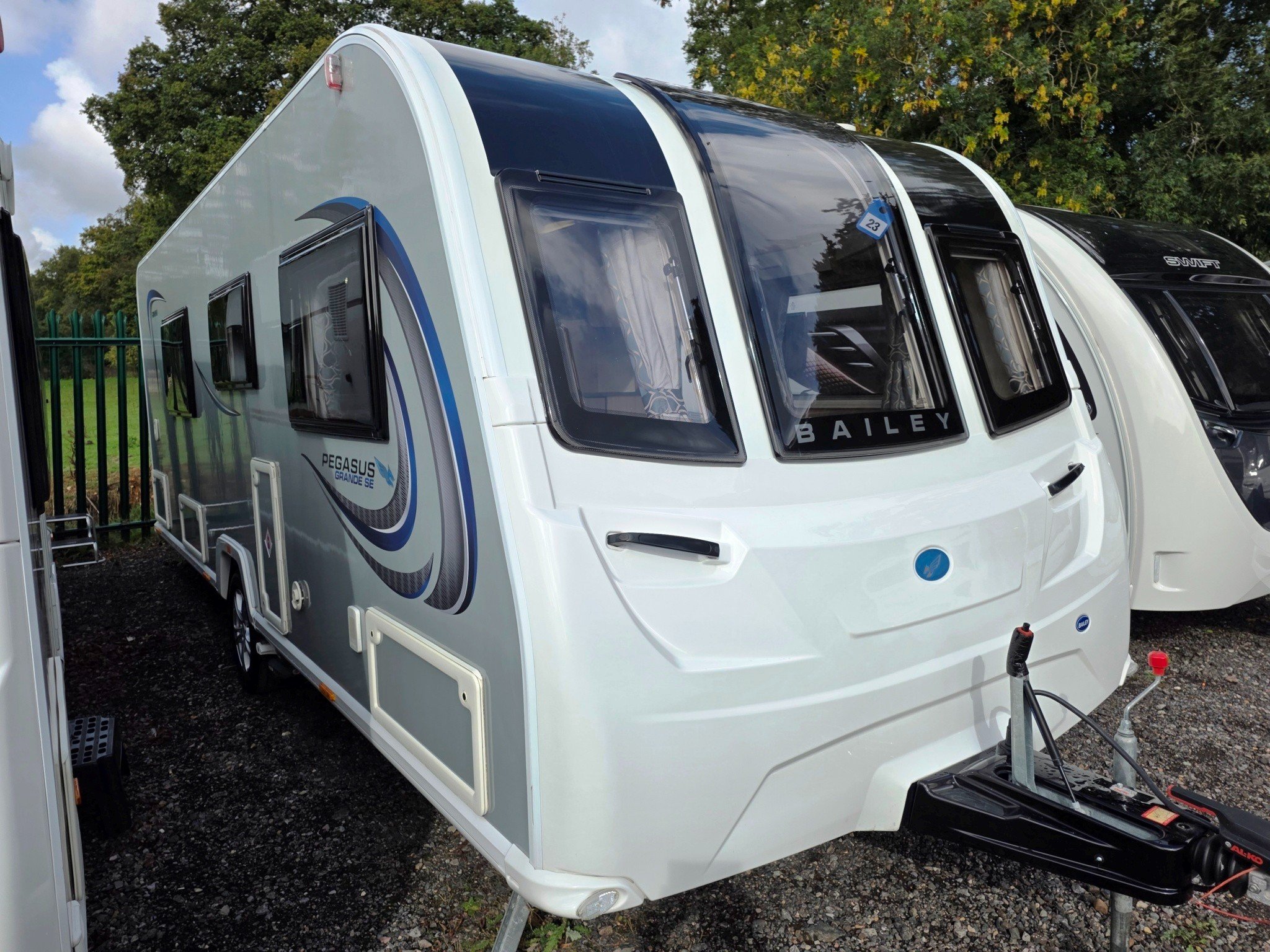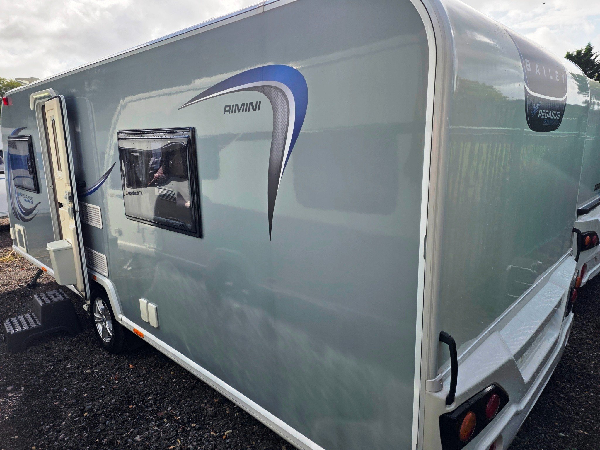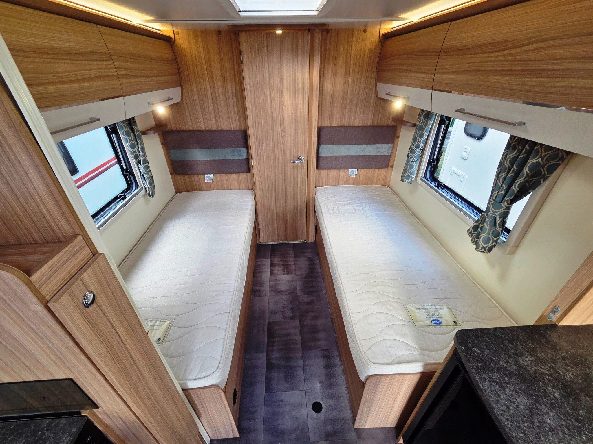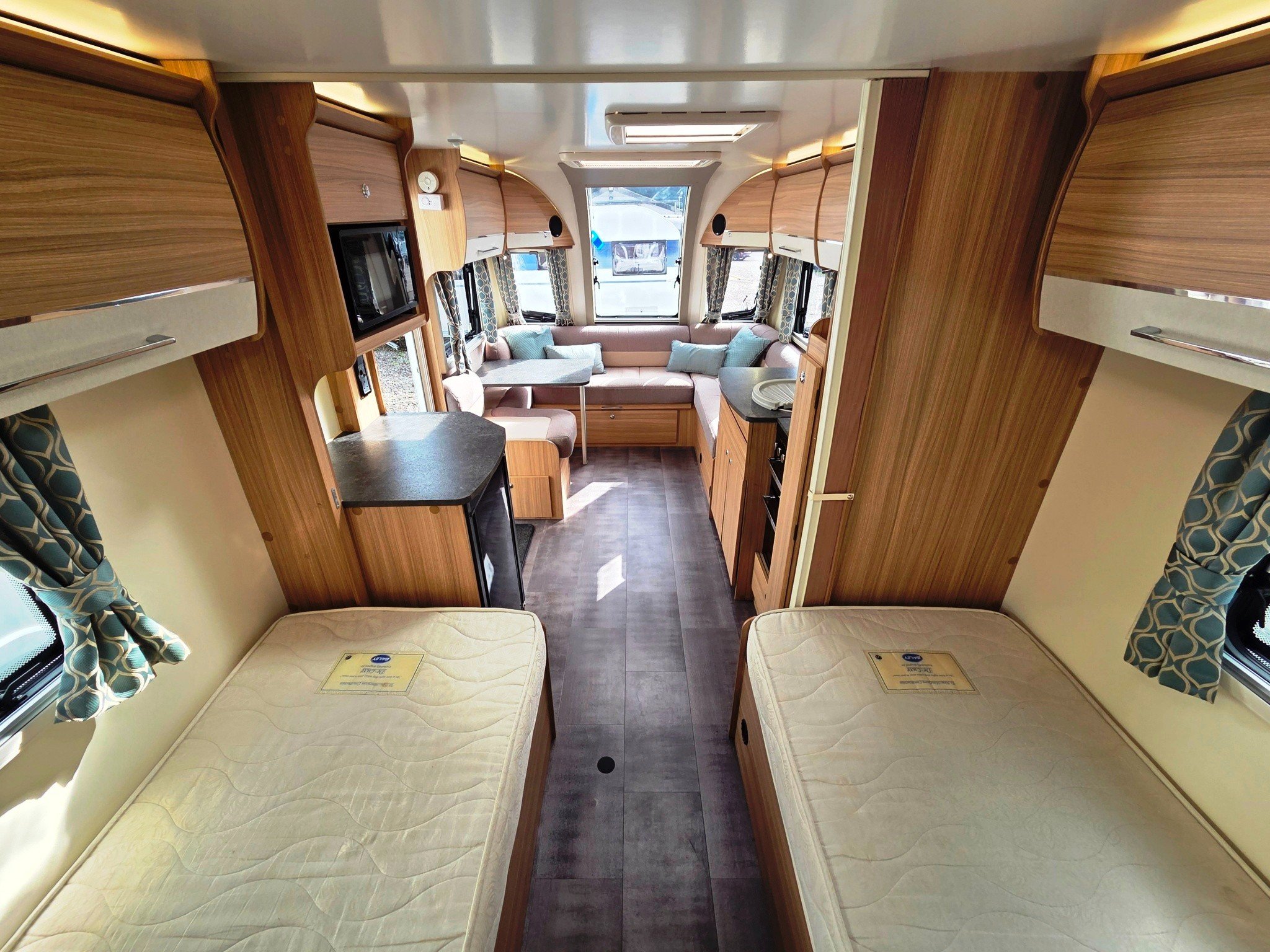 Bailey Pegasus Grande SE Rimini 2021 4 berth fixed single beds touring caravan for sale. 8 ft wide twin axle model for maximum space. One owner model used only a handful of times with many extras.