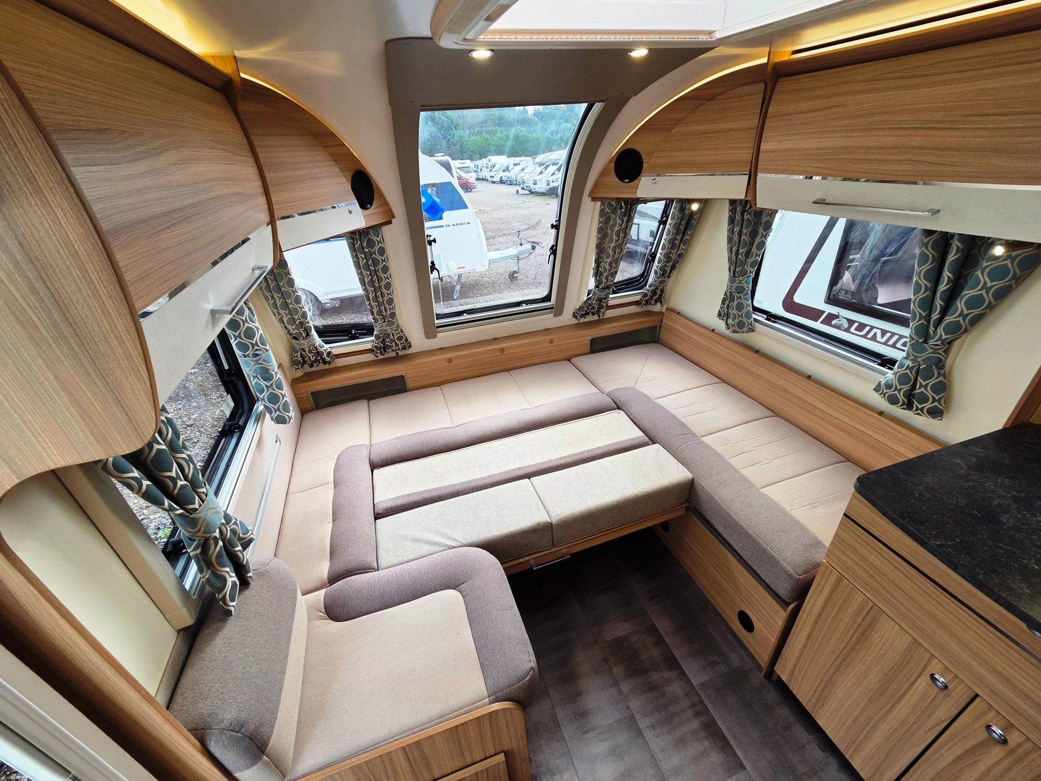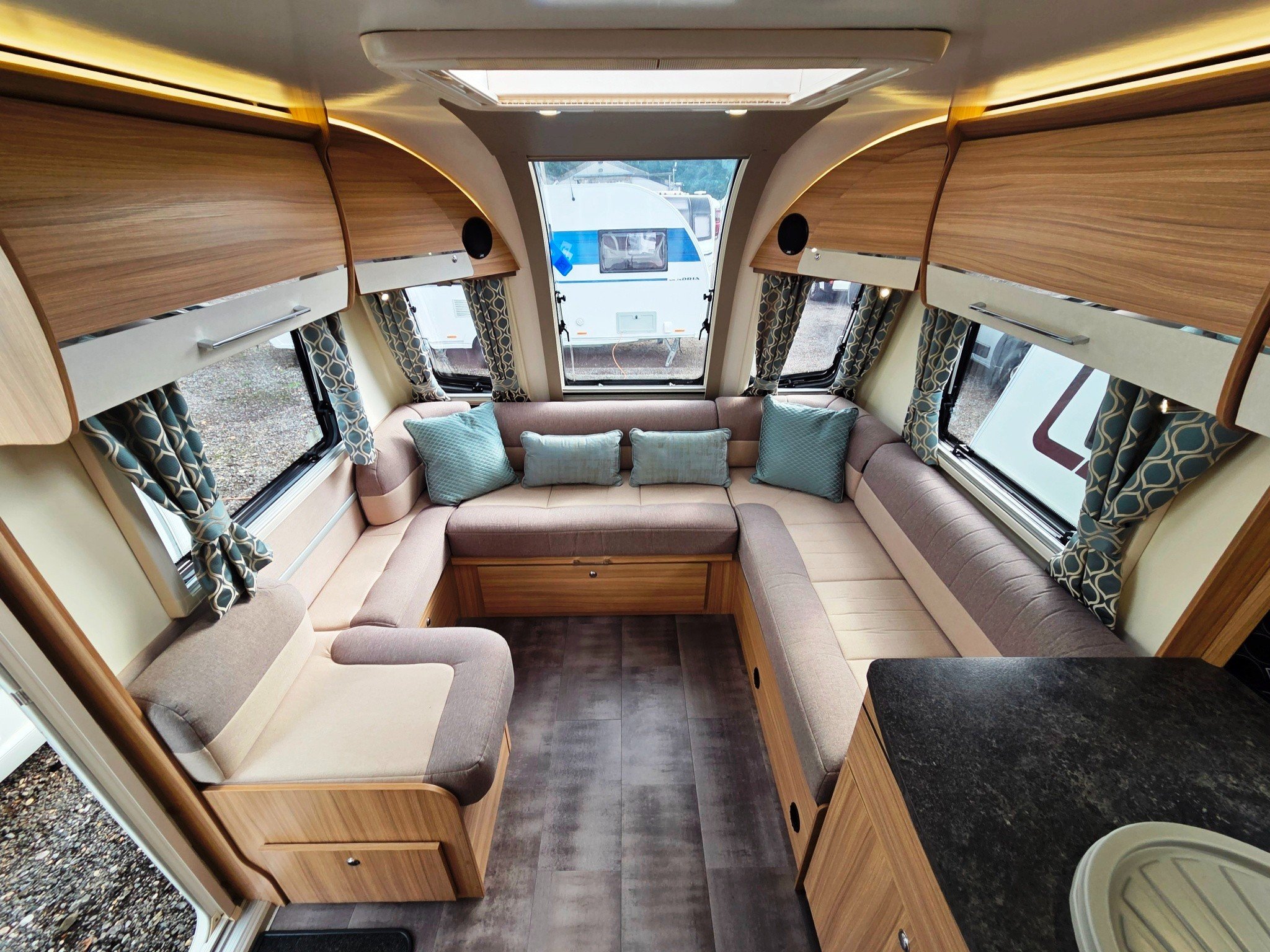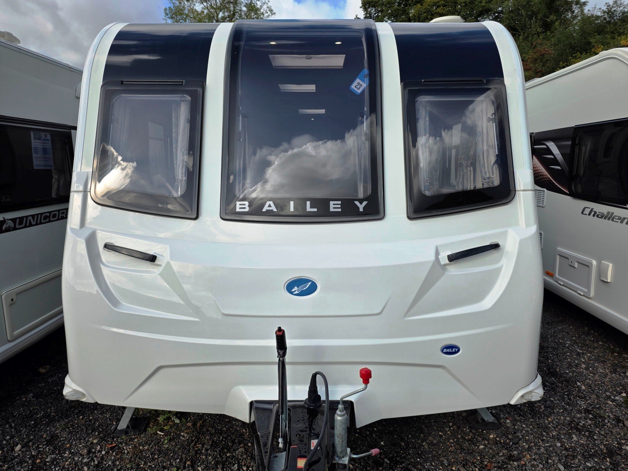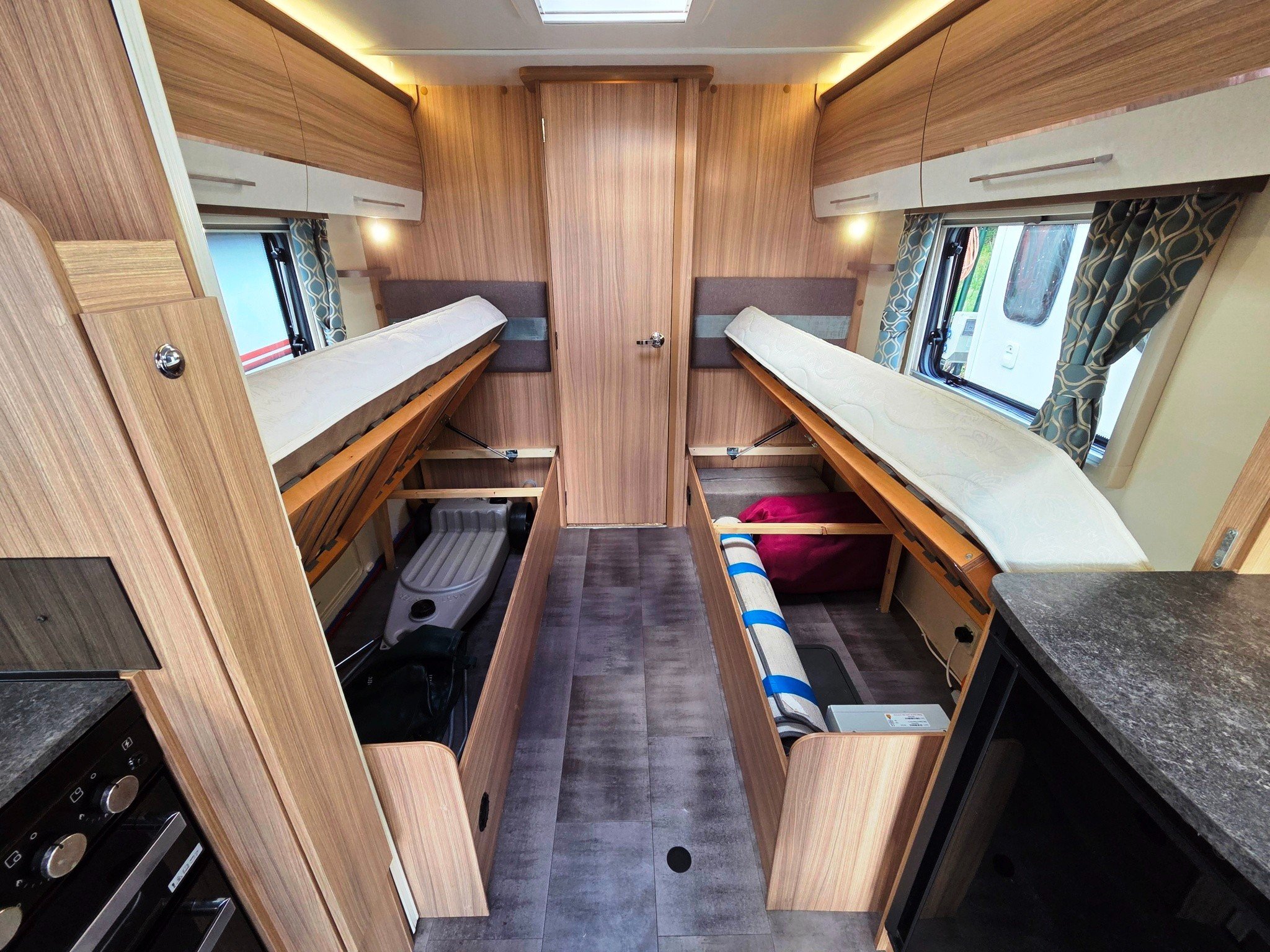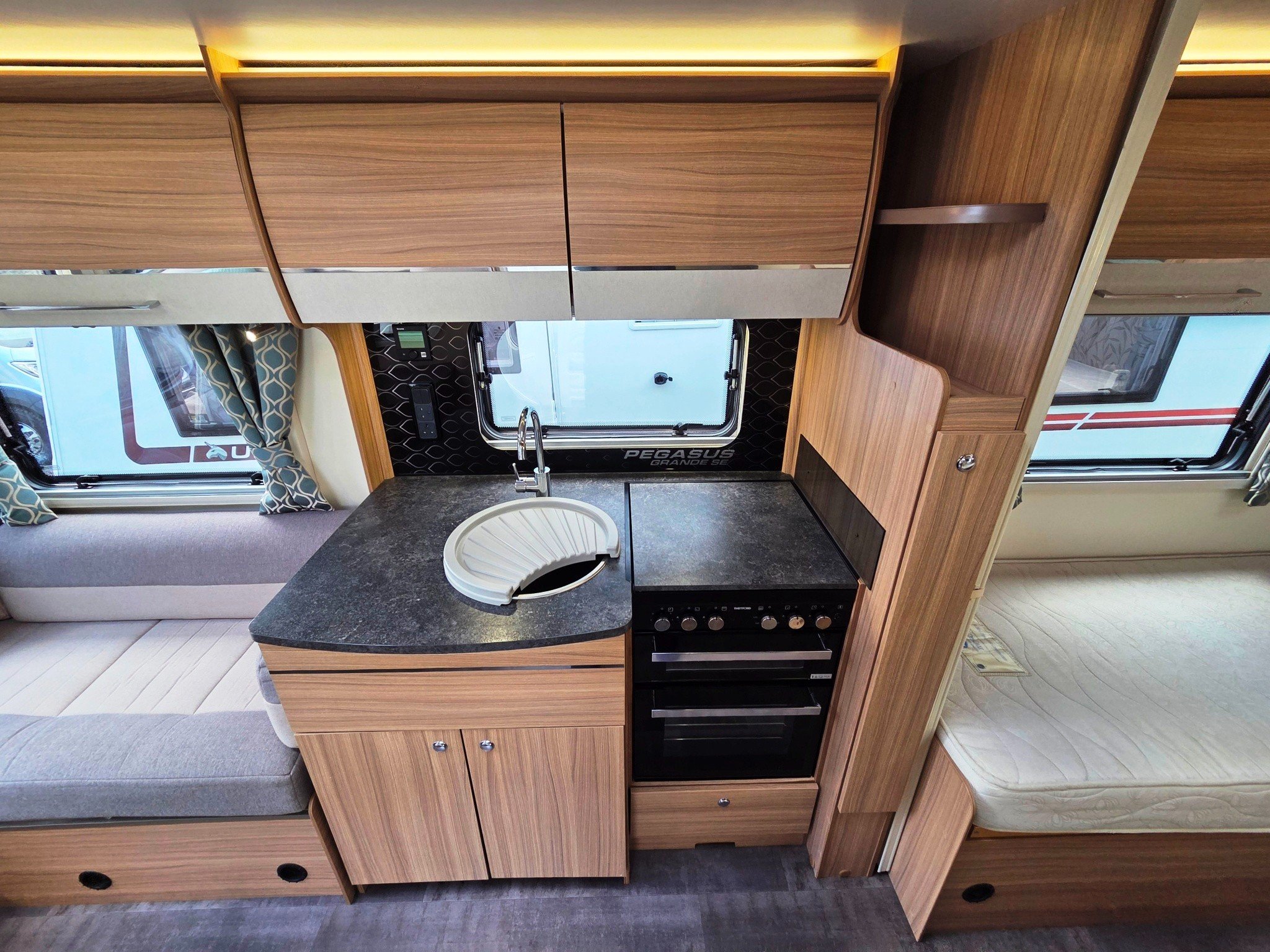 Bailey Pegasus Grande SE Rimini 2021 4 berth fixed single beds touring caravan for sale. 8 ft wide twin axle model for maximum space. One owner model used only a handful of times with many extras.