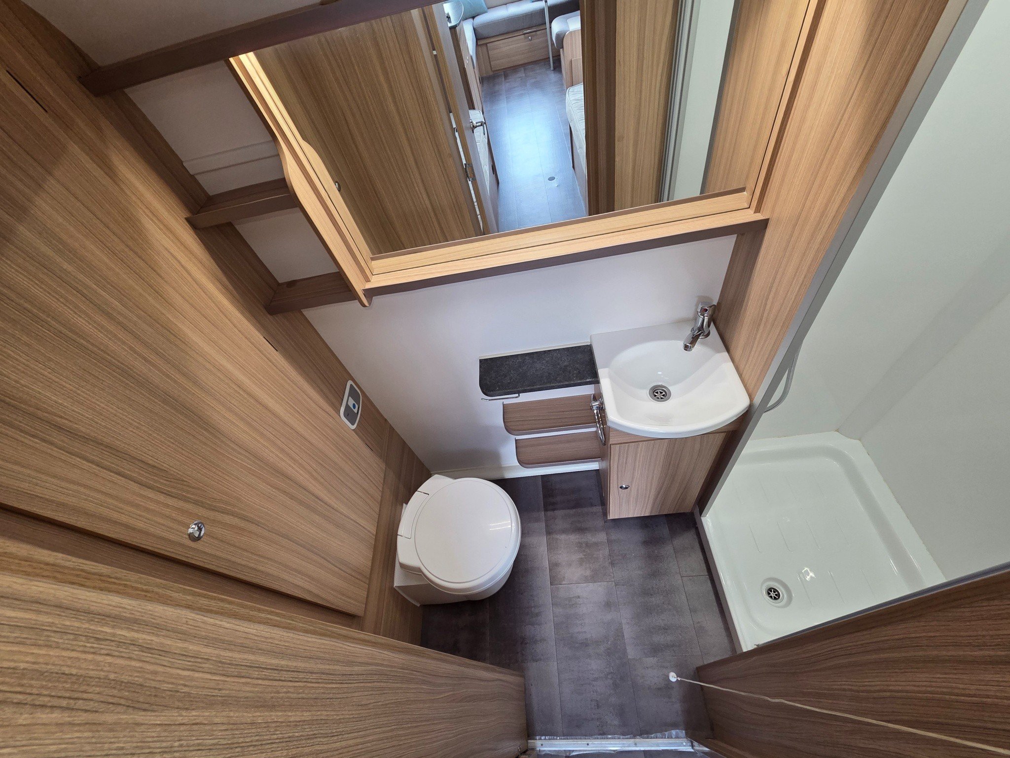 Rear washroom with cassette toilet, separate shower, window, fixtures and cupboards.