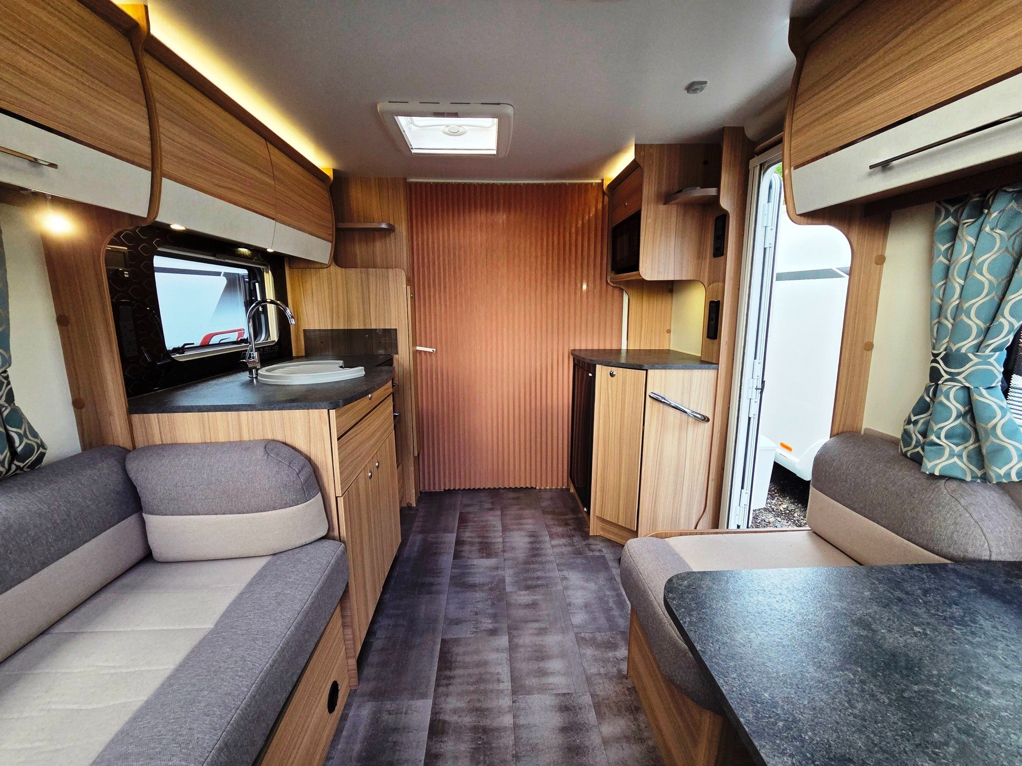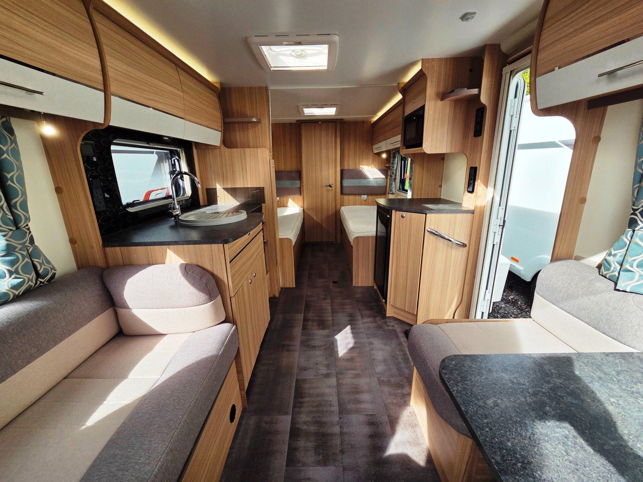 Specification includes auto engage motormover system, ALKO ATC, ALKO stabiliser hitch, LED internal lighting, alarm system, roof mounted solar panel, Truma Combi boiler with iNet, drop down fitted carpets, Status directional TV aerial, CD/radio, external 240v and BBQ gas points.