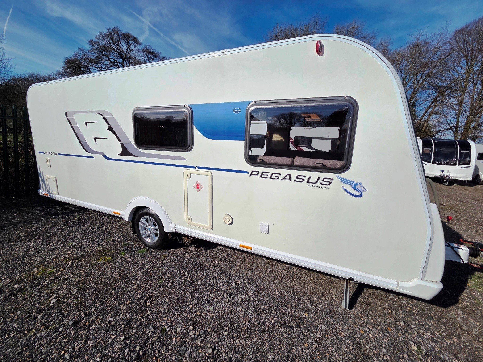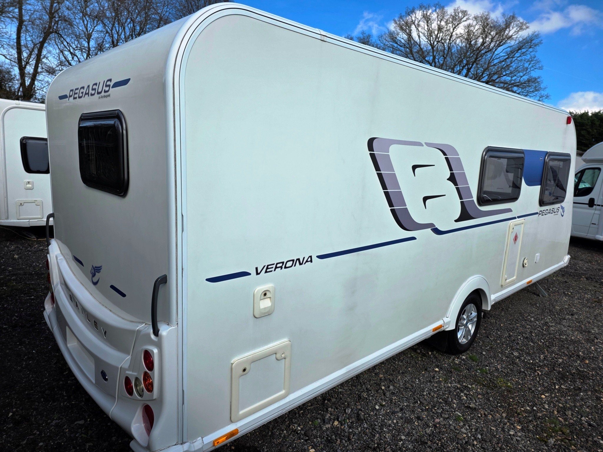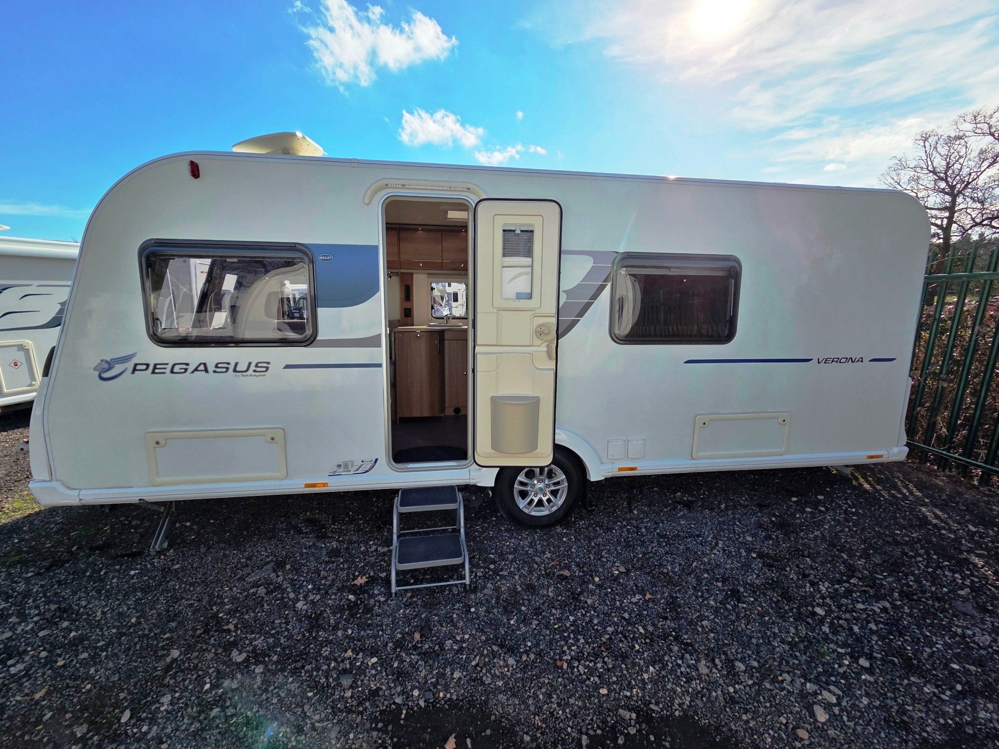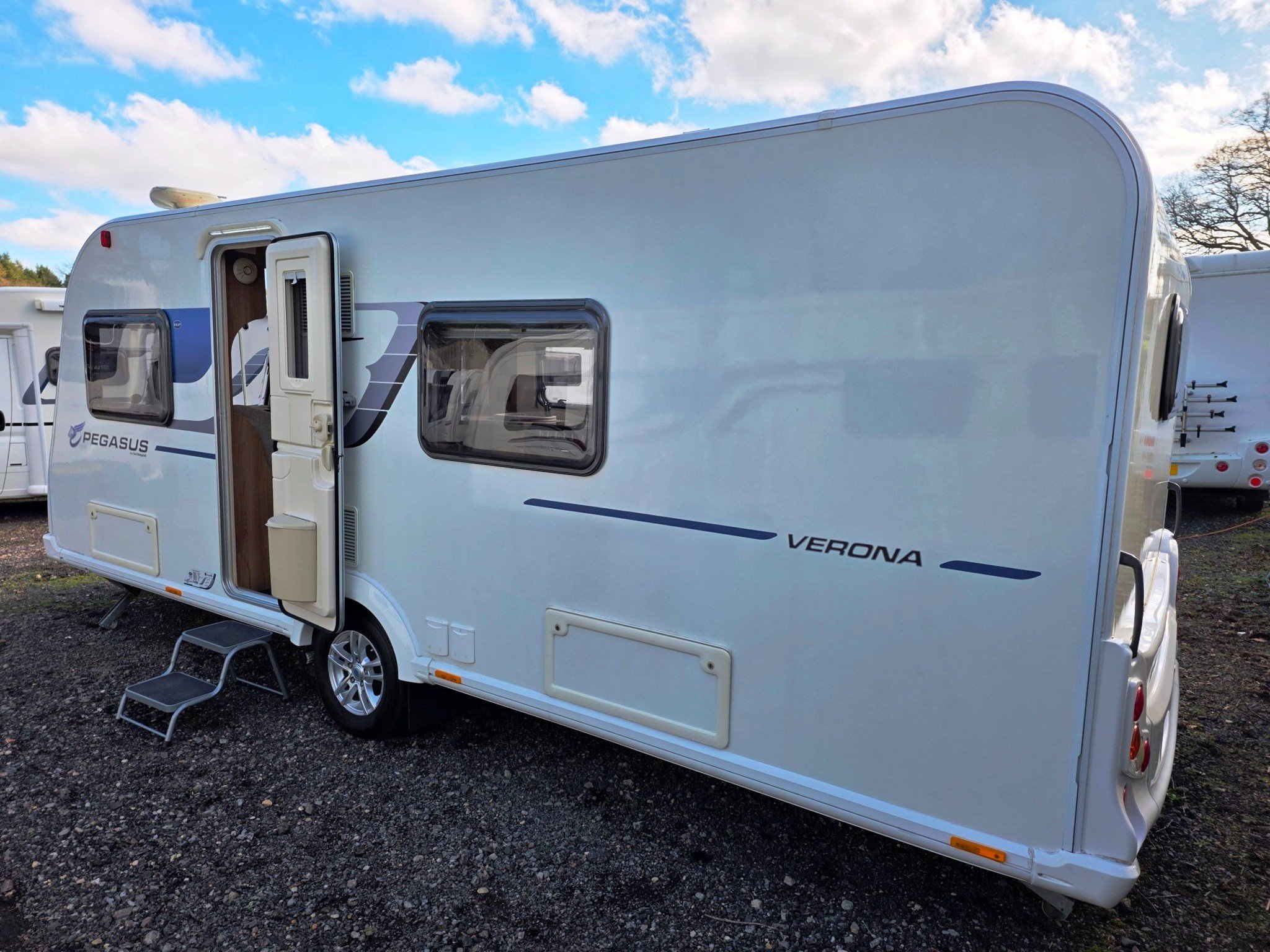 Bailey Pegasus Verona 2016 single axle 4 berth touring caravan for sale with motormover. Fixed double bed and rear washroom with separate shower. Many extras included.