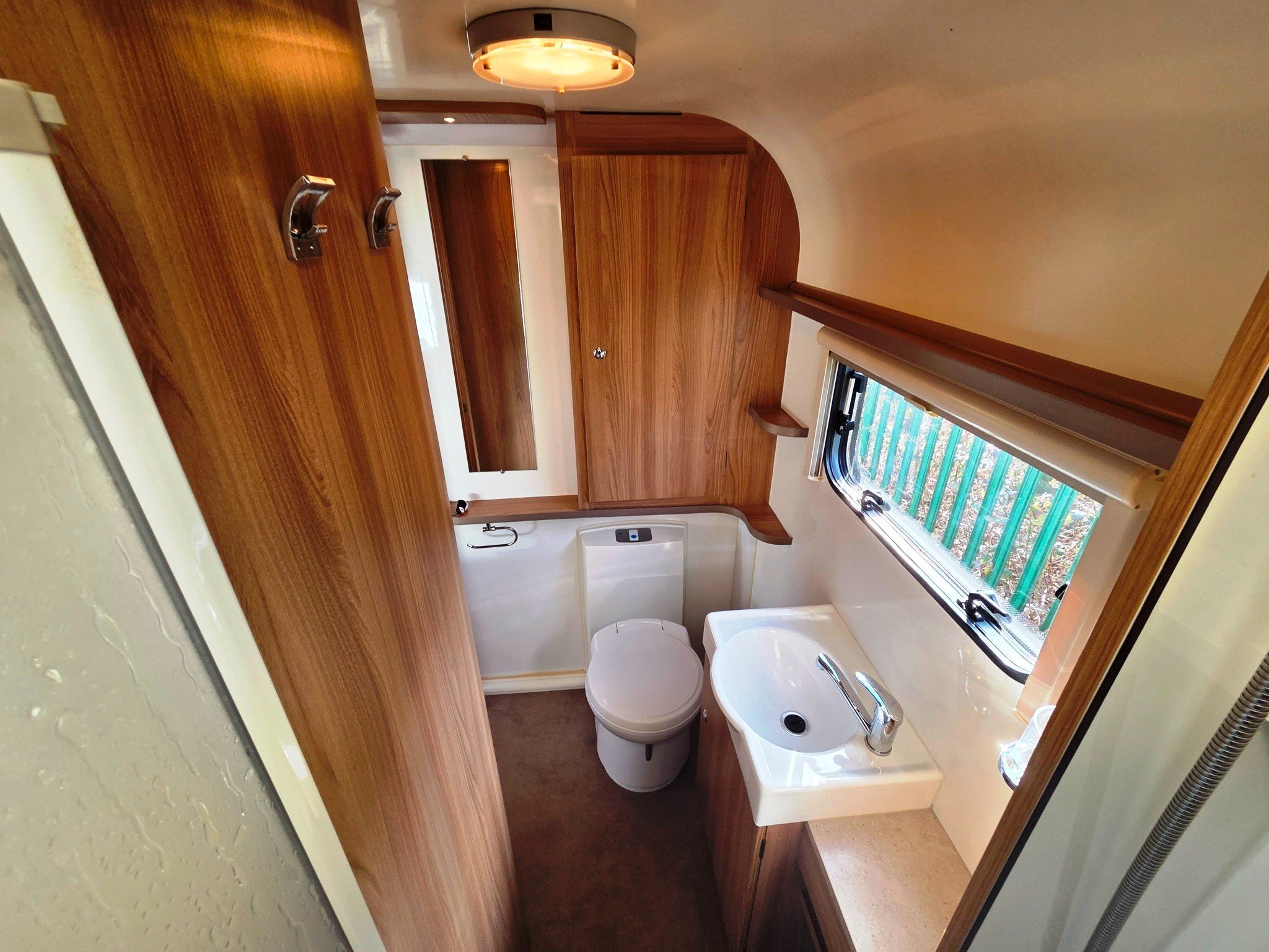 Rear full width washroom with toilet, hand washbasin and separate shower.