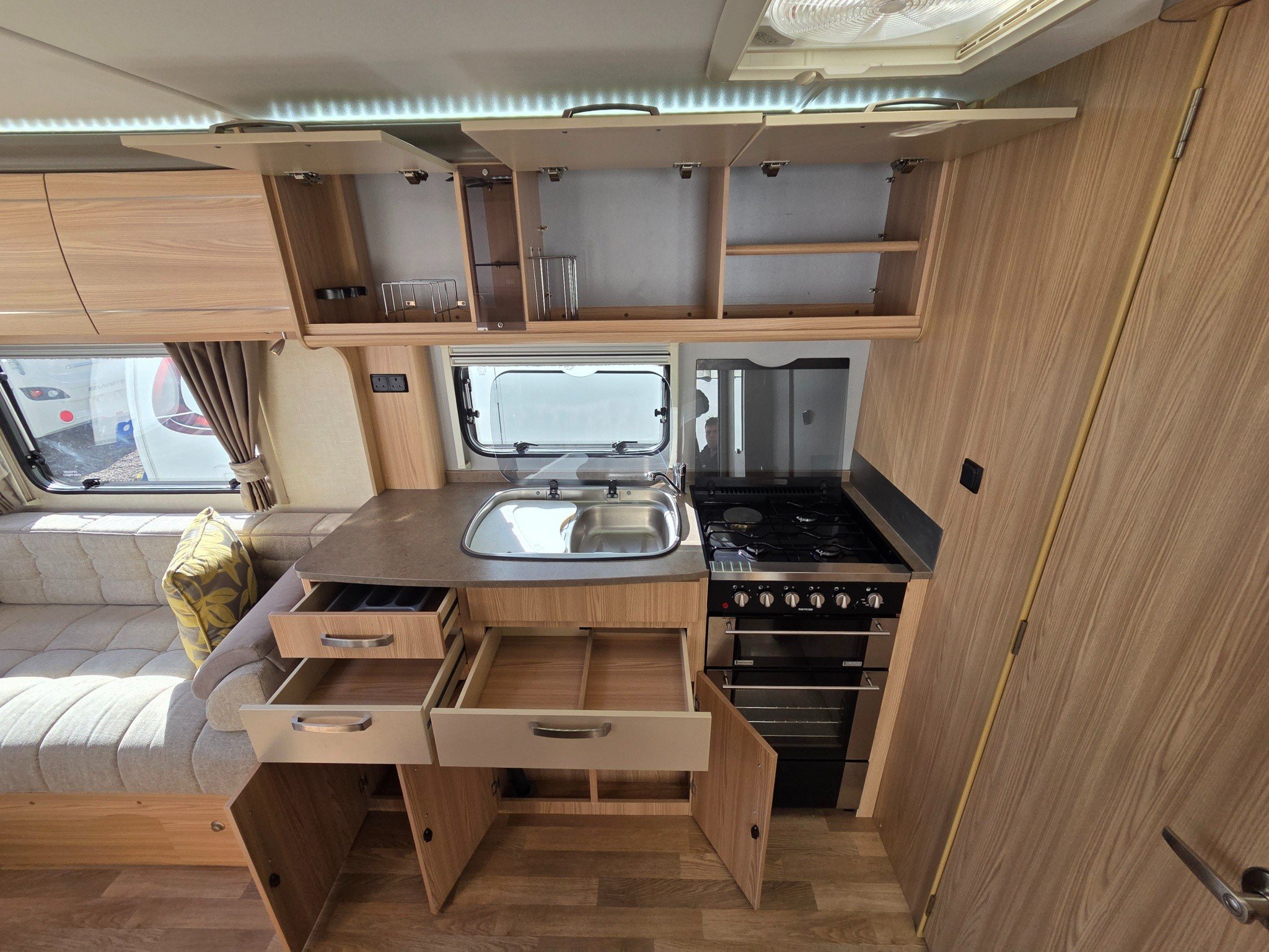 Centre kitchen with hobs, grill, oven, microwave, sink, draining area, extractor roof fan, cupboards and draws.