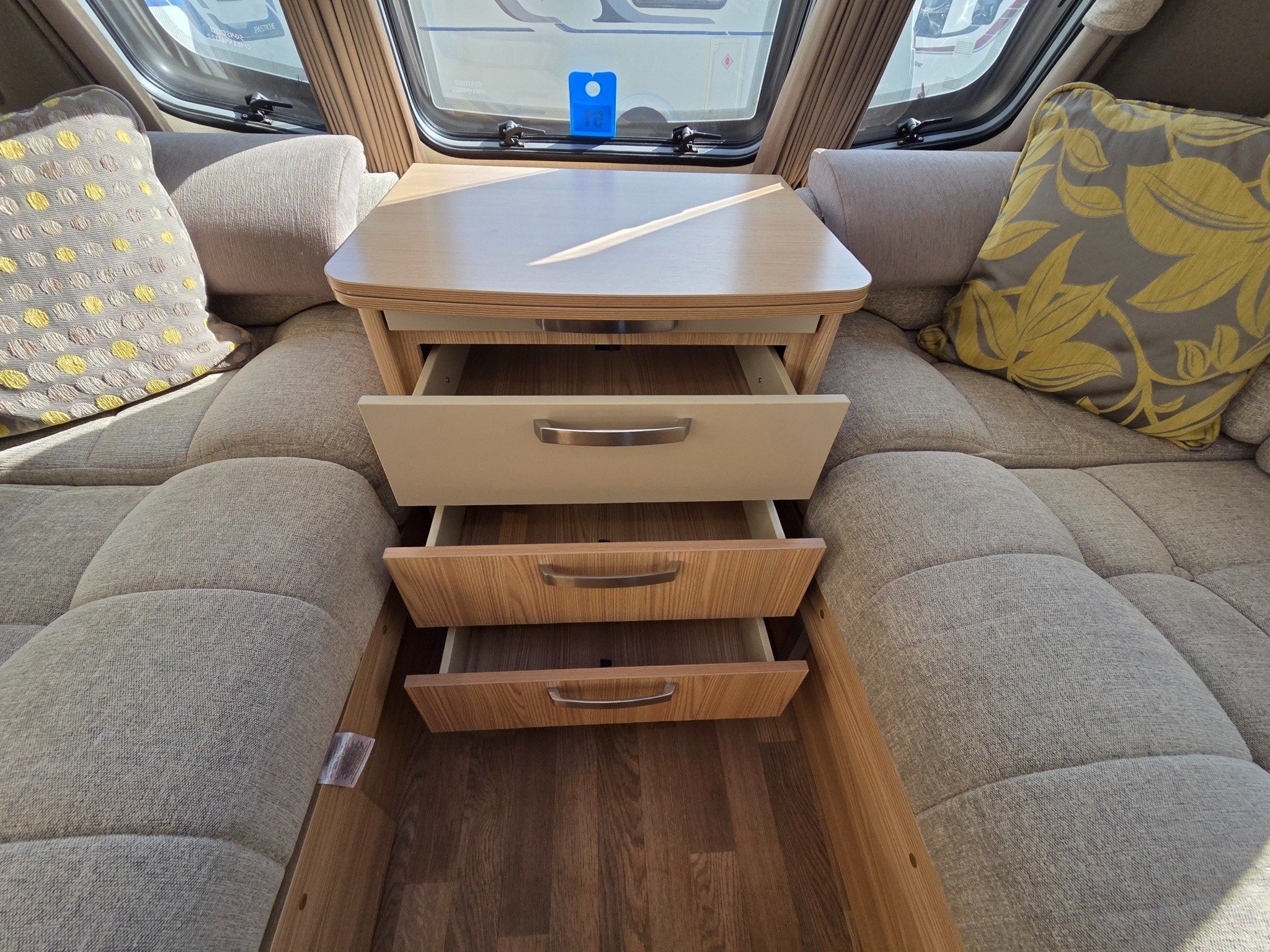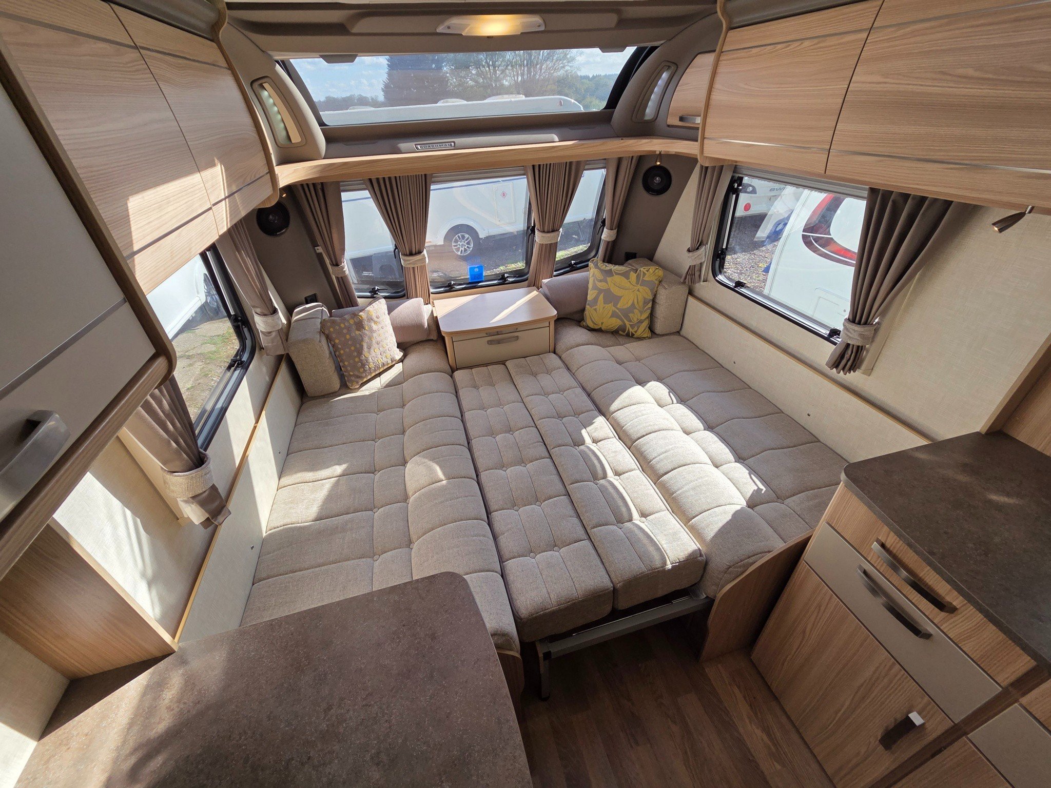 Lounge with parallel sofa seats and central chest of draws with pull out table. Sofas convert into large double bed.