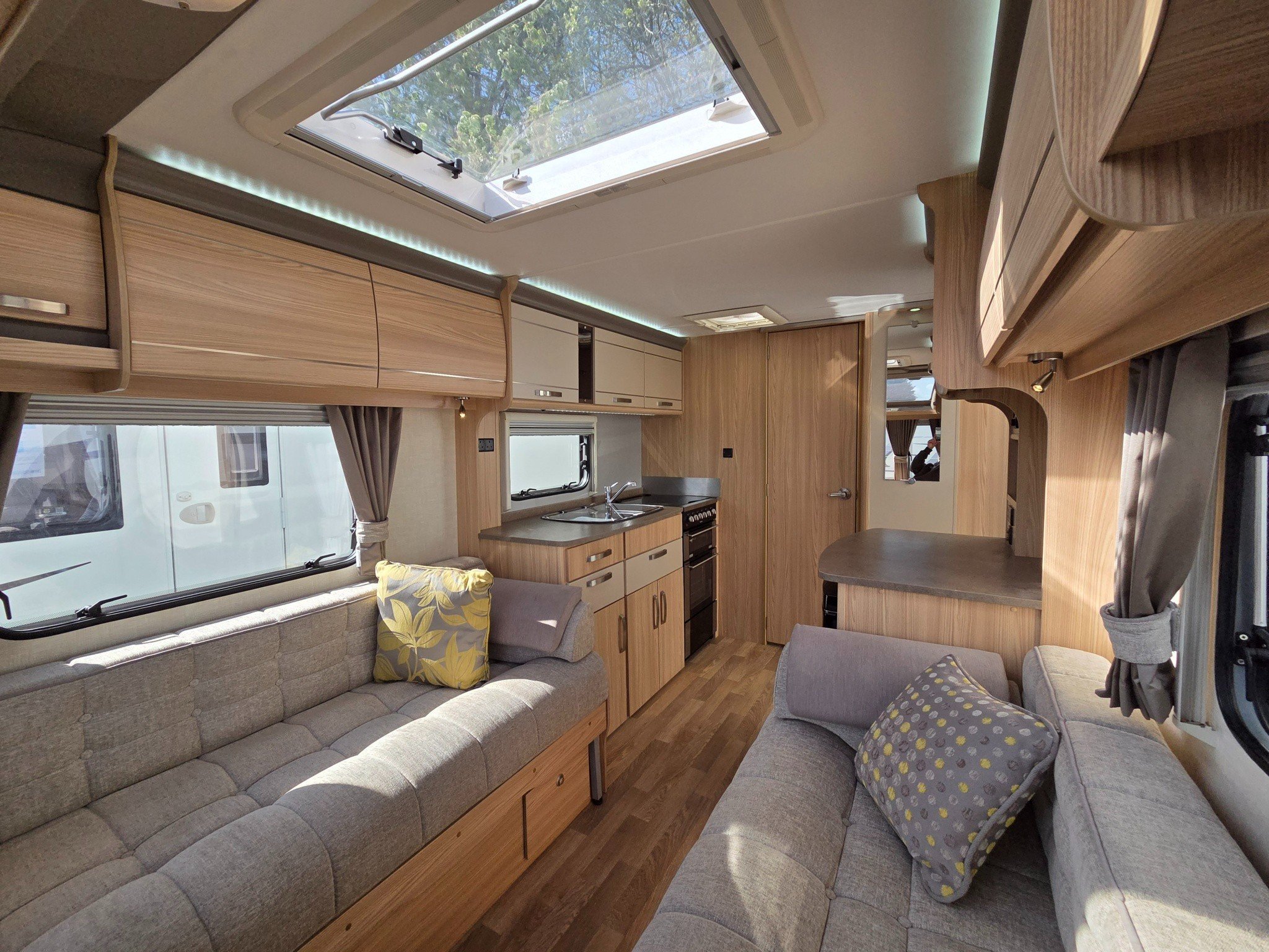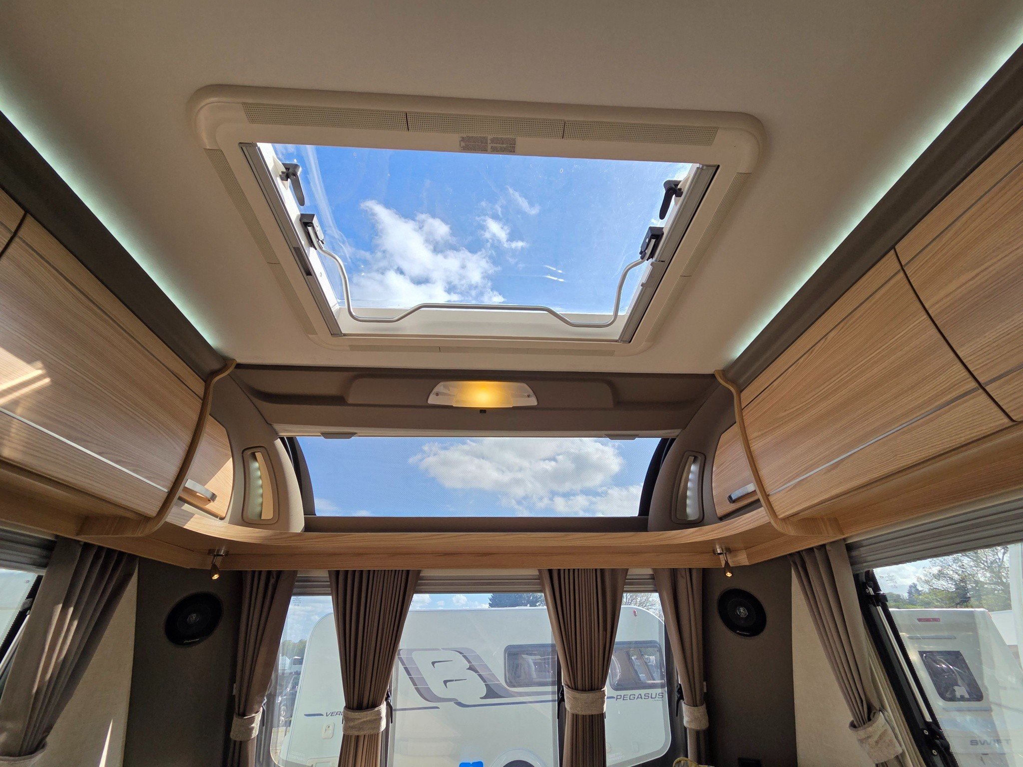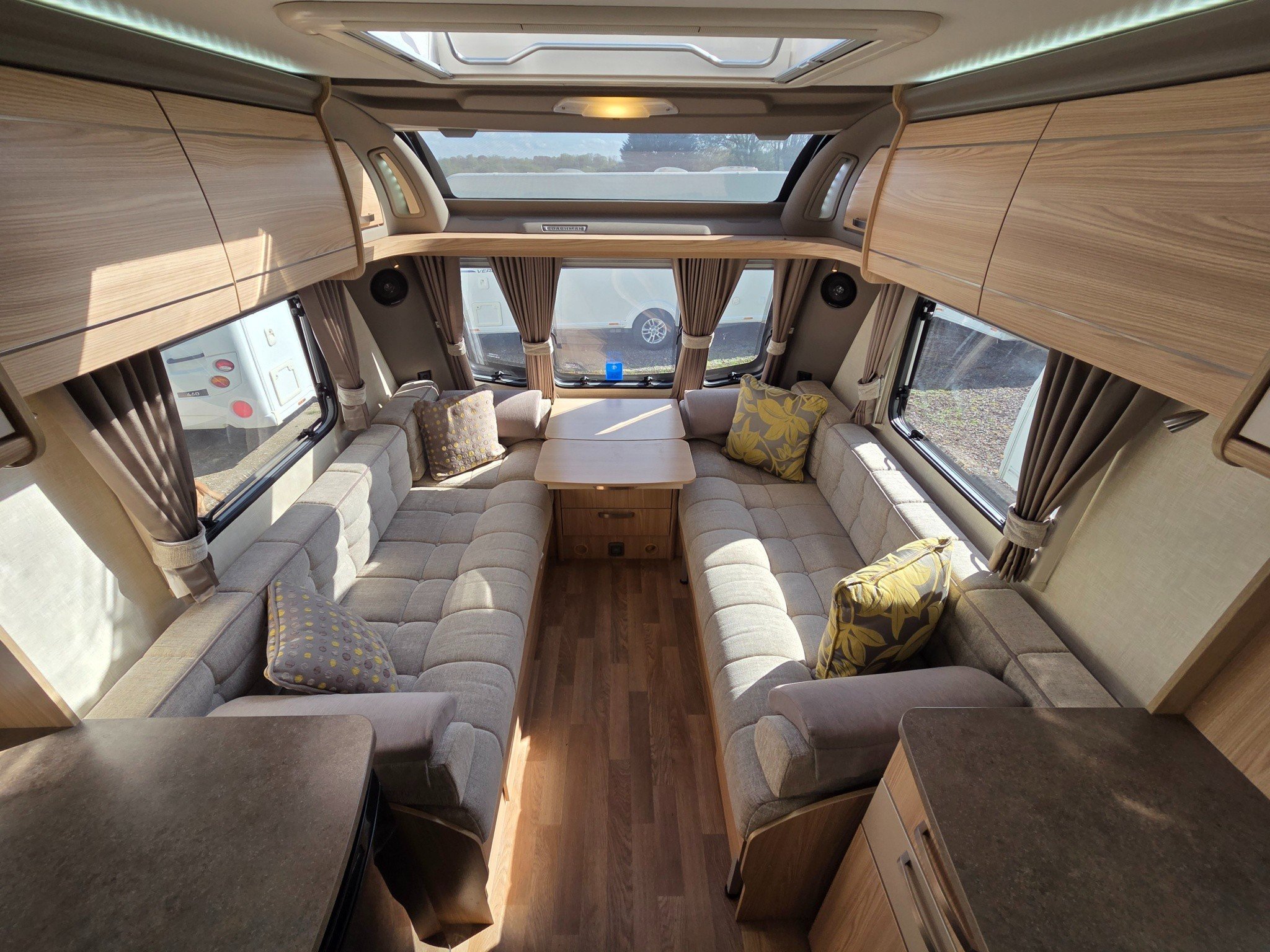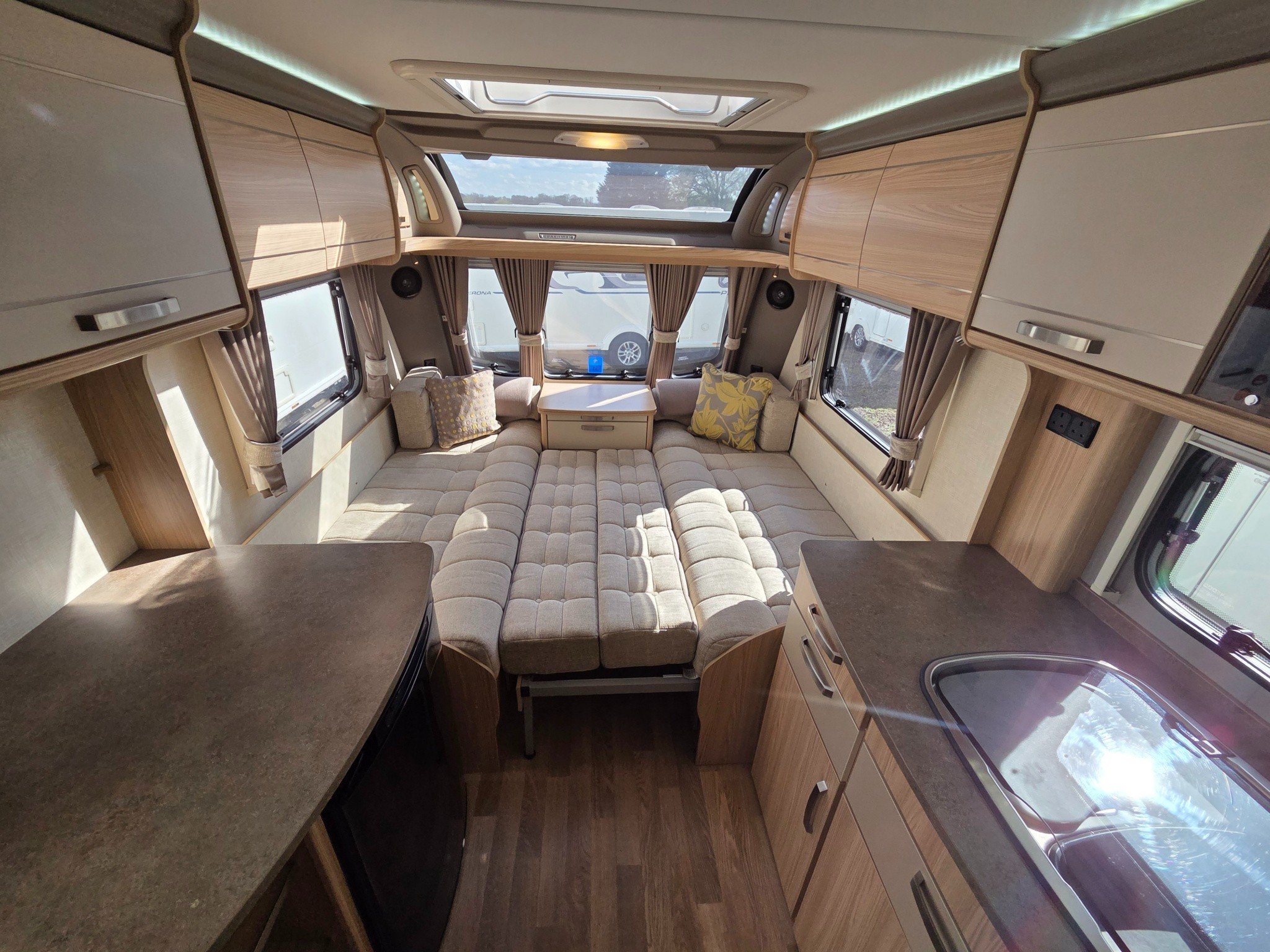 Superb spec with motormover, panoramic sunroof, Truma combi heating and hot water, alloy wheels, drop down carpets, alarm with fobs, extractor roof fan, external 240v & BBQ gas outlets, ALKO anti snake hitch, ALKO ATC and CD-radio.