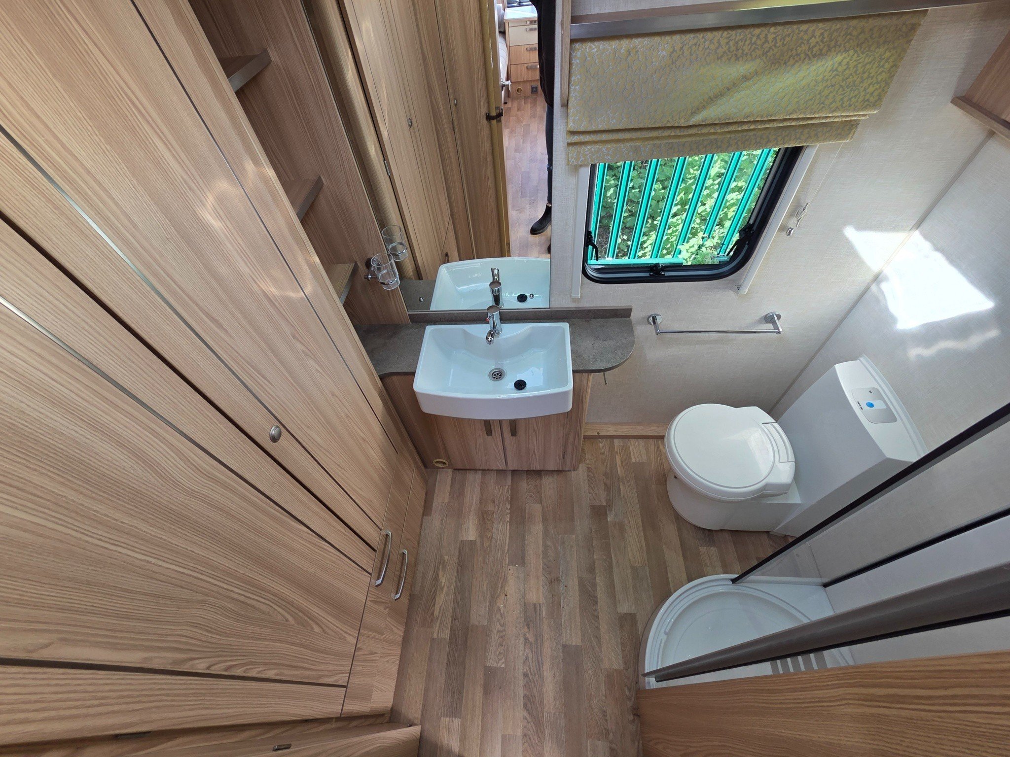 Rear washroom with separate shower, toilet, large wardrobe, hand washbasin and fixtures.