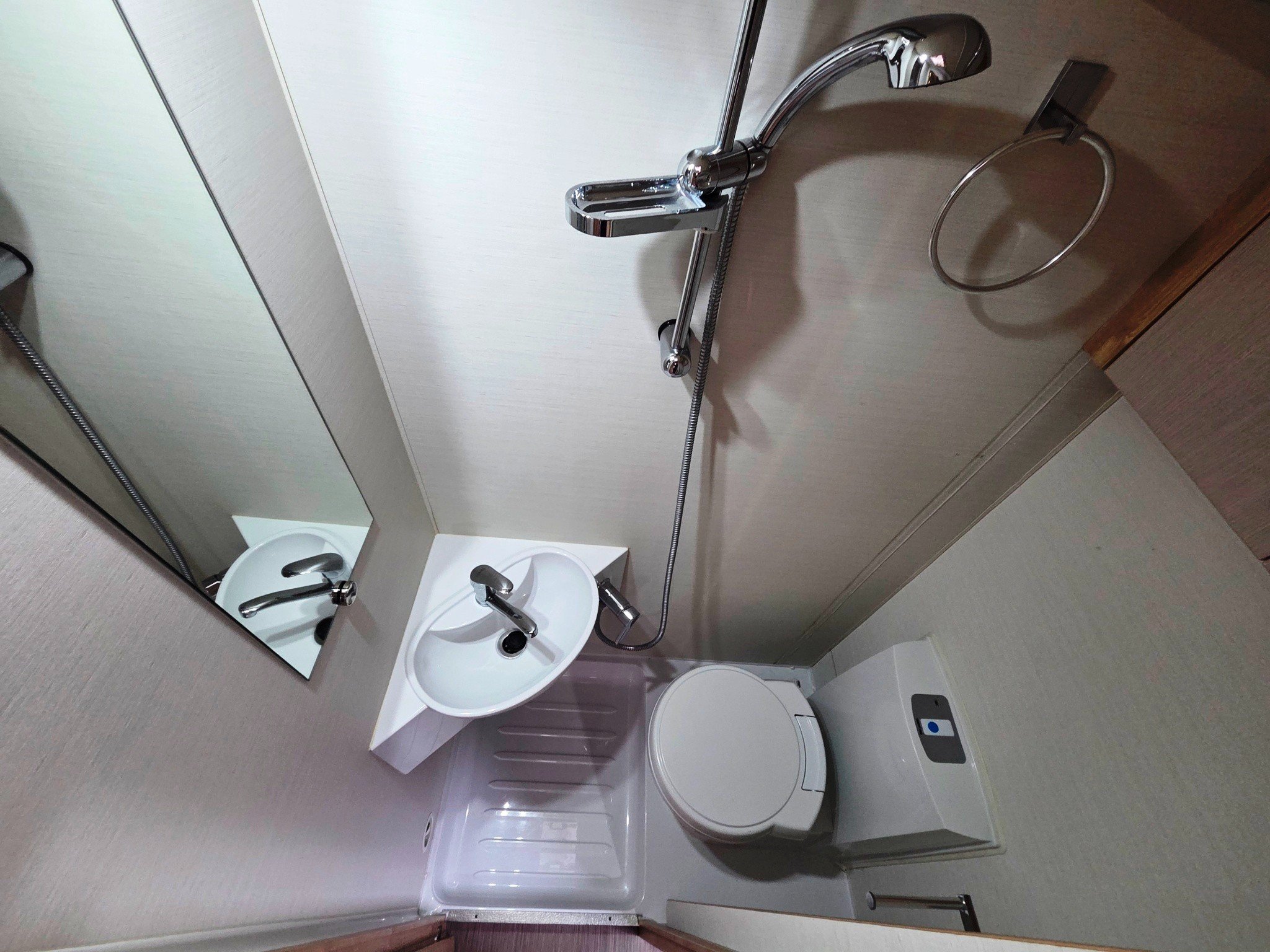 Rear corner washroom with shower, toilet, hand washbasin and fixtures.