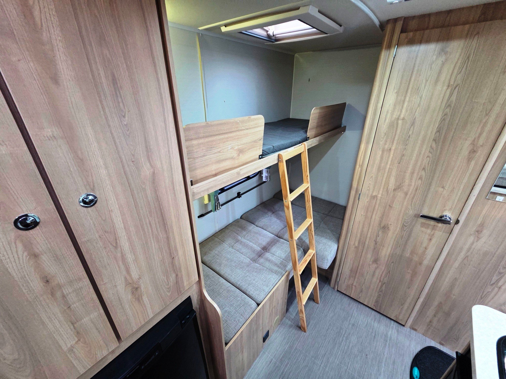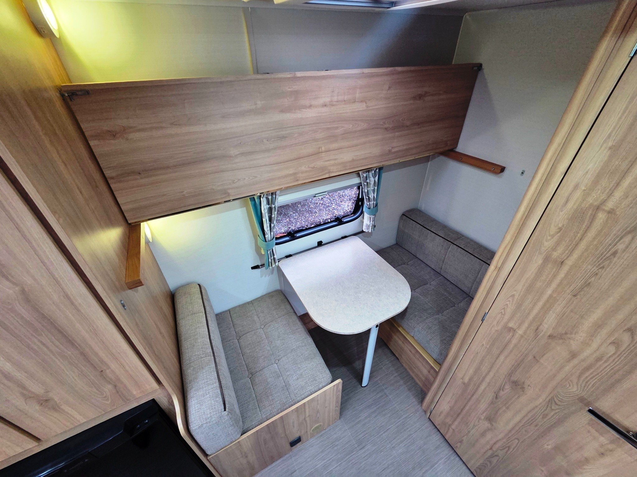 Rear corner dinette with twin sofa seats with central dining table. Converts into single bed or bunk beds.