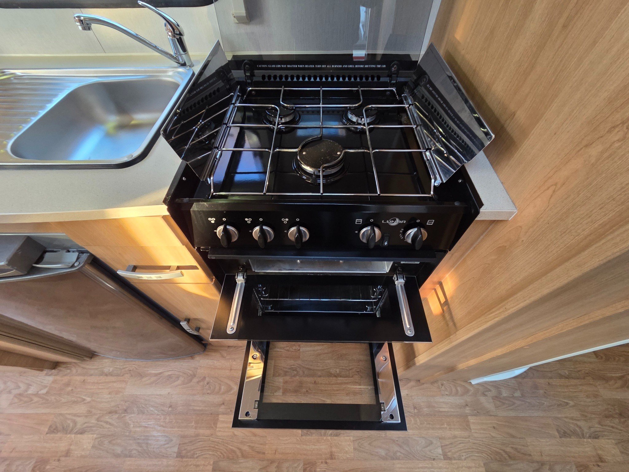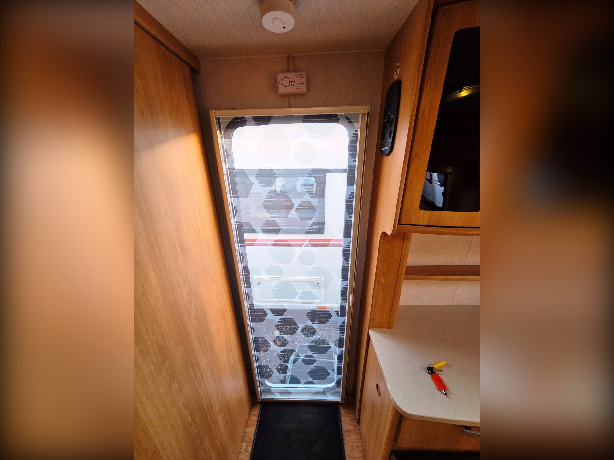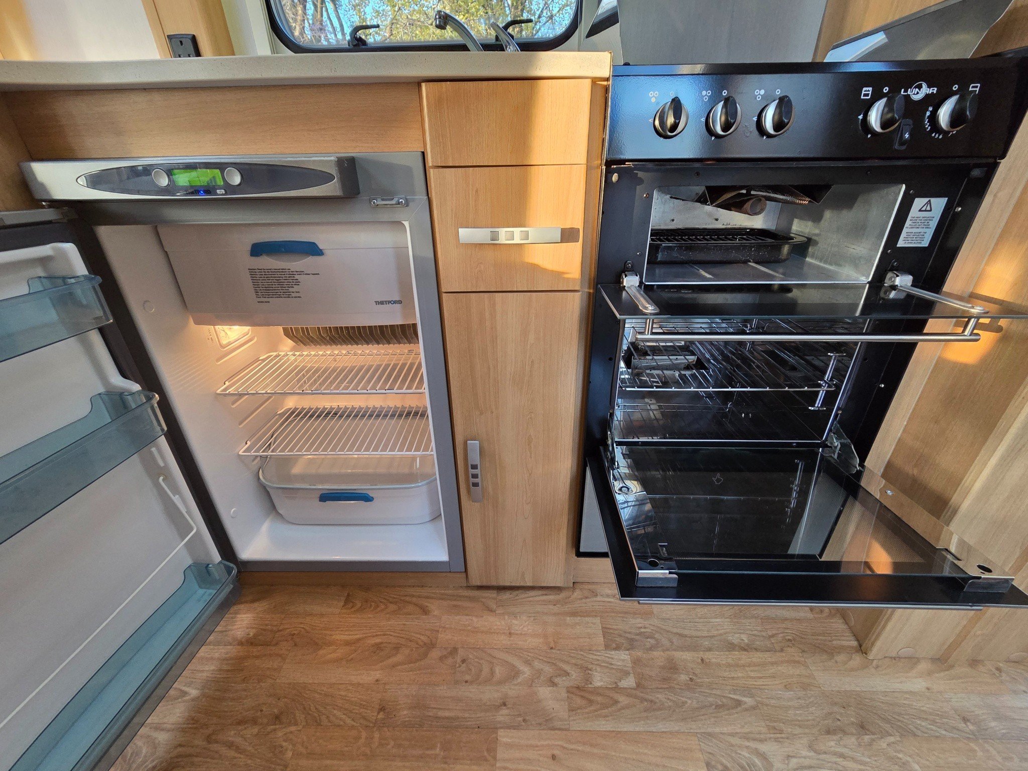 Specification includes motormover, Truma Ultraheat space heater with blown air, Truma Ultrastore water heater, alloy wheels, drop down fitted carpets, ALKO anti snake hitch, Status directional TV aerial, external 240v socket and external BBQ outlet.