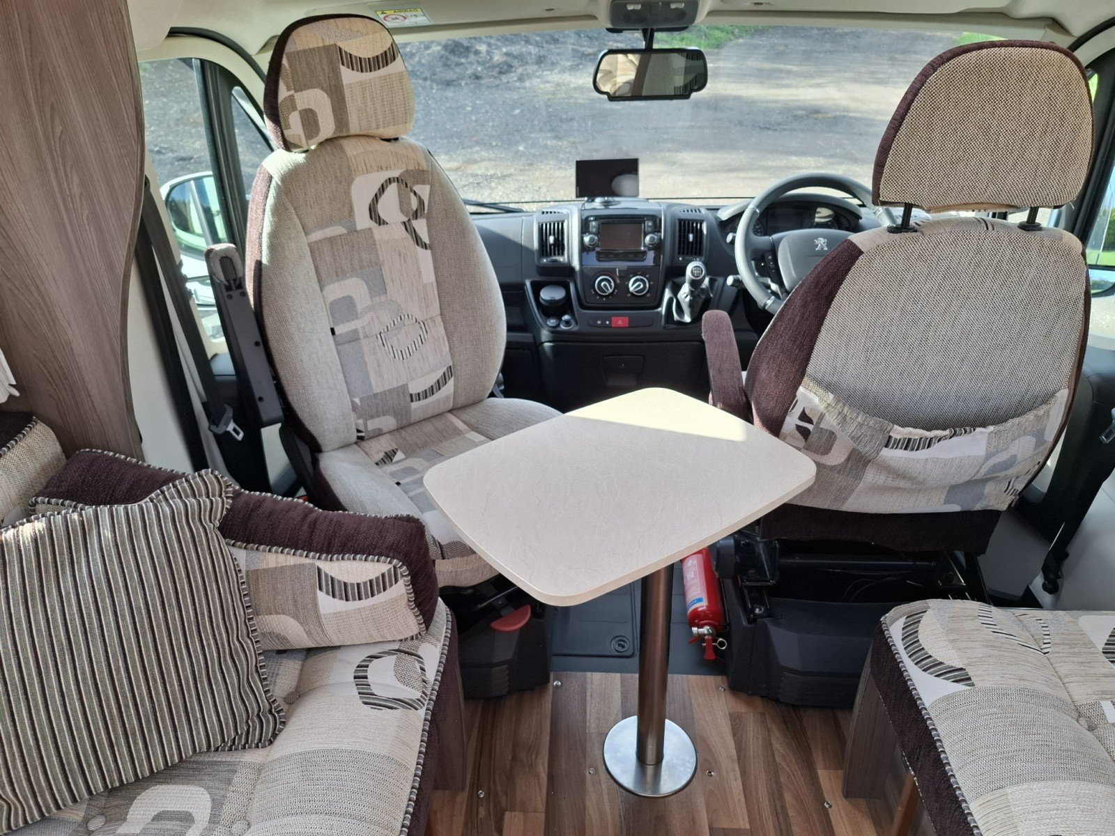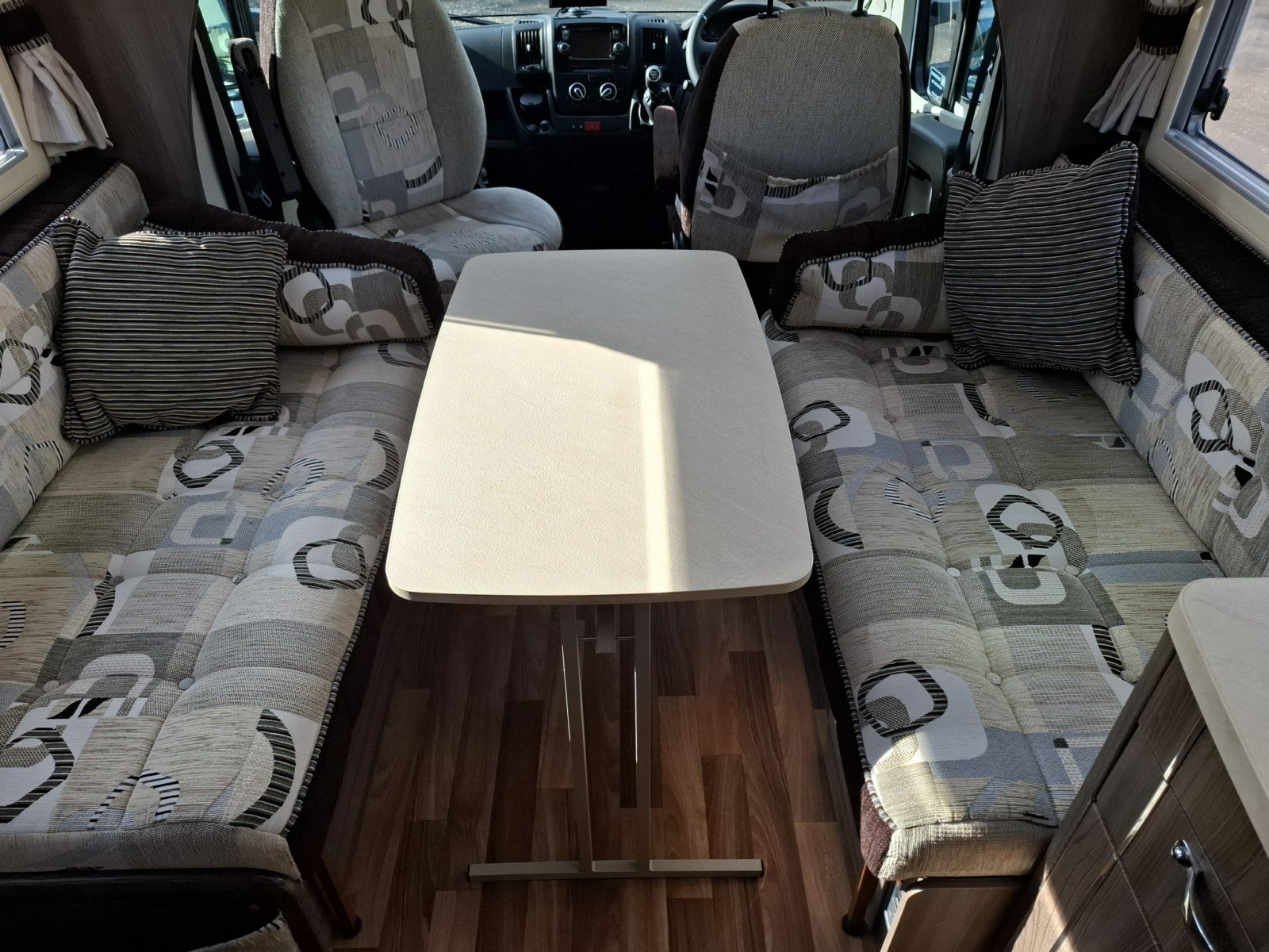 Behind the cab is a spacious leisure and dining area with two opposing side sofas, which that can be enhanced by the use of the swivel passenger cab seat to create a more generous social space. There is a free-standing table, and the lounge area can easily be converted into a transverse double bed when required.
