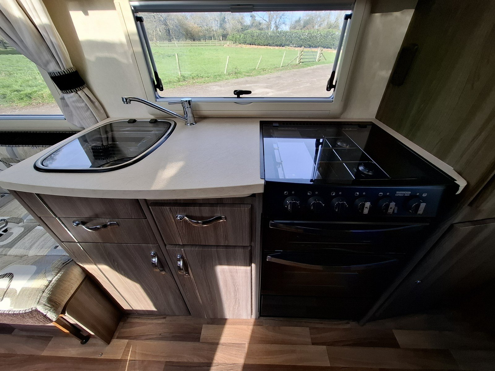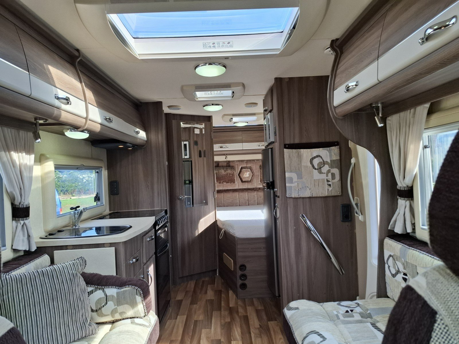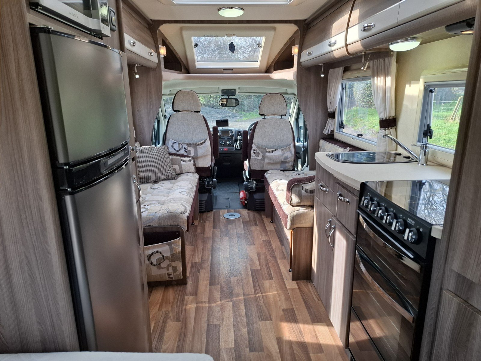 Moving further back, the centrally positioned kitchen is well equipped. On the offside, there is a hob with three gas burners and one electric hotplate, an extractor fan, sink, oven and grill. Opposite, you’ll find a microwave along with a full-size fridge and sperate freezer.