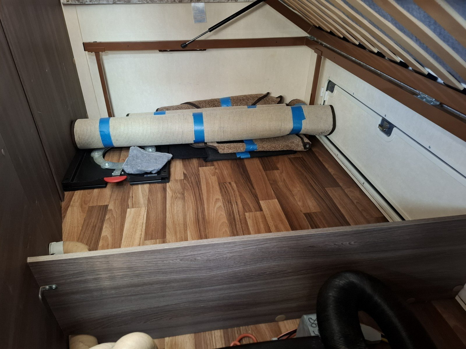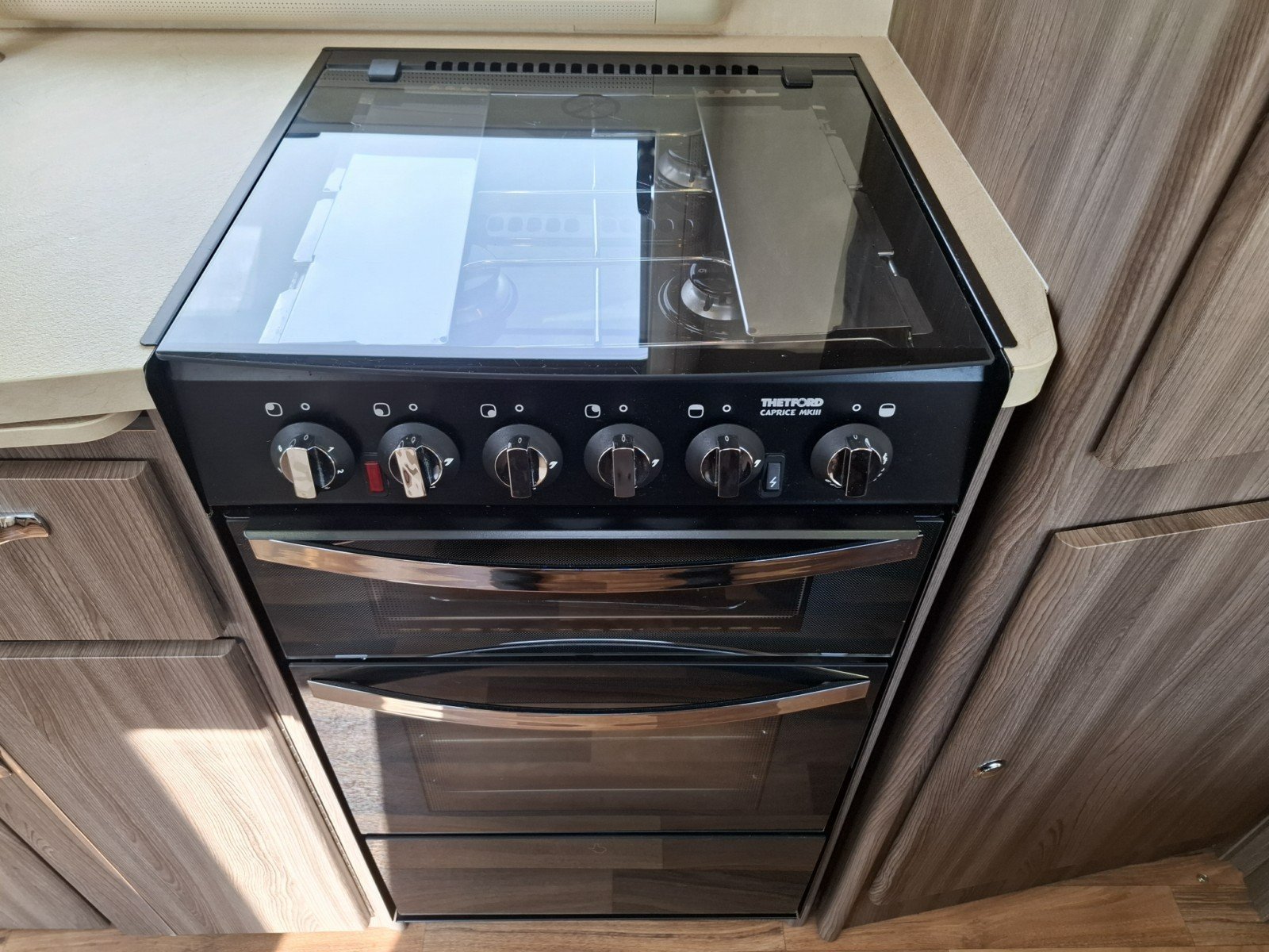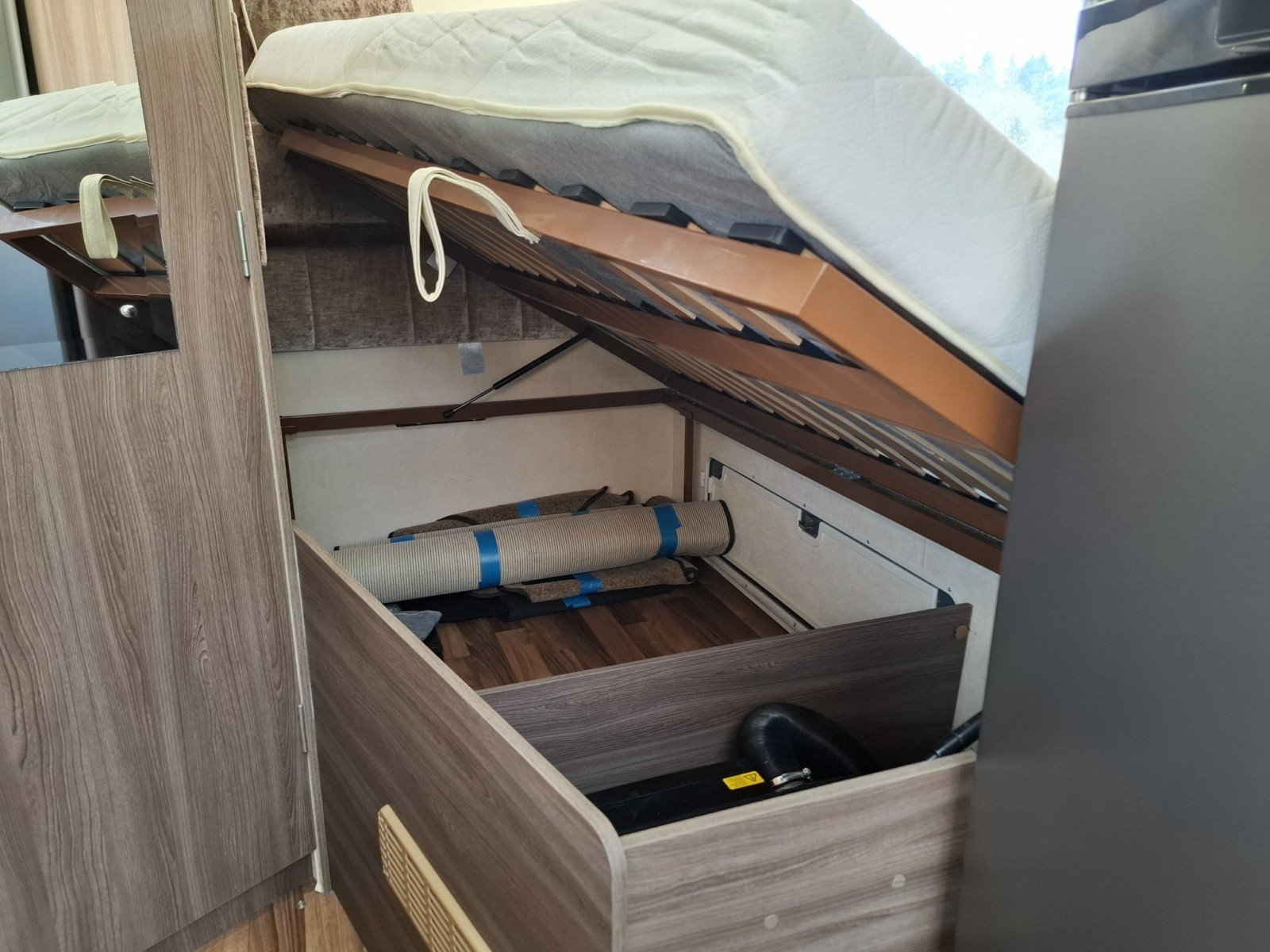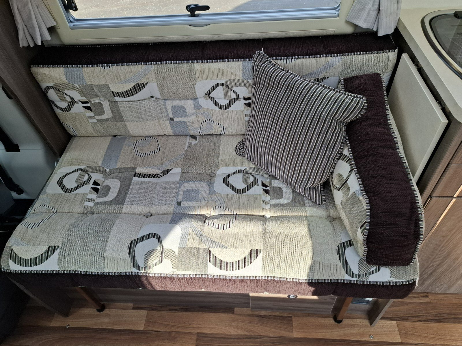 Moving further back, the centrally positioned kitchen is well equipped. On the offside, there is a hob with three gas burners and one electric hotplate, an extractor fan, sink, oven and grill. Opposite, you’ll find a microwave along with a full-size fridge and sperate freezer.