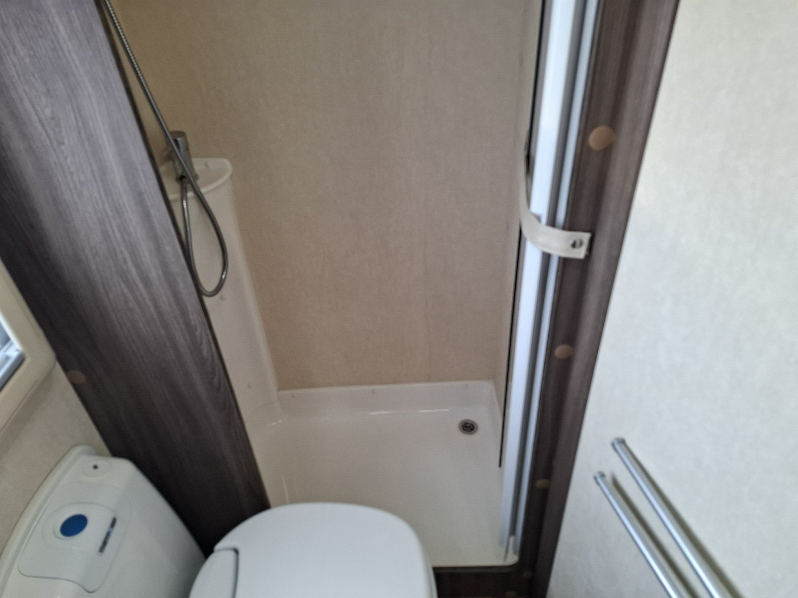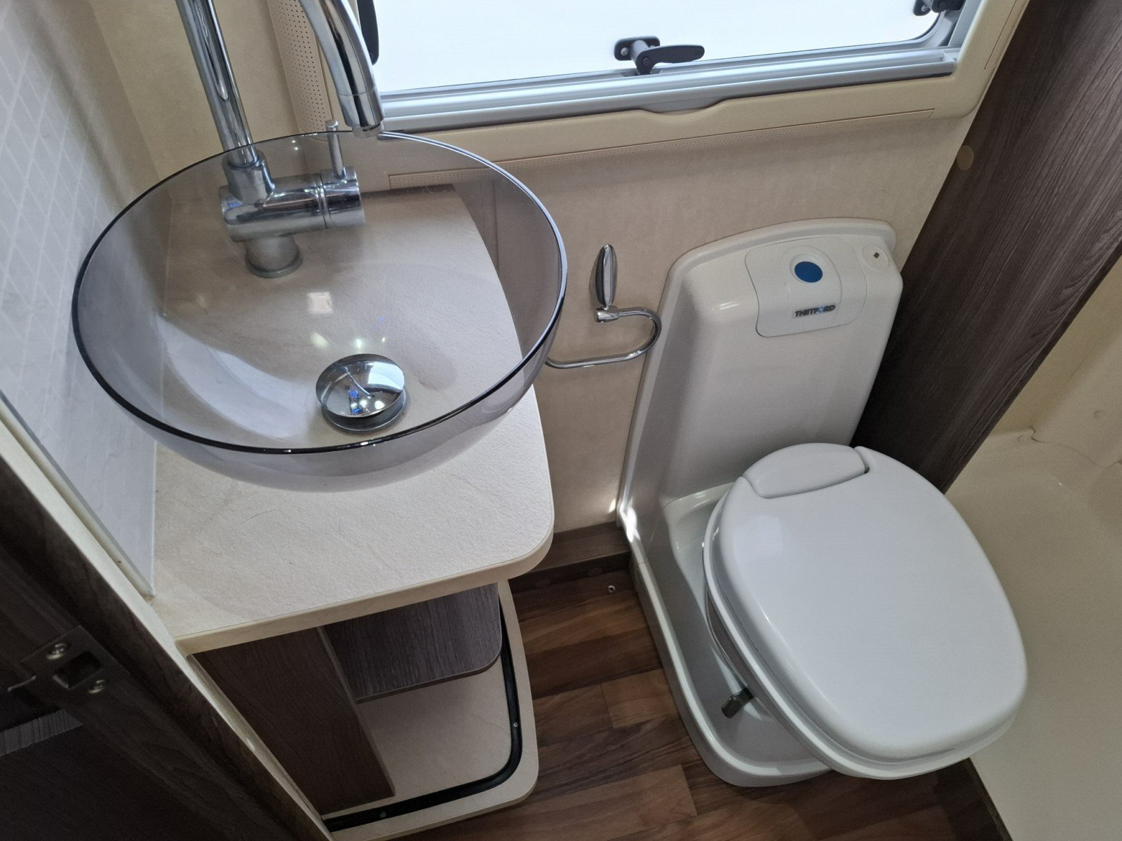 At the rear of the vehicle, there offside rear bathroom, which includes a toilet, hand basin, and a separate shower cubicle. On the nearside is a French bed. There is ample storage space available throughout the motorhome.