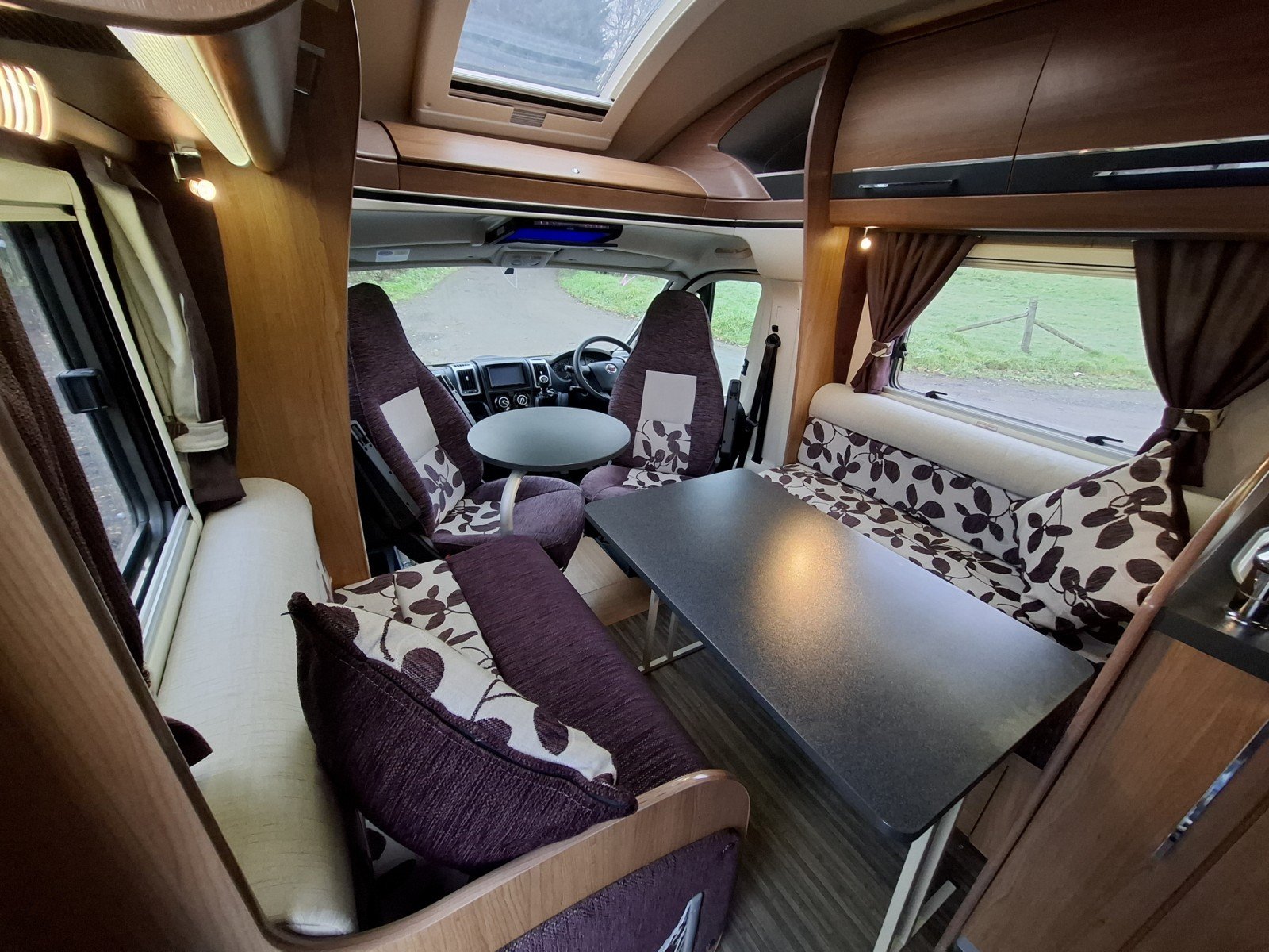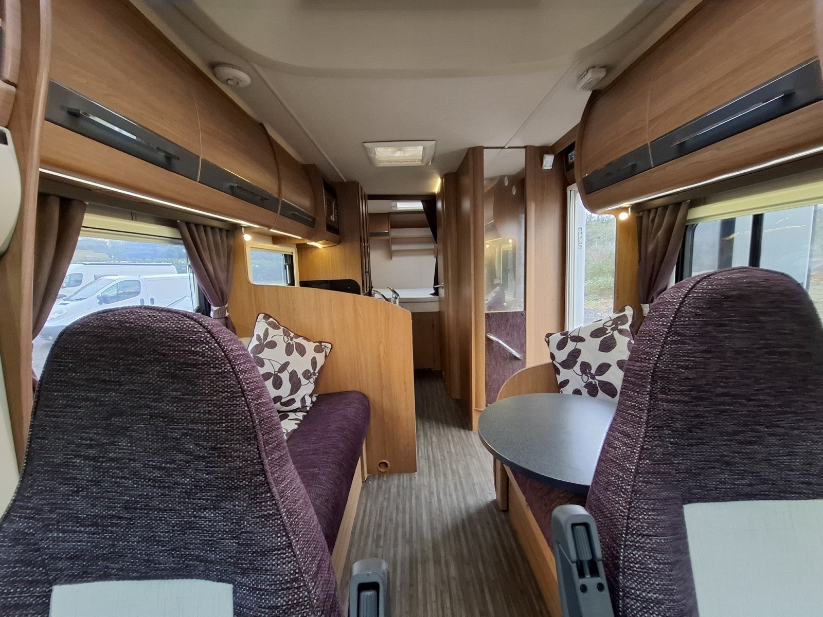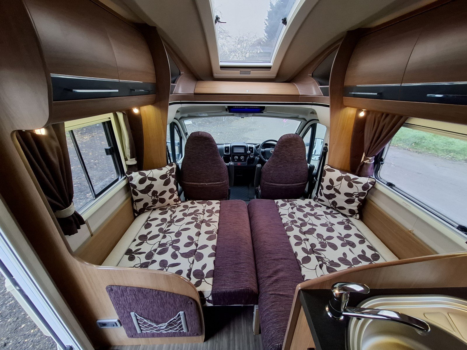 Behind the cab are two opposing side bench sofas. This light and airy leisure/dining area can be enhanced with the use of the swivel cab seats, and a choice of a circular coffee table, or a larger free-standing table. The sofas can be readily converted into a double berth.