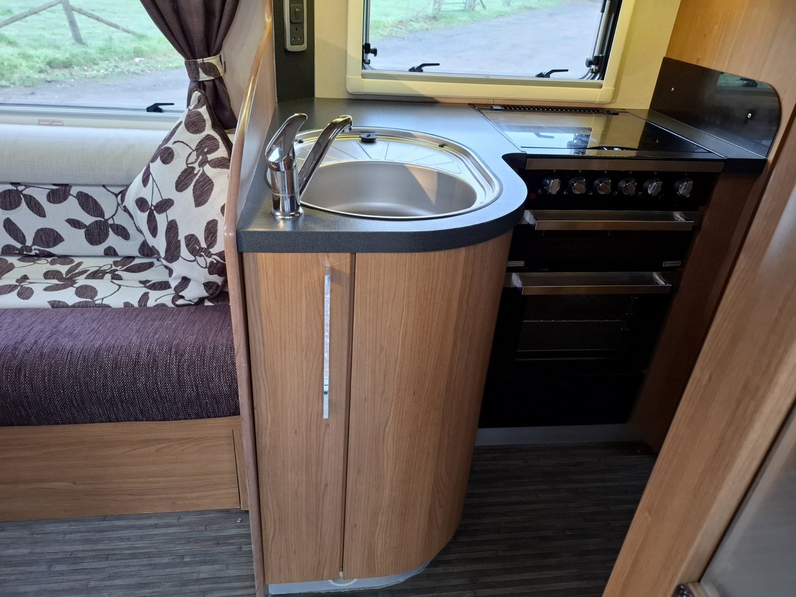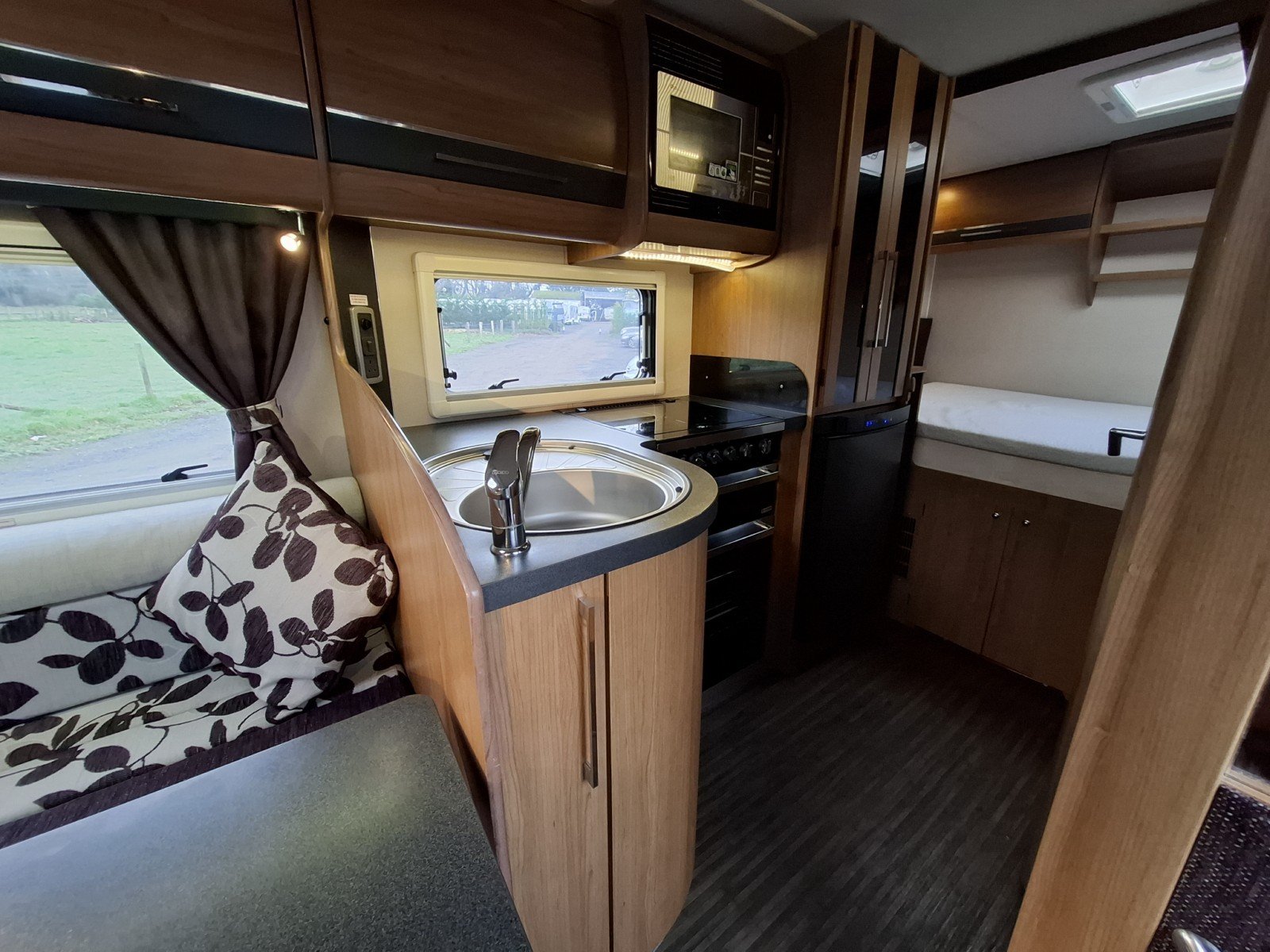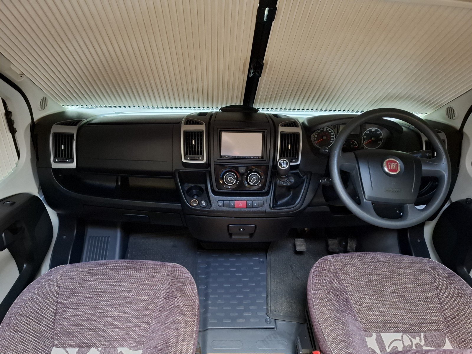 Behind the cab are two opposing side bench sofas. This light and airy leisure/dining area can be enhanced with the use of the swivel cab seats, and a choice of a circular coffee table, or a larger free-standing table. The sofas can be readily converted into a double berth.