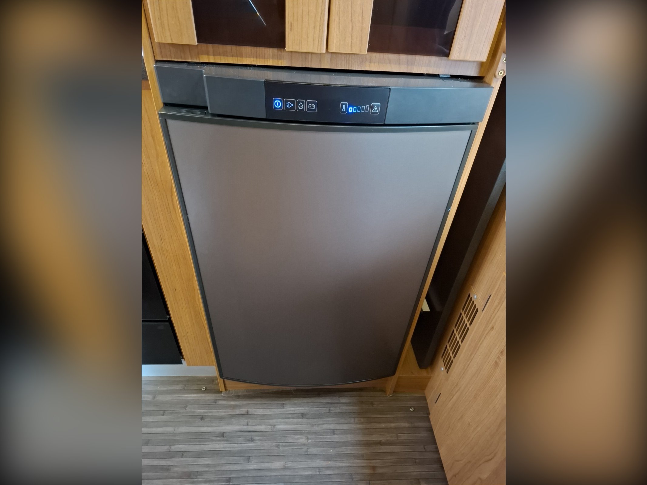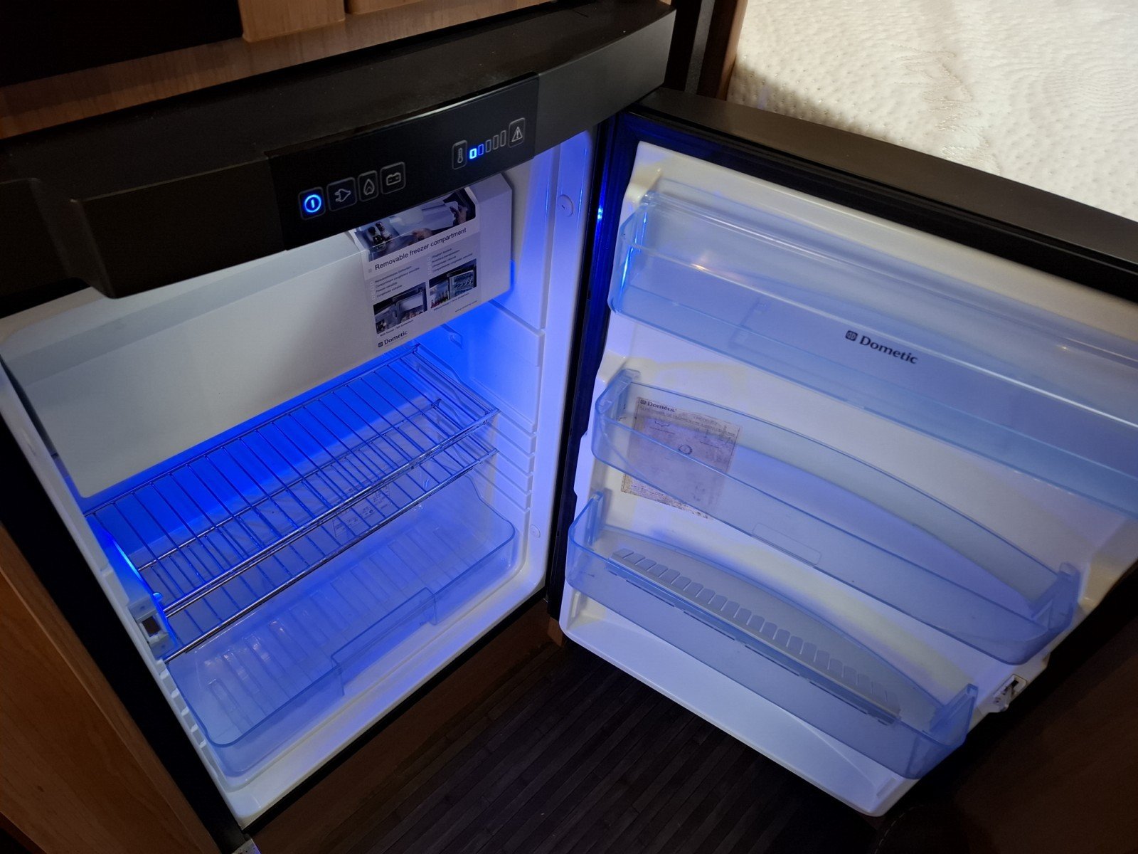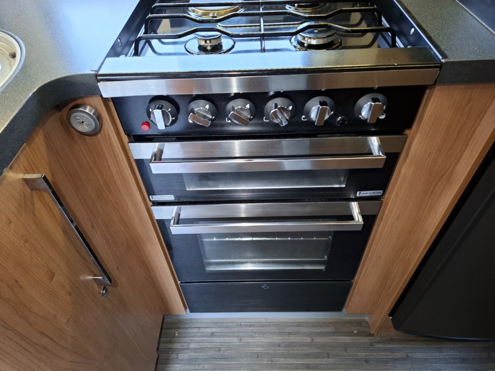 Conveniently adjacent for the storage and preparation of food, the offside central kitchen features a hob with 3 gas burners and an electric plate, an oven, a grill, a microwave, a fridge with a freezer box, and a sink.