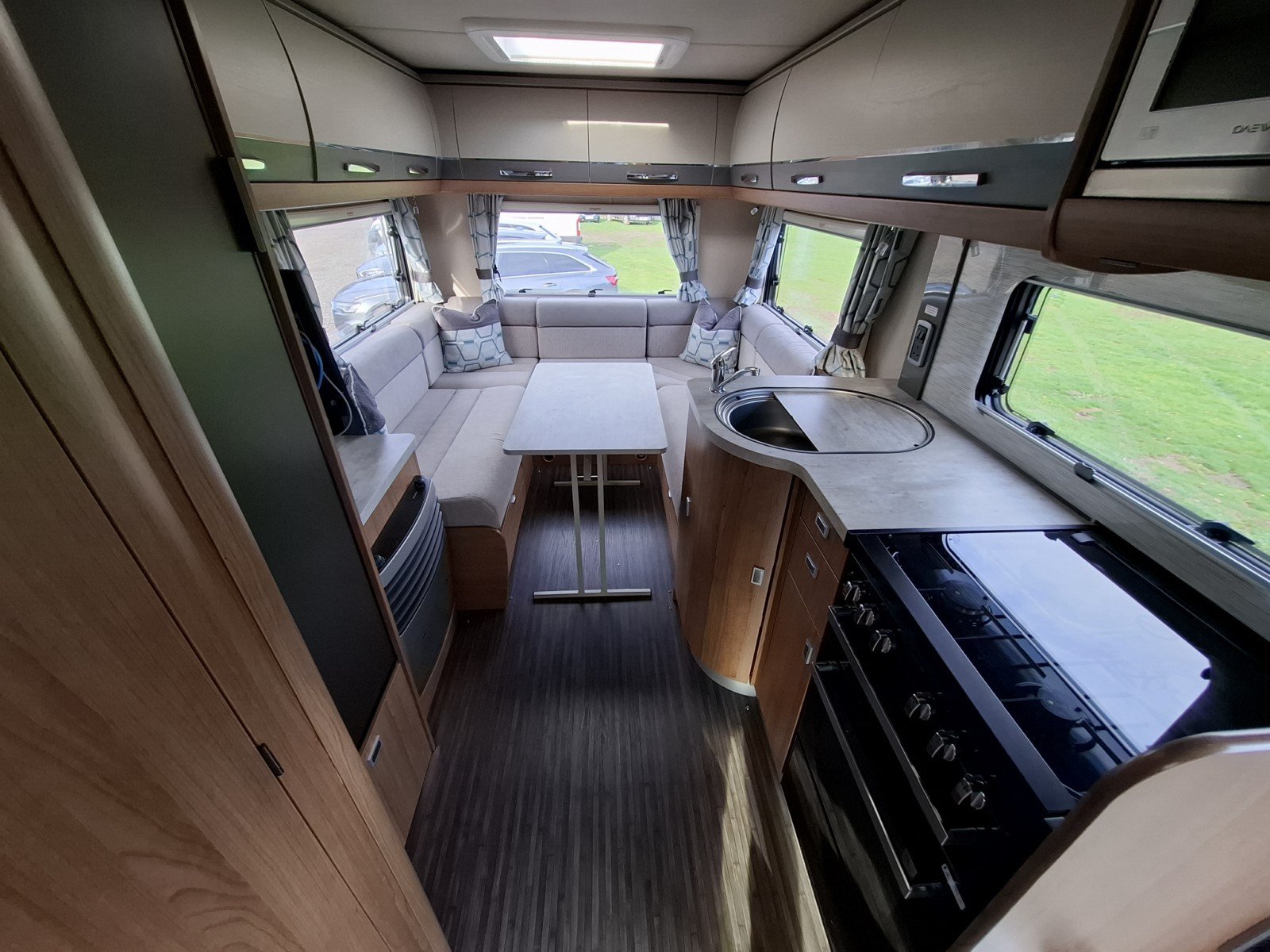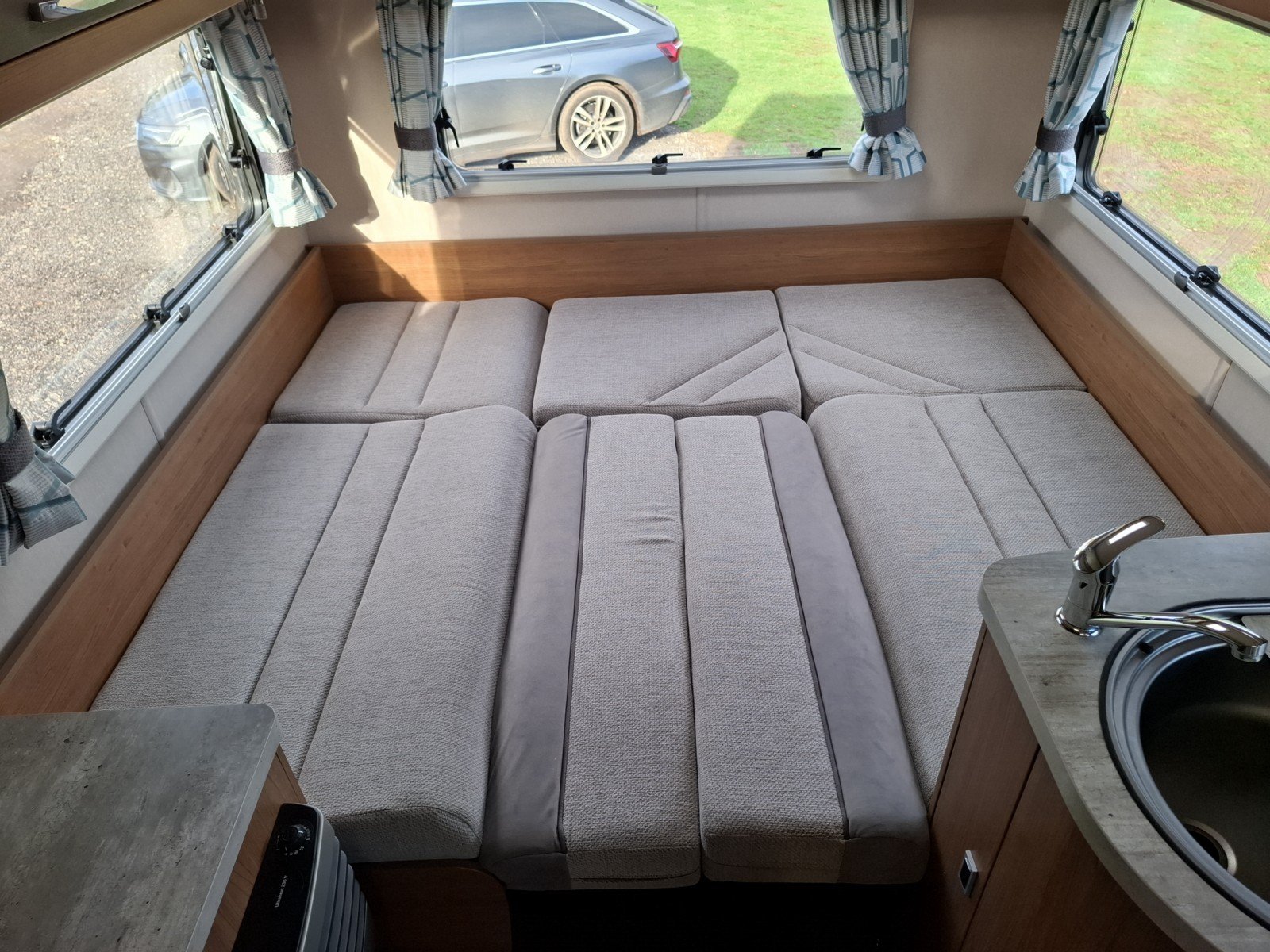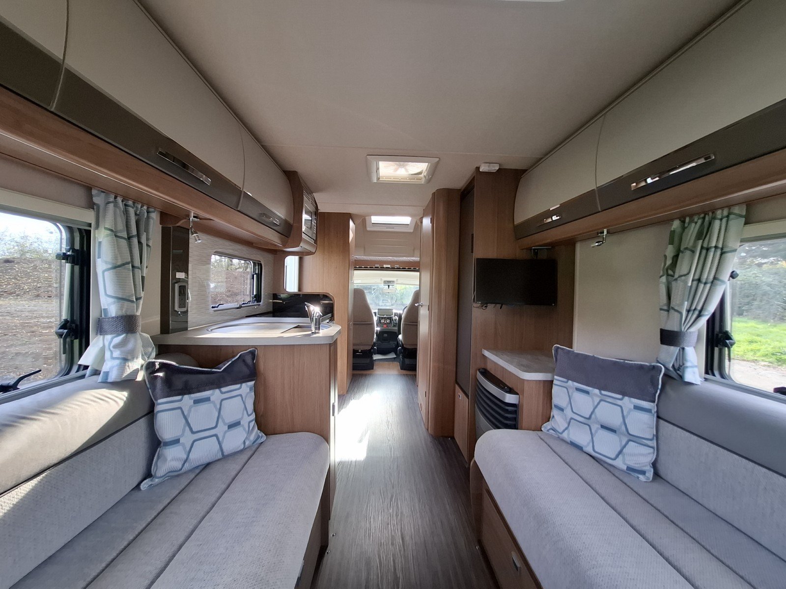 At the rear of the vehicle is the large U-shaped lounge, which benefits from plentiful natural lighting. This area can be readily converted into a transverse double berth.