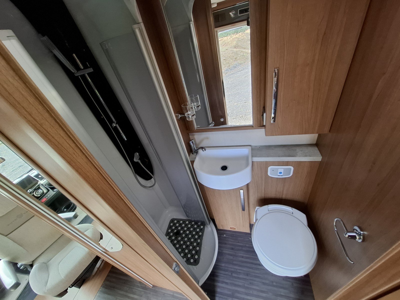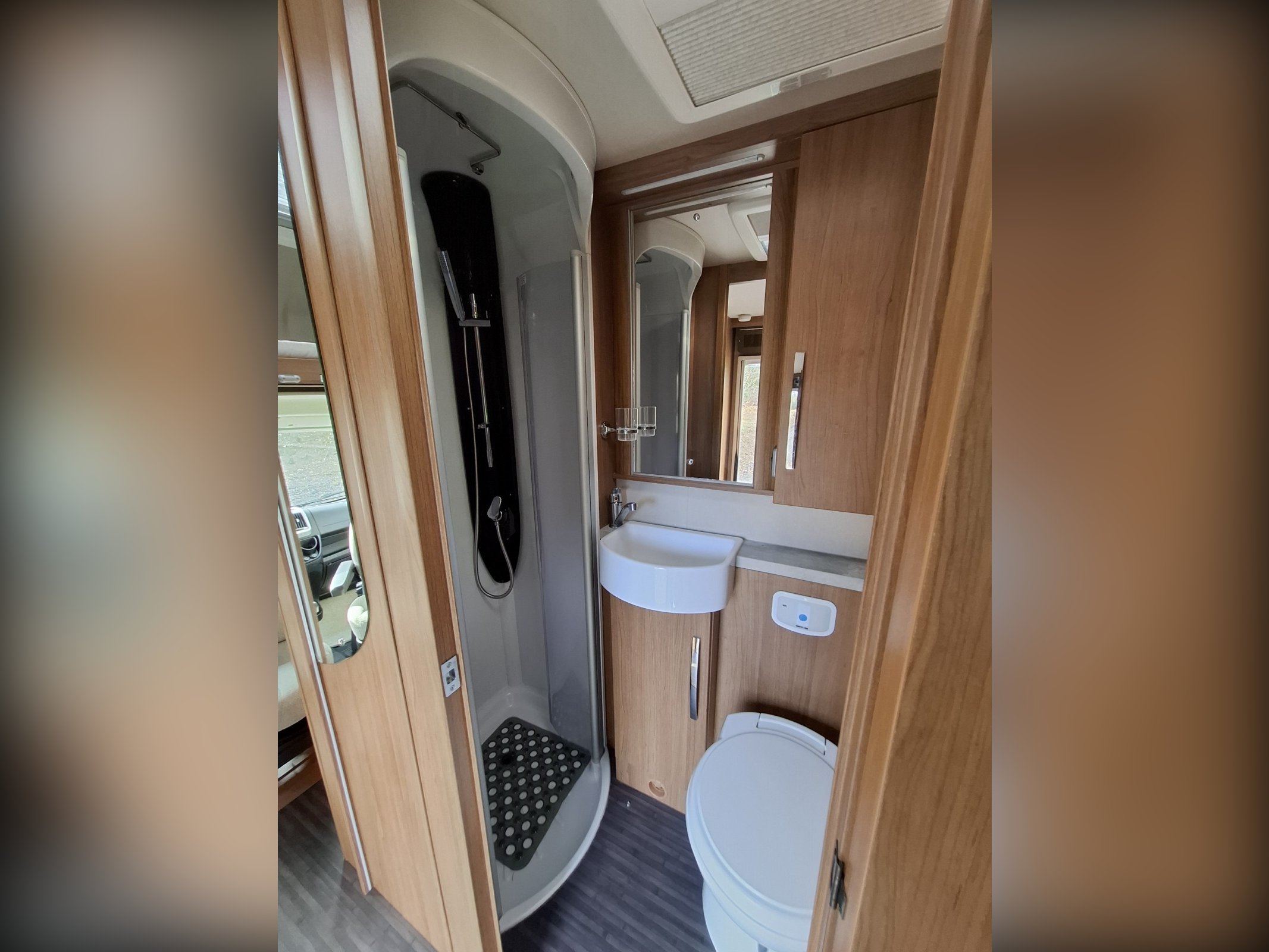 The forward habitation features a nearside wardrobe unit followed by the habitation door. Opposite is the offside washroom with a toilet a hand basin and a screened shower cubicle.