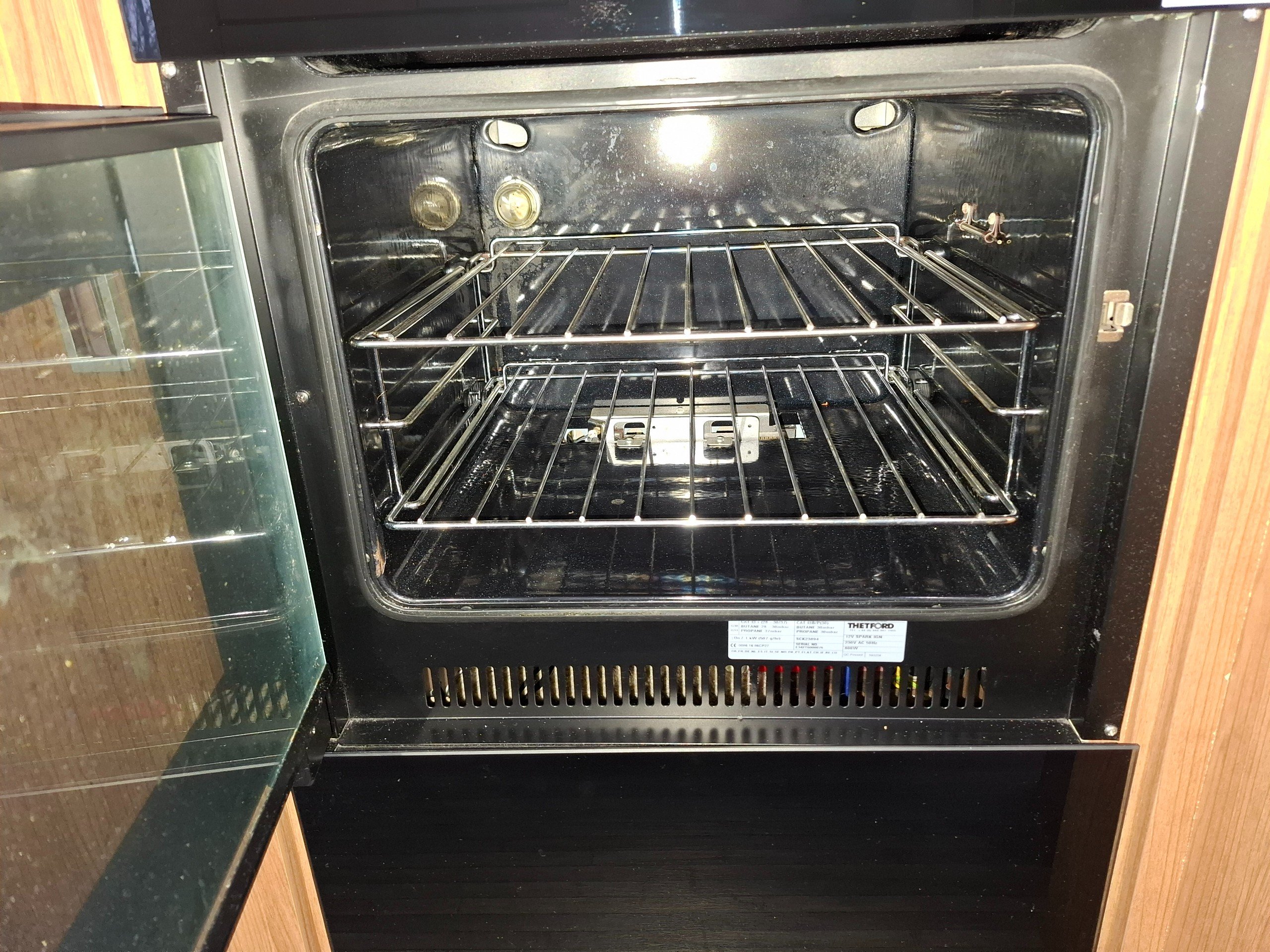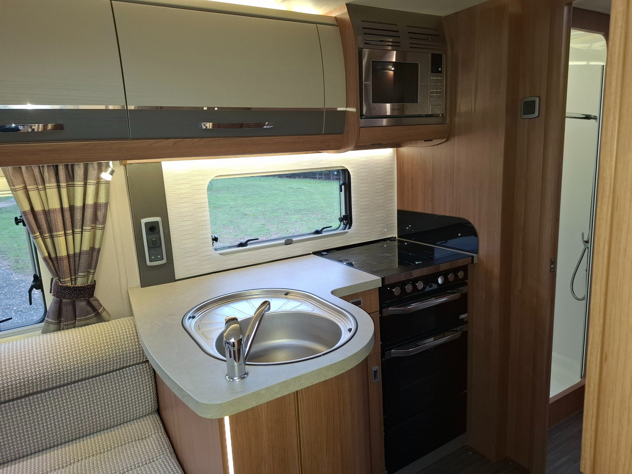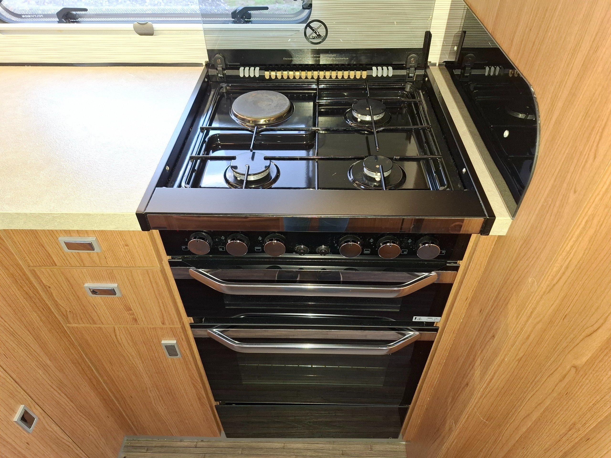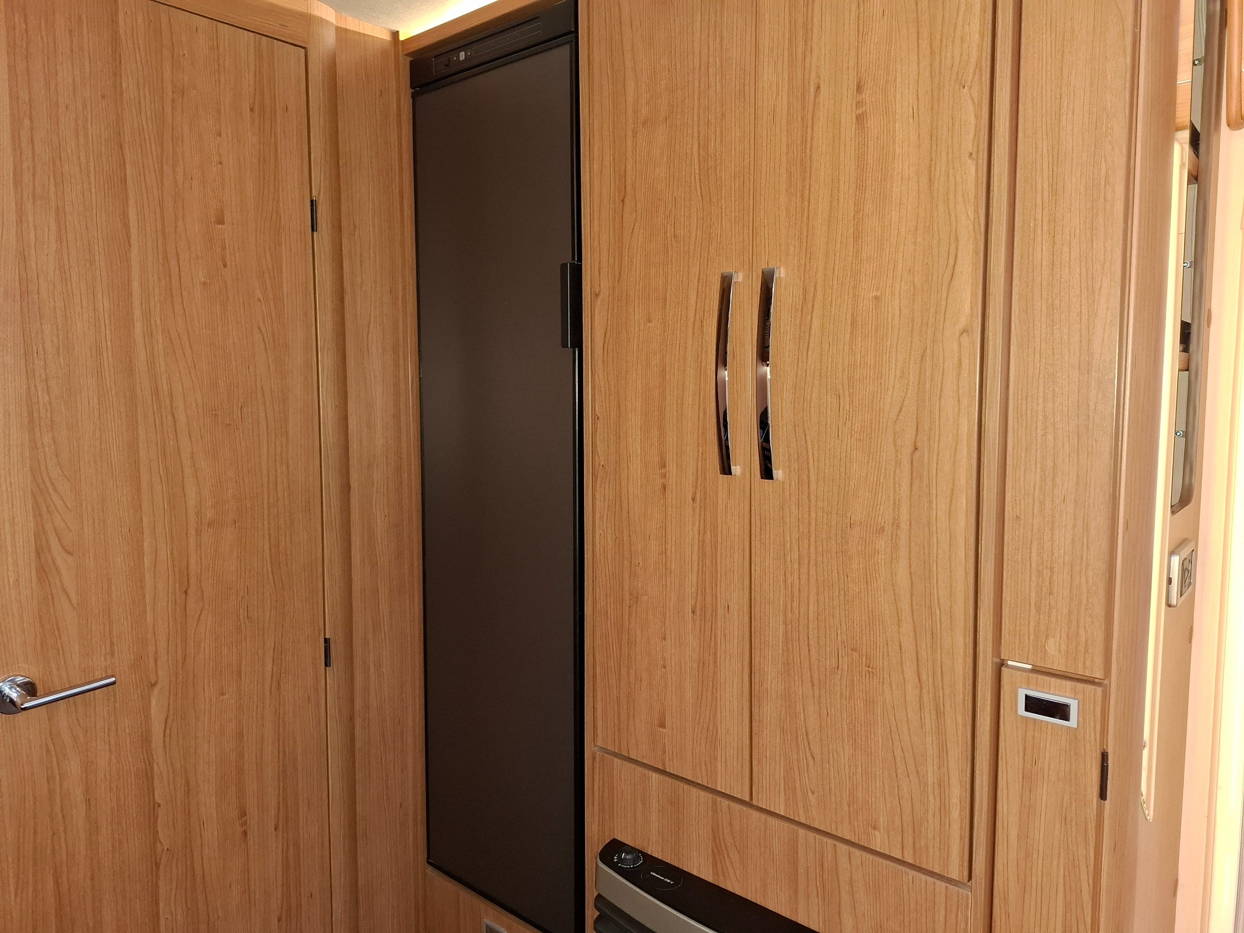 There is an offside central kitchen, comprising a hob with three gas burners and an electric plate, an oven, a grill, a microwave, a sink, and, opposite, a fridge with a freezer box which is adjacent to the space heater and a wardrobe by the nearside habitation door.