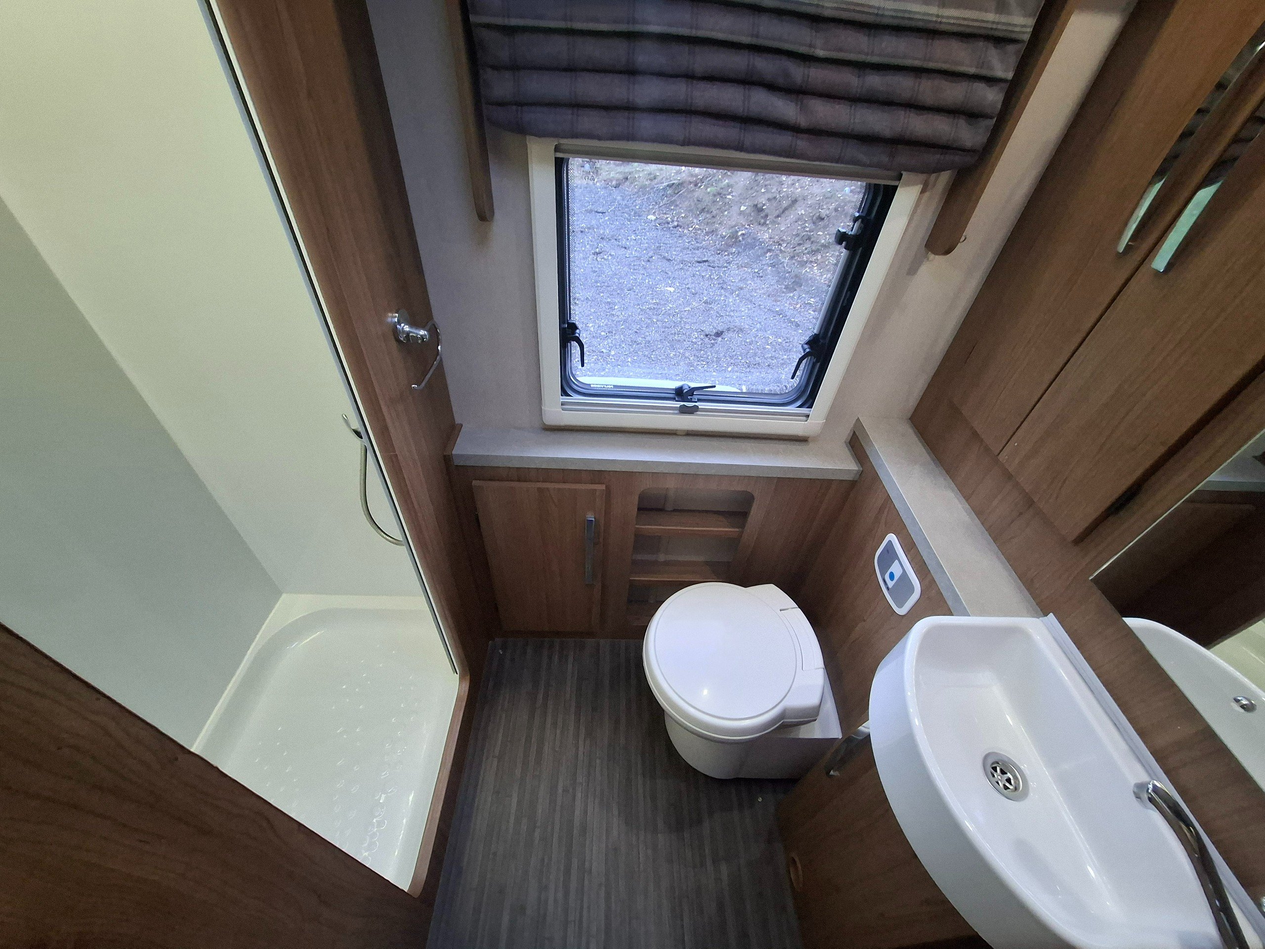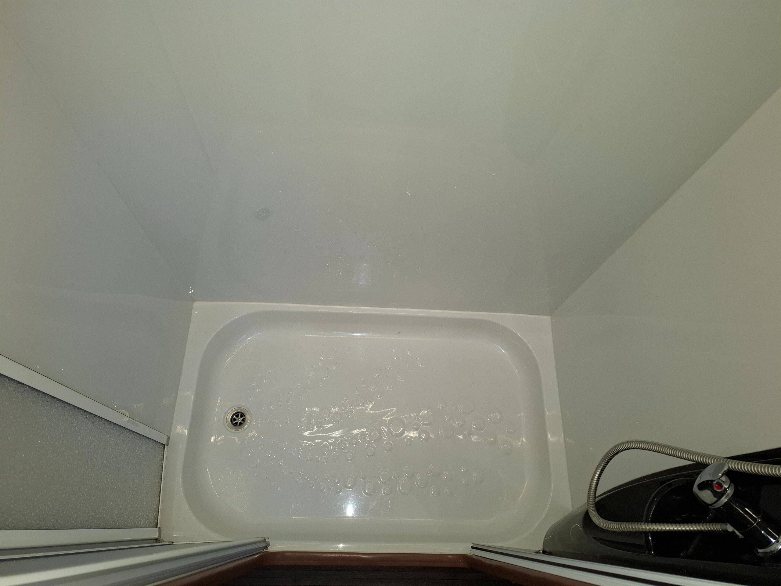 Across the rear the vehicle is a bathroom with a toilet, a hand basin, and a screened shower cubicle.