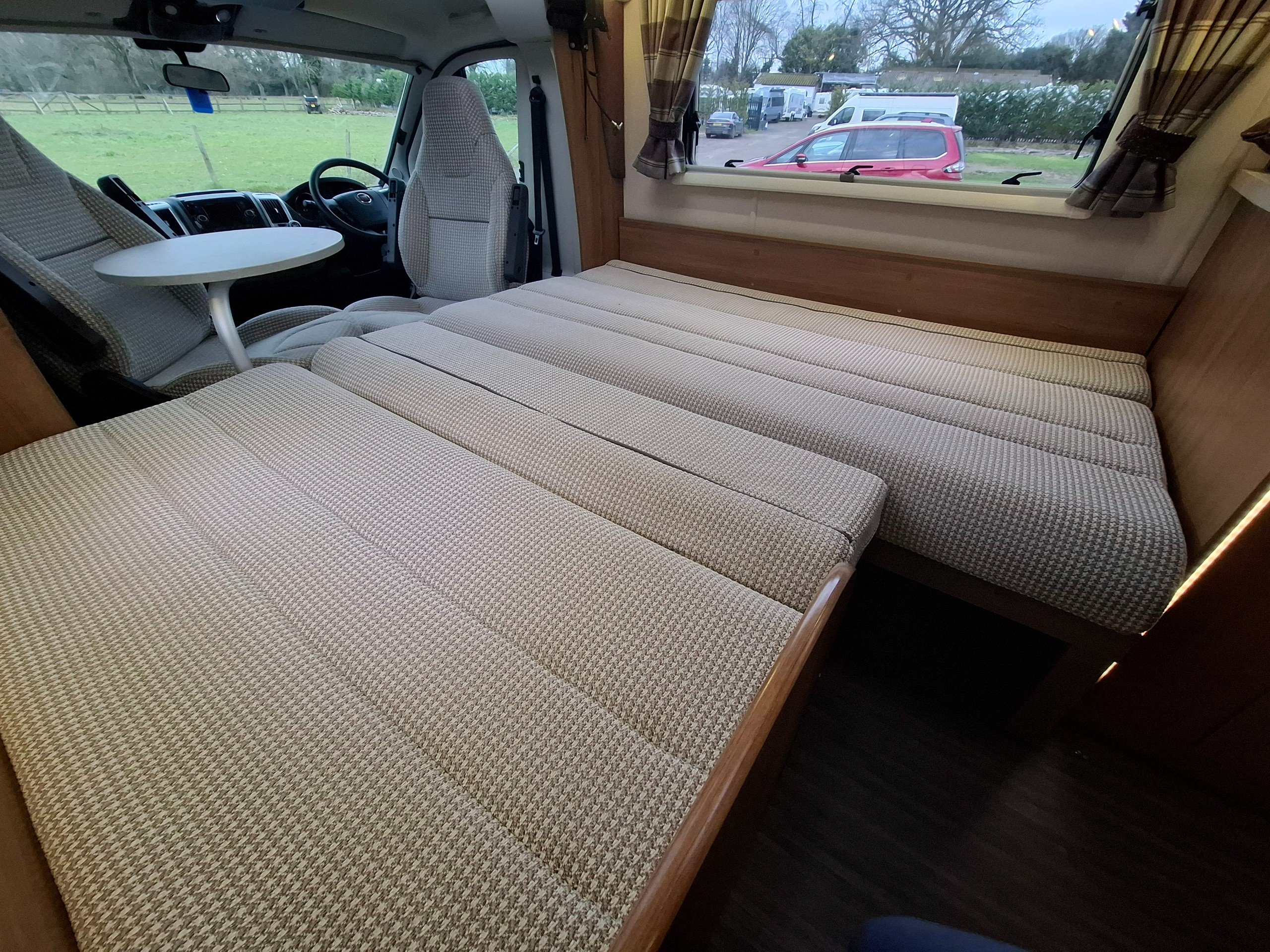 Behind the cab are two opposing side bench sofas. This leisure/dining area can be enhanced with the use of the swivel cab seats and a free-standing table (or the small circular coffee table). The sofas can be readily converted into a transverse double berth.