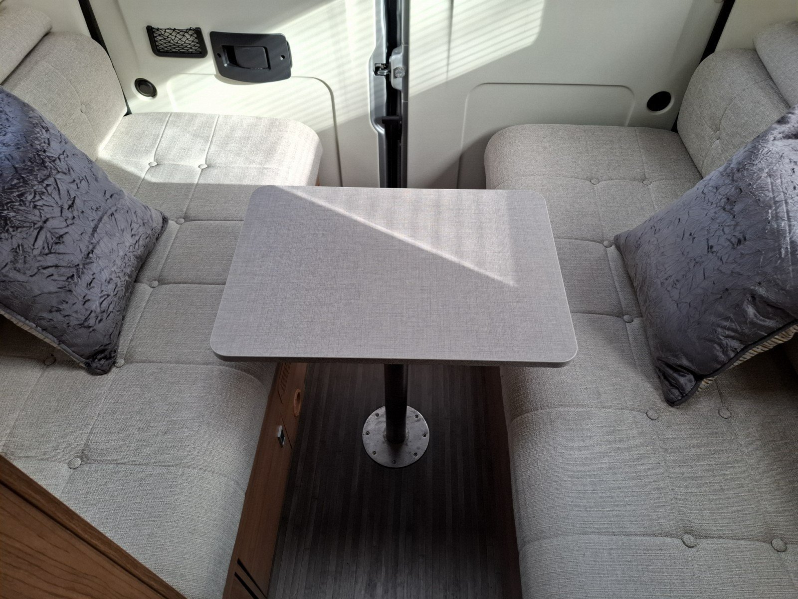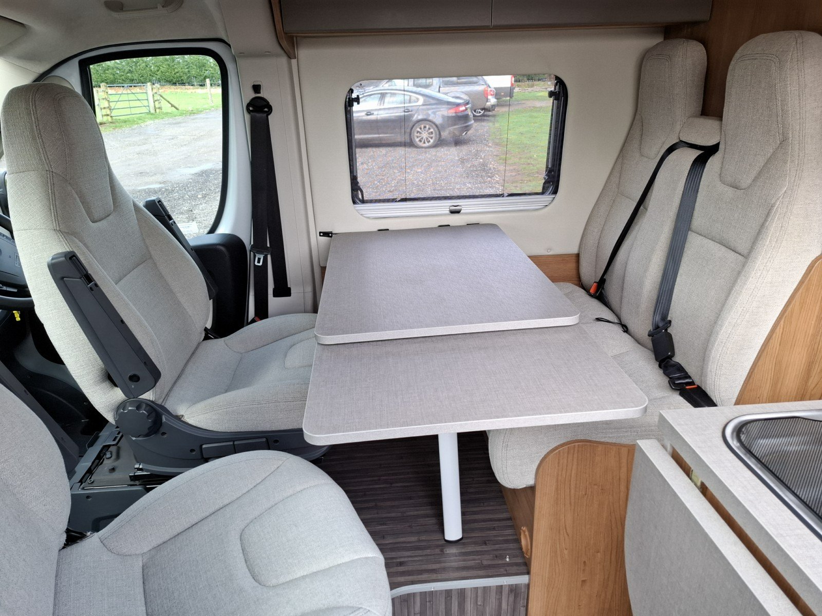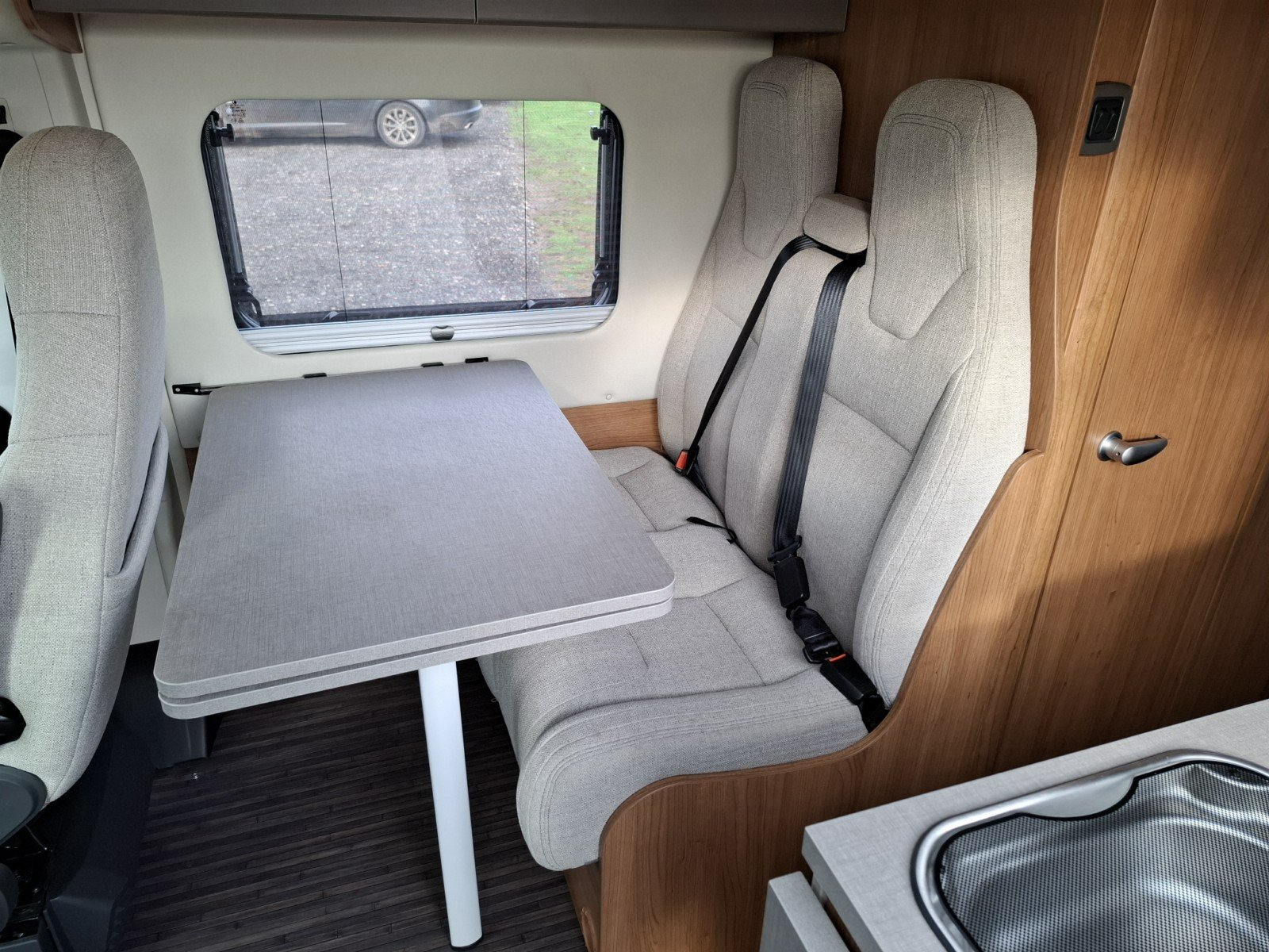Opposite the nearside side door is a forward facing half dinette (with two additional seat belts). This can be enhanced as a leisure/dining area by extending the table and rotating the swivel cab seats.