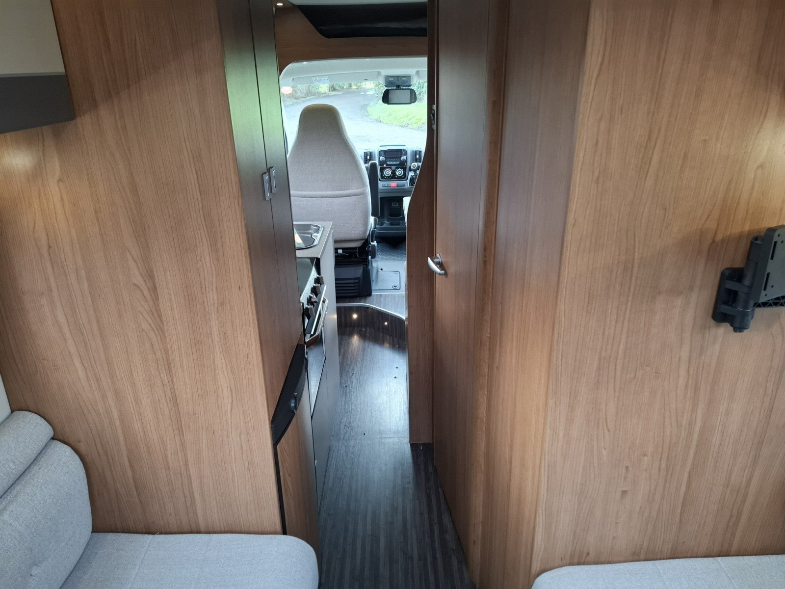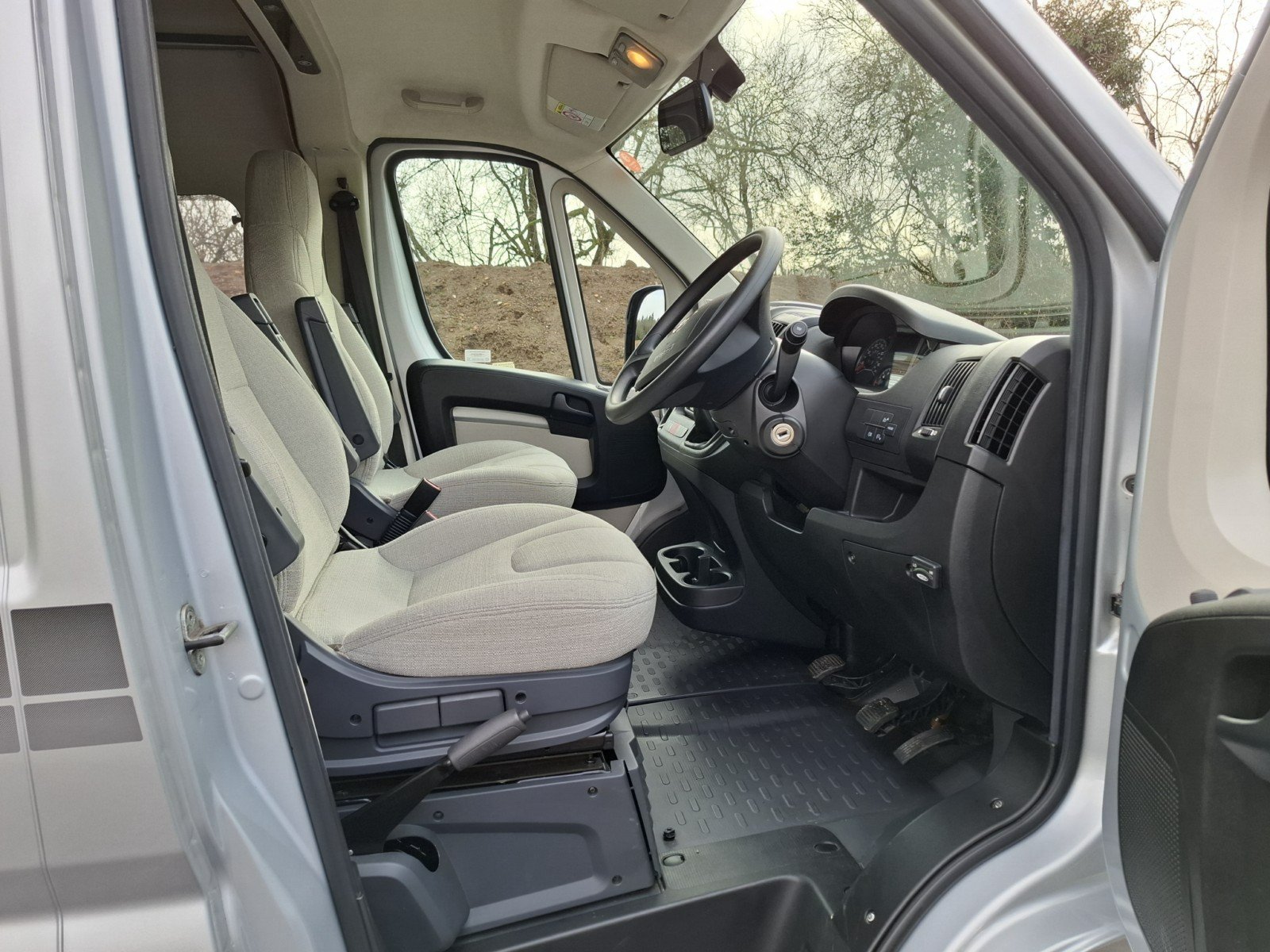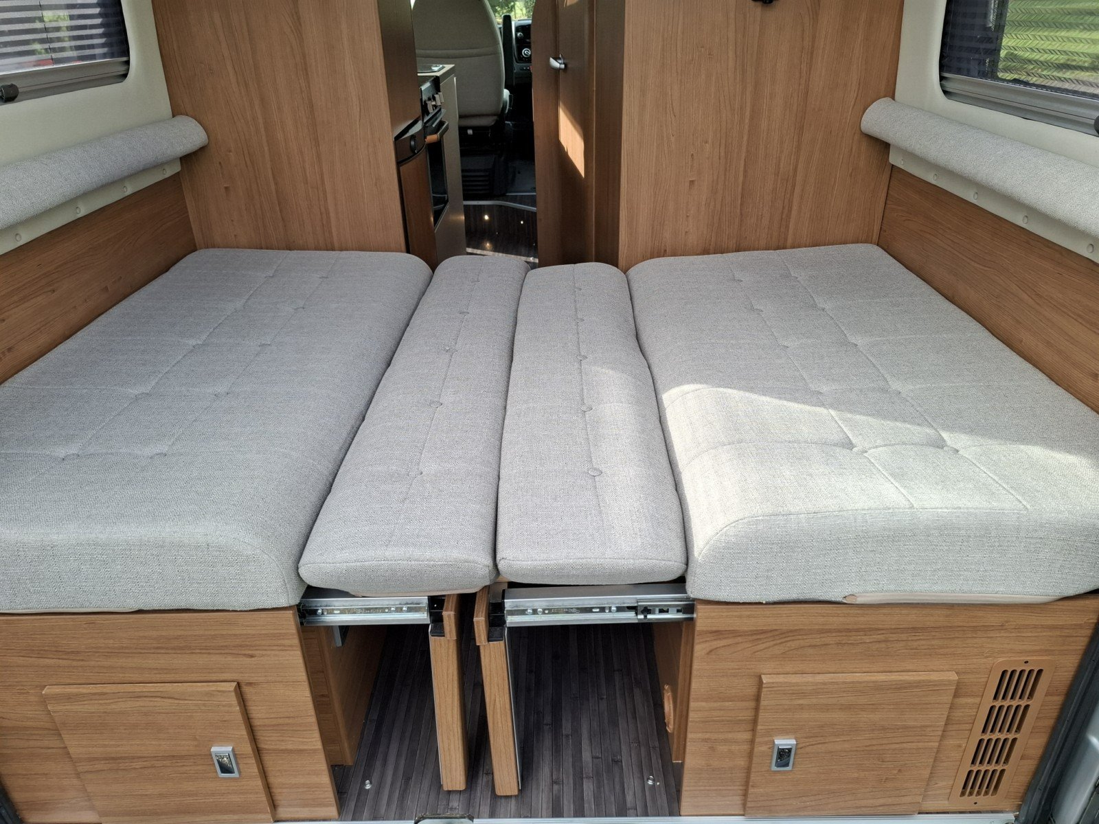 Opposite the nearside side door is a forward facing half dinette (with two additional seat belts). This can be enhanced as a leisure/dining area by extending the table and rotating the swivel cab seats.