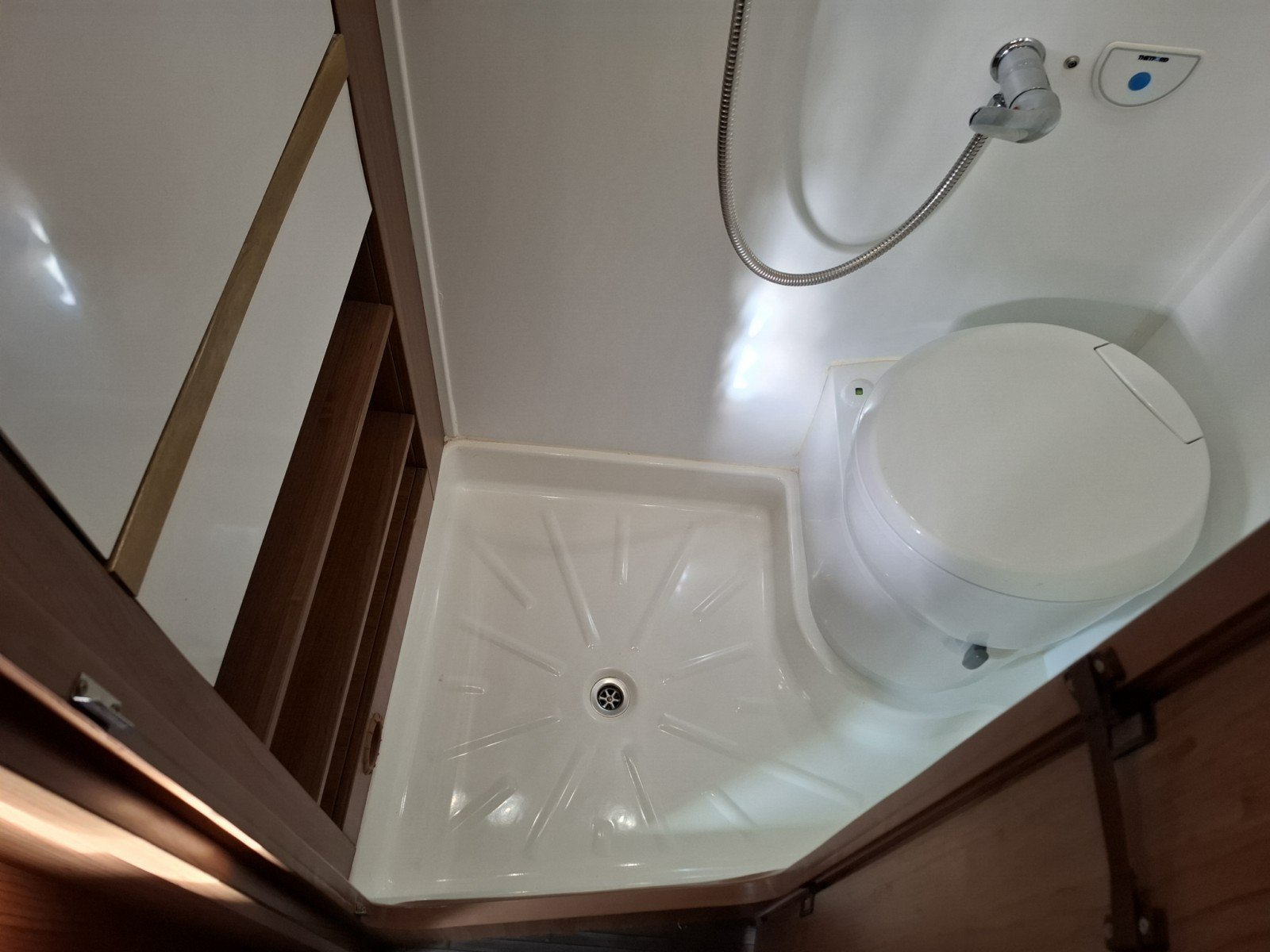 Opposite there is the wet room which has a toilet, a fold down hand basin, and a shower.