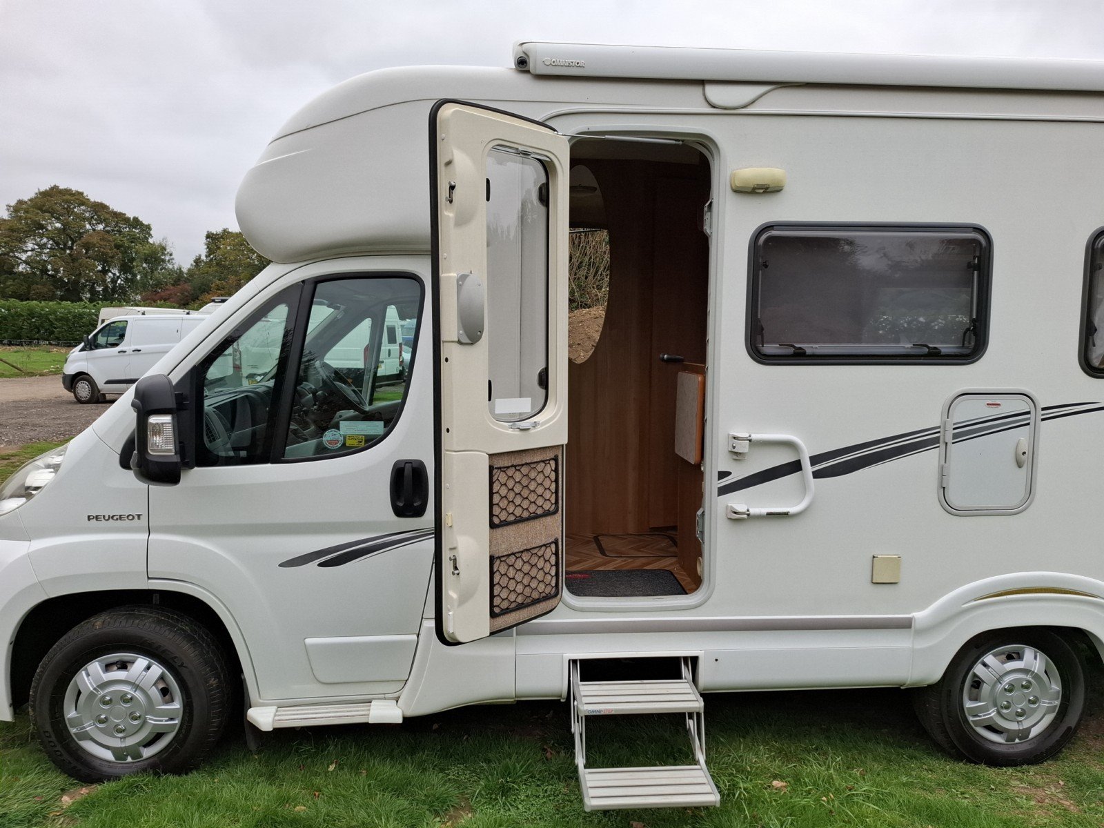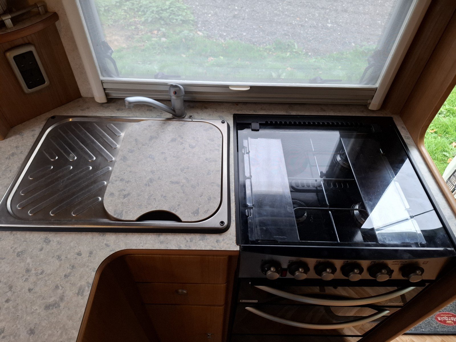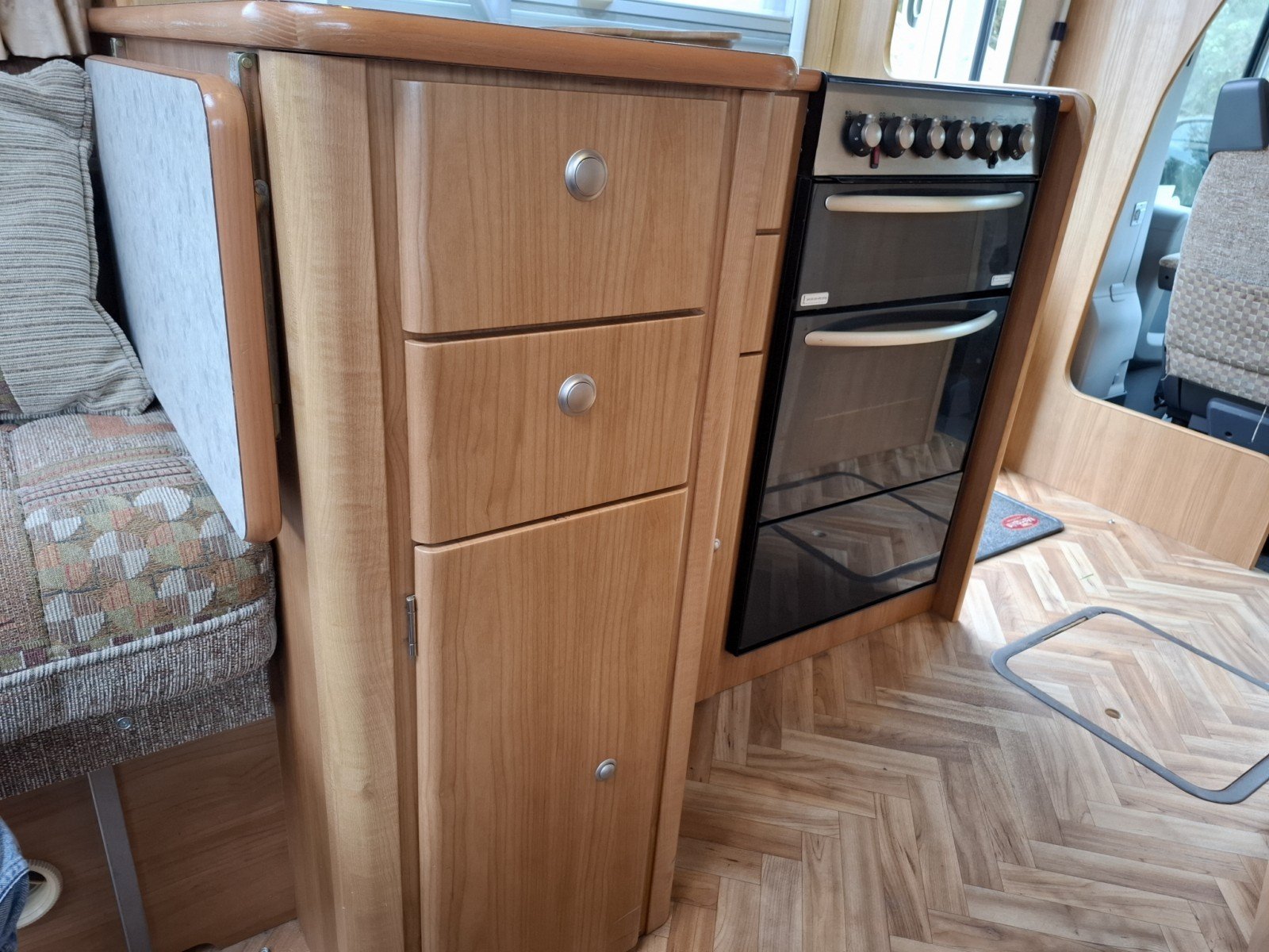 Beyond the nearside habitation door, this motorhome features a central kitchen with a hob with 3 gas burners and an electric plate, an extractor fan, an oven, a grill, and a sink.