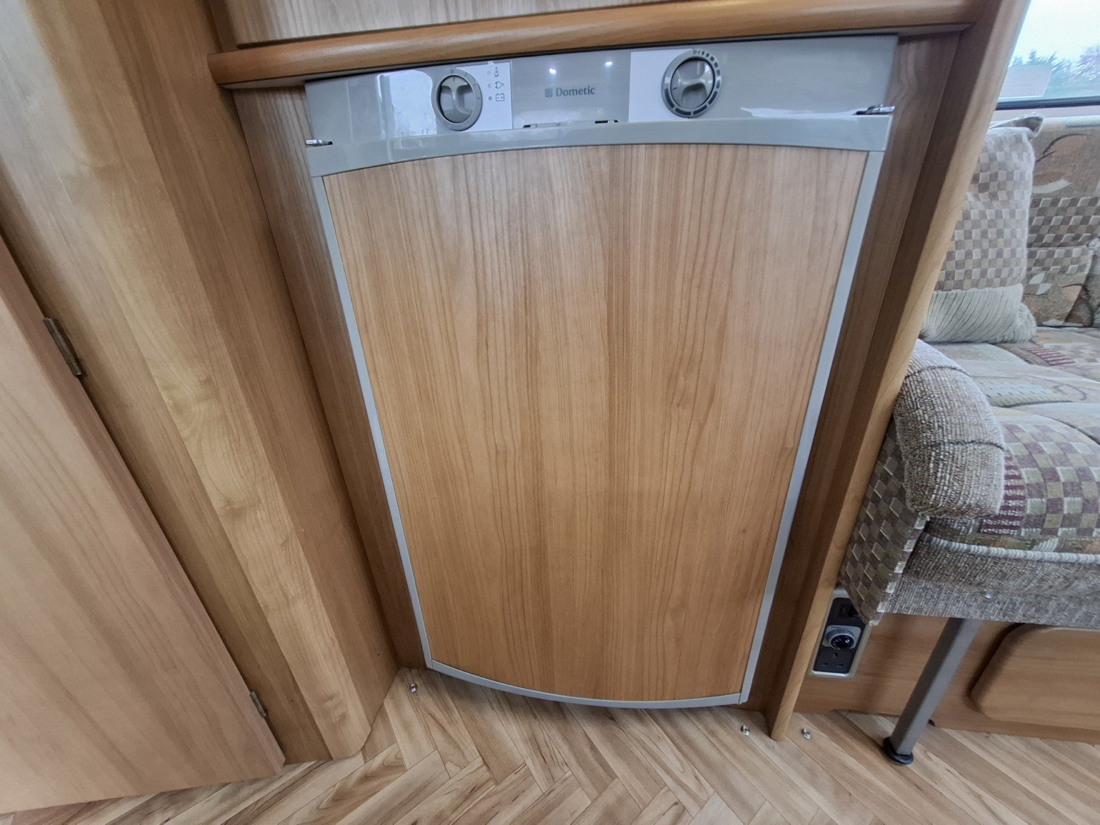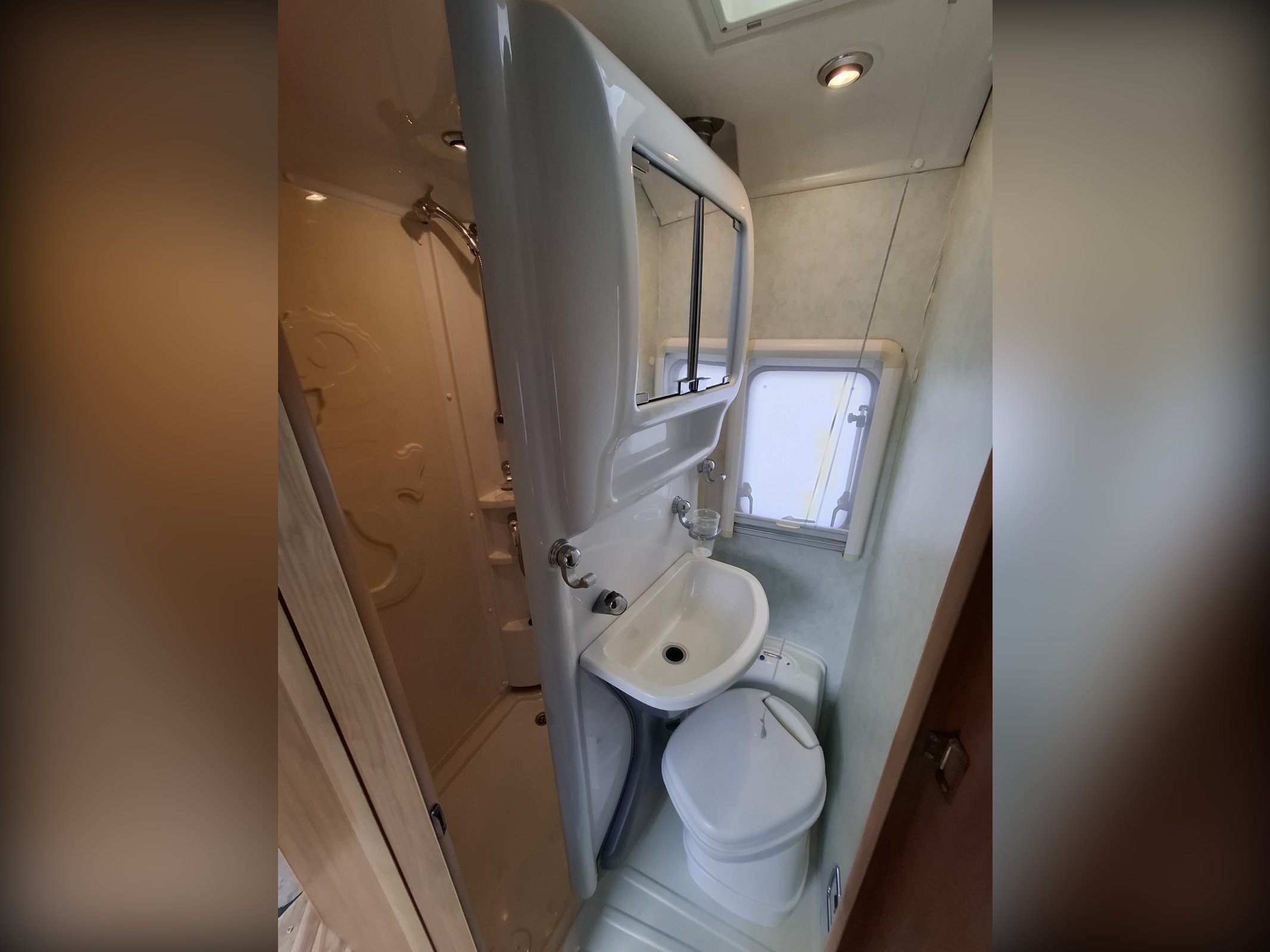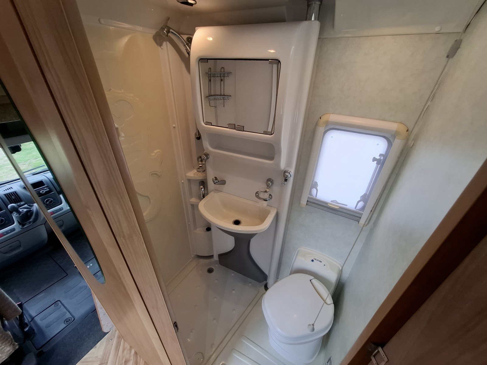 A fridge with a freezer box is opposite (below a large storage cupboard), which in turn is next to the offside wet room with a toilet, a hand basin, and a shower.