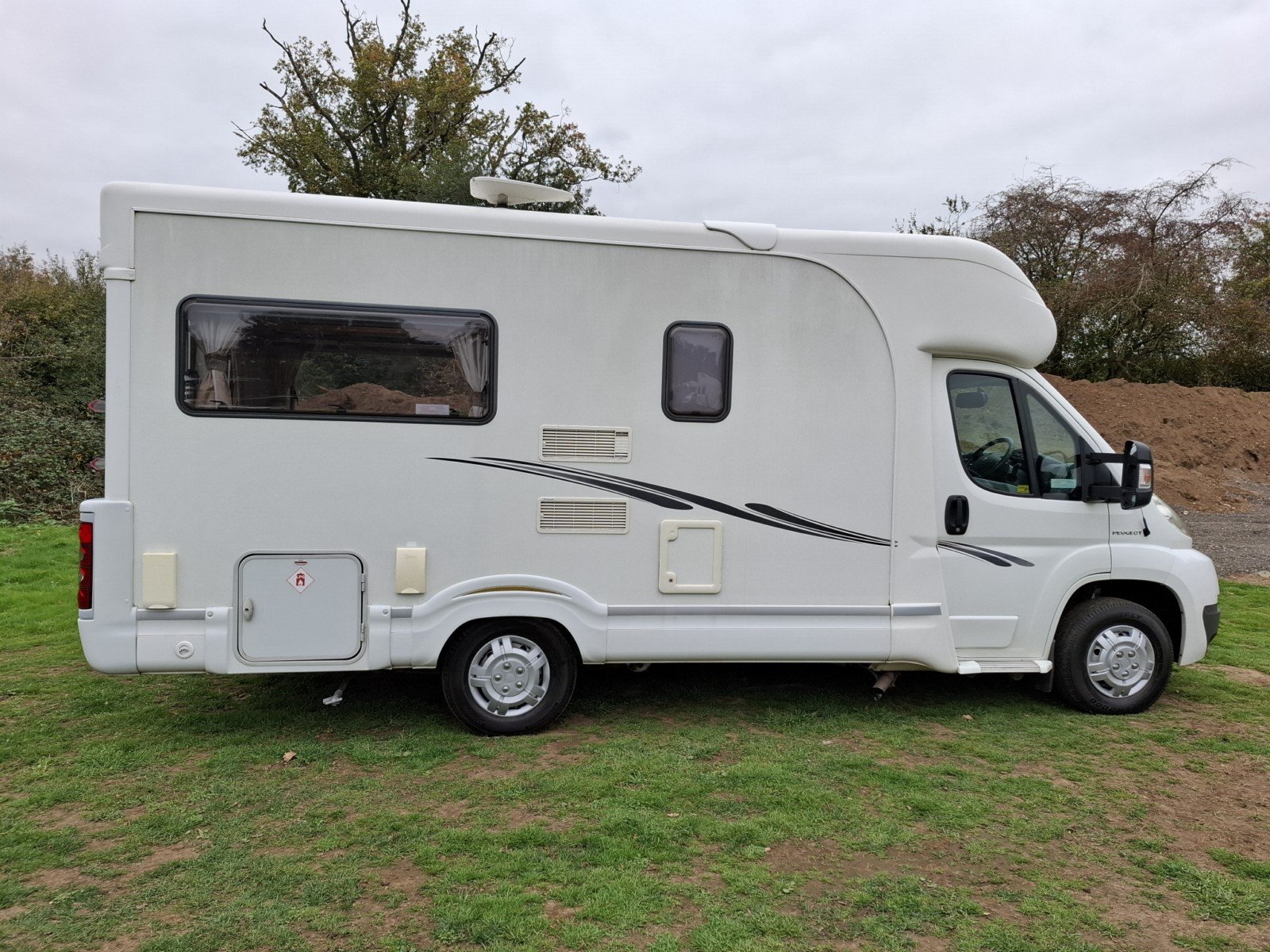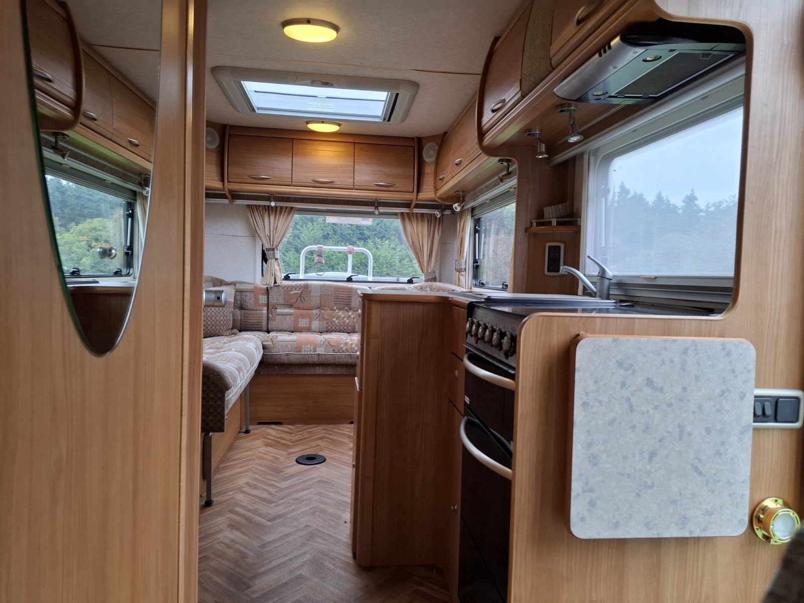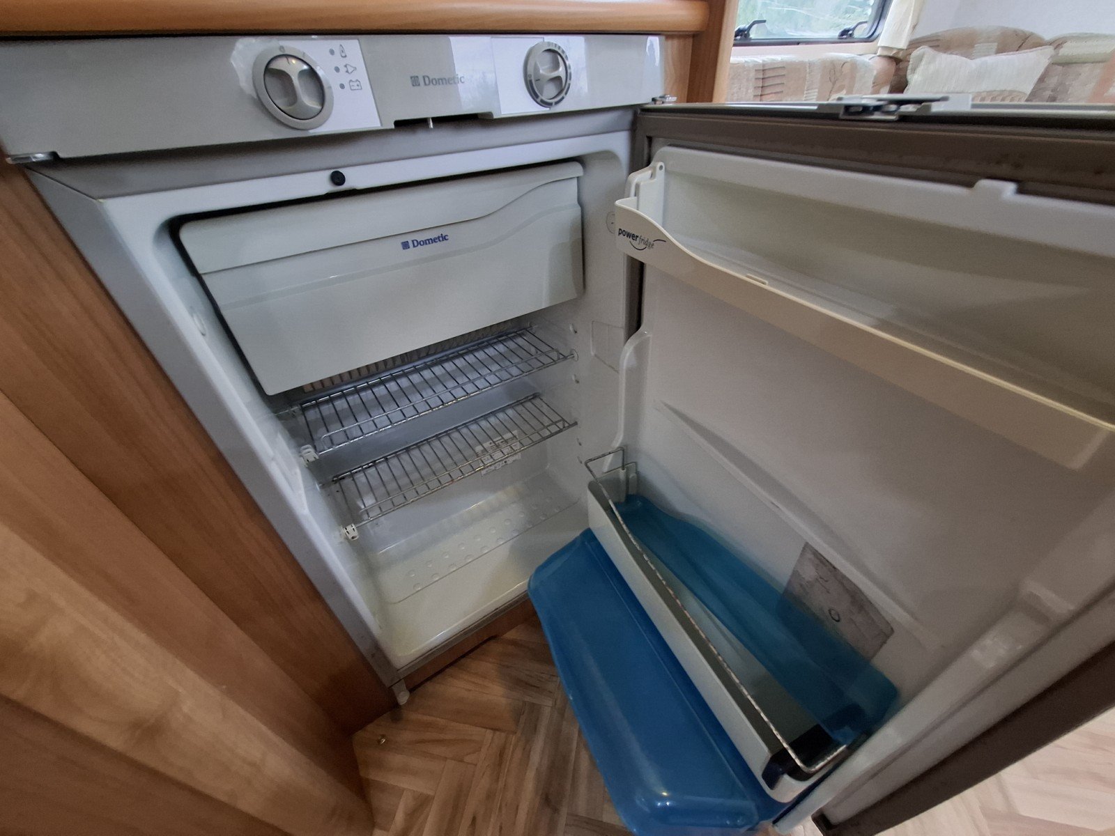 A fridge with a freezer box is opposite (below a large storage cupboard), which in turn is next to the offside wet room with a toilet, a hand basin, and a shower.