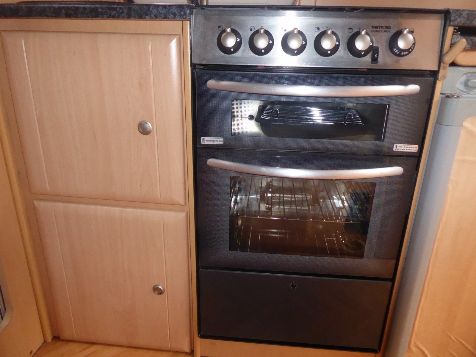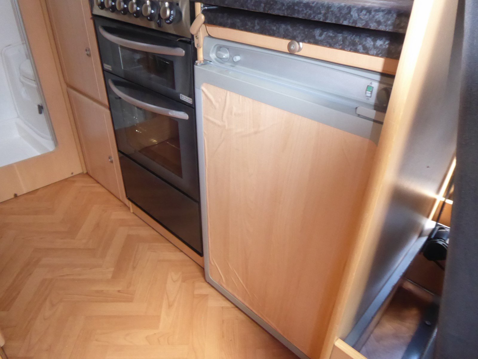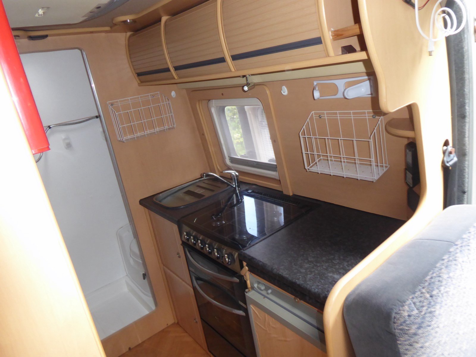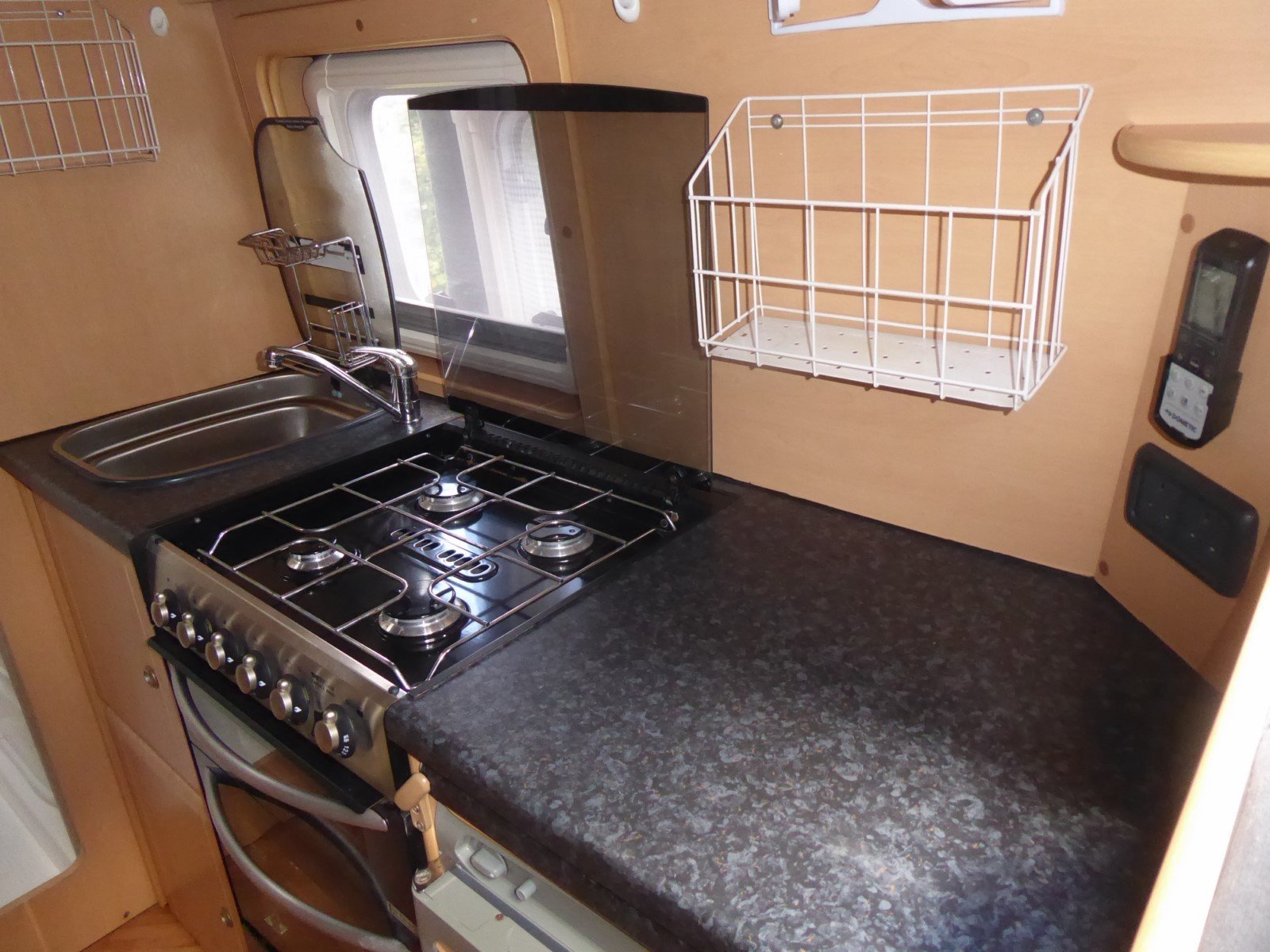 There is a nearside kitchen featuring a hob with four gas burners, a grill, an oven, a sink, and a fridge with a freezer box under a worktop.