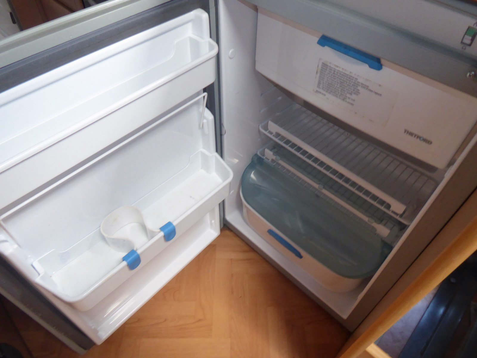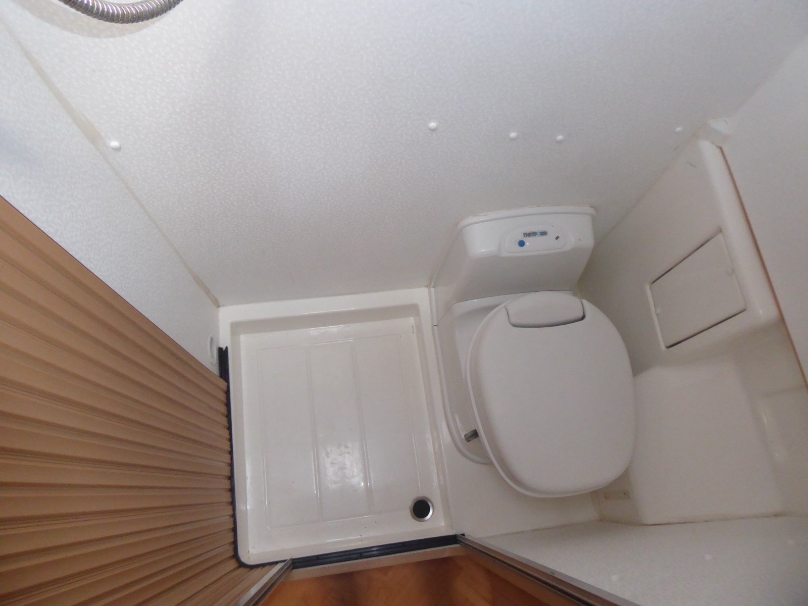 At the rear on the nearside is the washroom with a sliding door, a toilet, a fold down hand basin, and a shower.