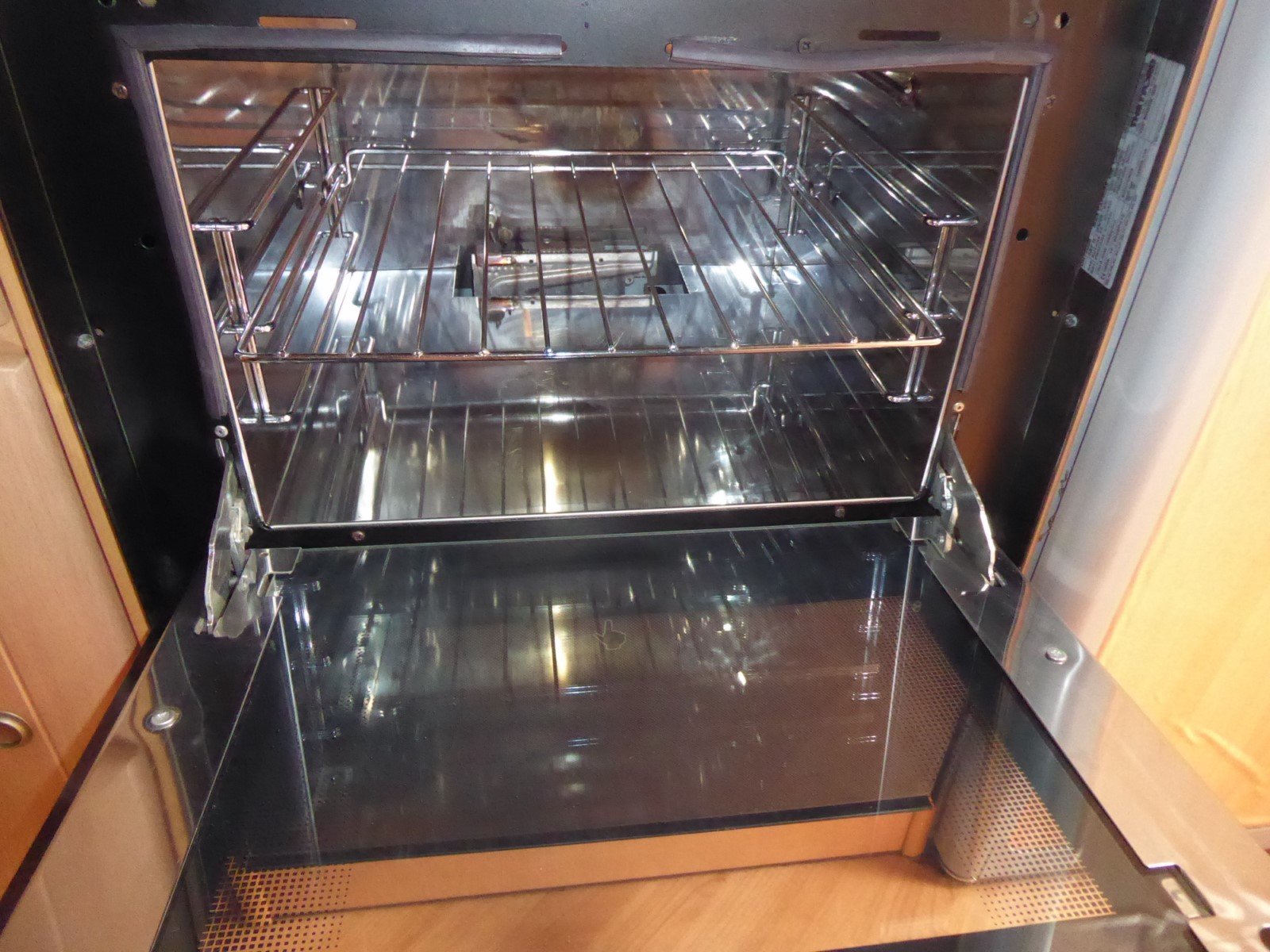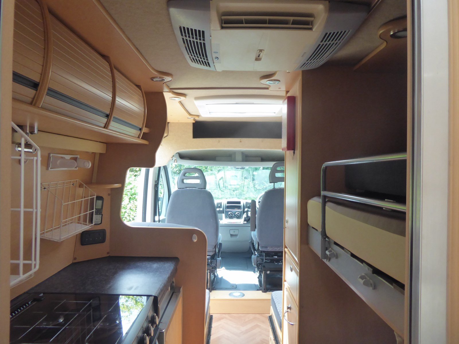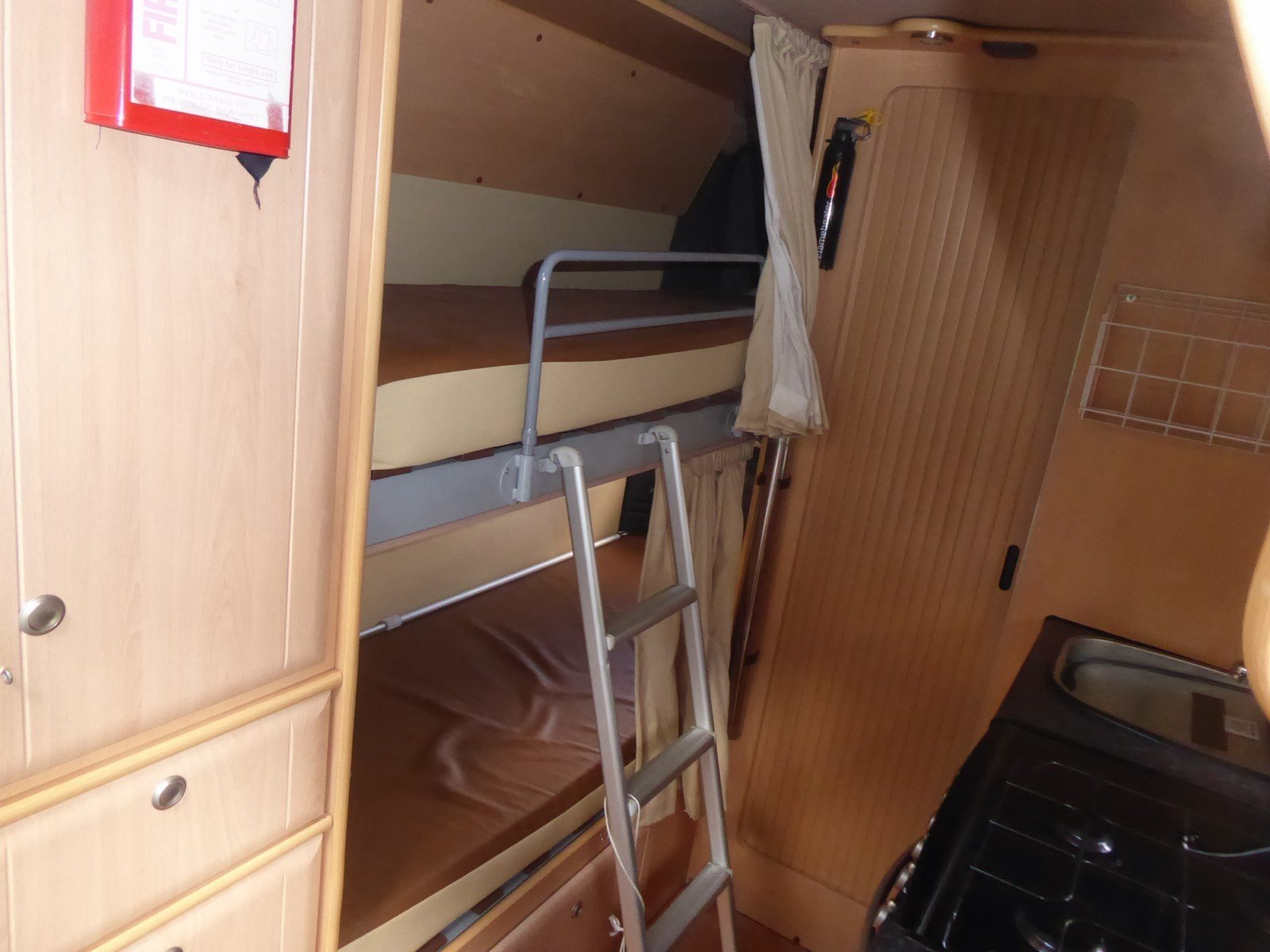 Behind the offside rear seat is a wardrobe and slide out shelving, followed by adult sized single bunks at the rear. The upper bunk can be folded up to permit the lower bunk to be used as a bench seat, which can itself can be opened to provide access to the large storage area underneath.