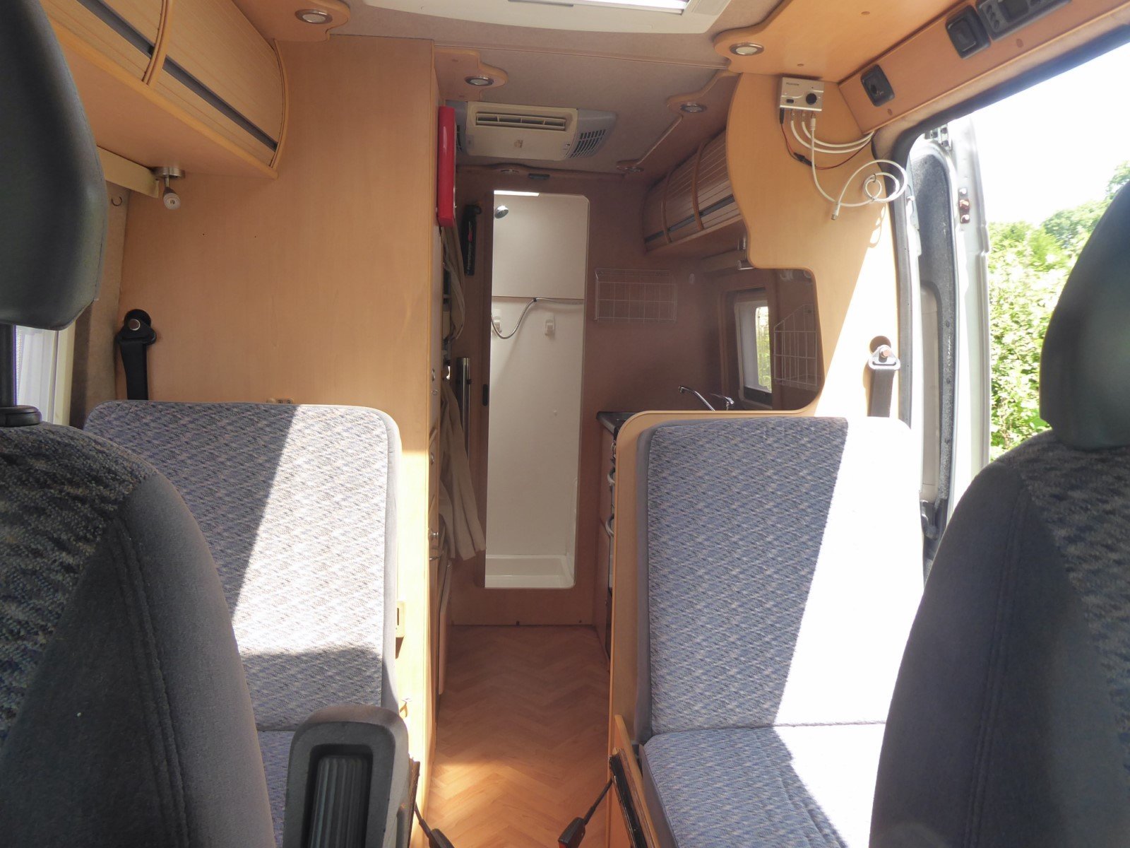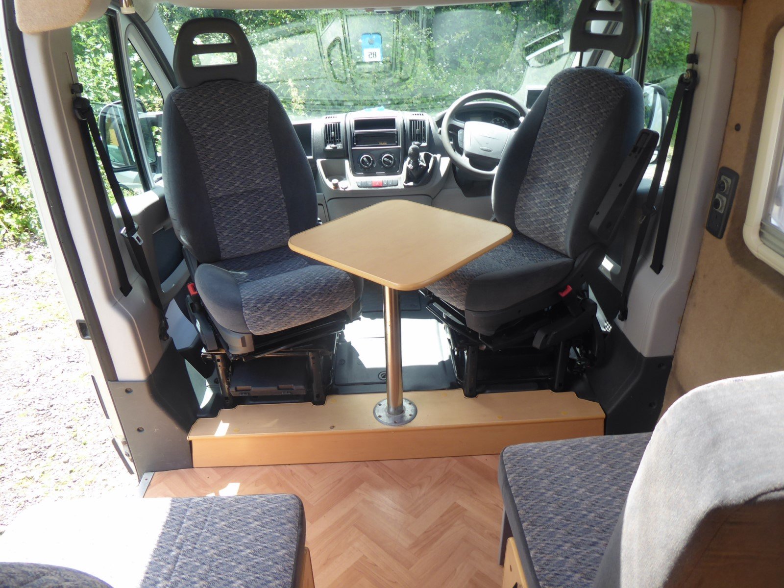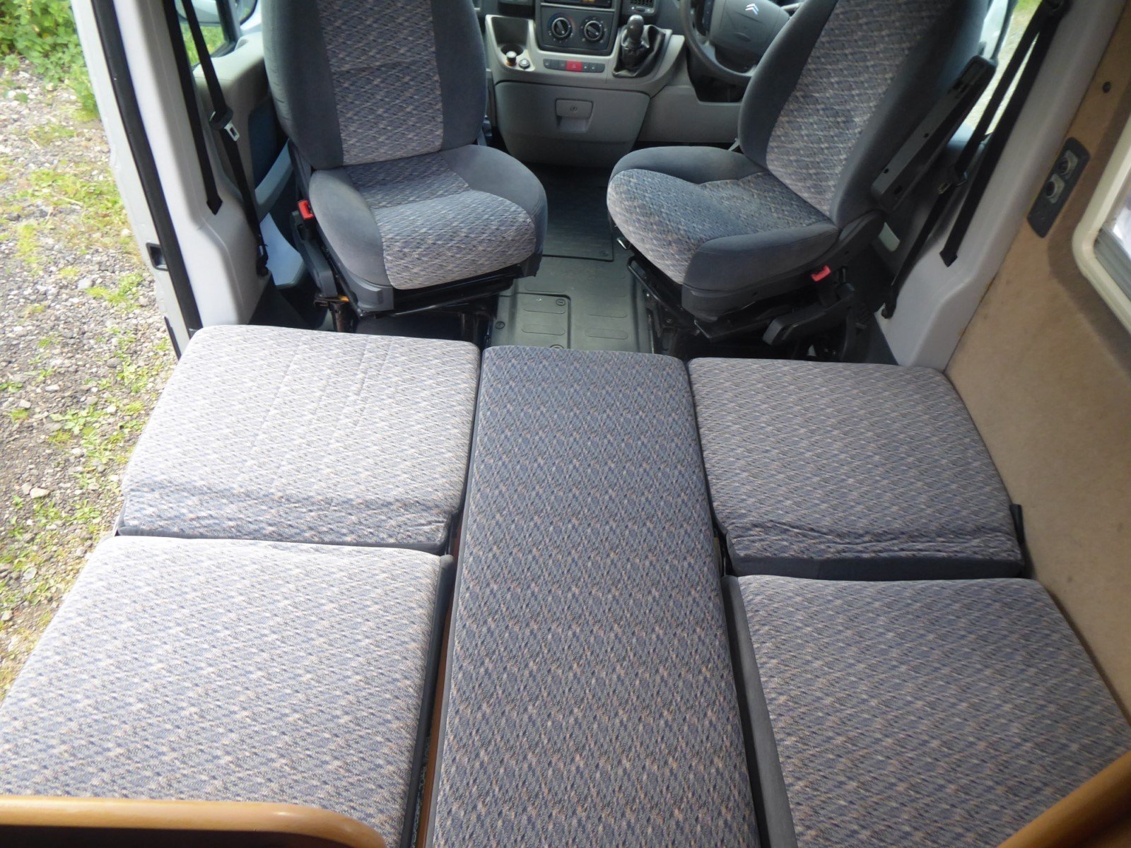 Behind the cab is a versatile leisure/dining area with a single forward facing seat (and seat belt) on either side. The offside seat can be extended and flattened, with a backrest cushion provided to convert it into a side sofa opposite the side door. This use of this area can be enhanced by use of the swivel cab seats. At night time the side seats and backrest cushion can be reassembled to create a transverse double berth.