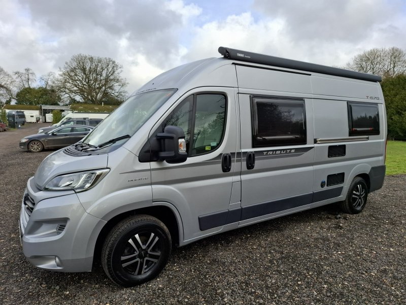 Auto-Trail Tribute T-670 Year: 2018 | Berth: 2 | Belts: 4 Engine: 2.3L | Fuel: Diesel | Gearbox: Manual 6 Speed Mileage: 28244 | Price: £44,995 Opposite the nearside side door is a forward facing half dinette (with two additional seat …