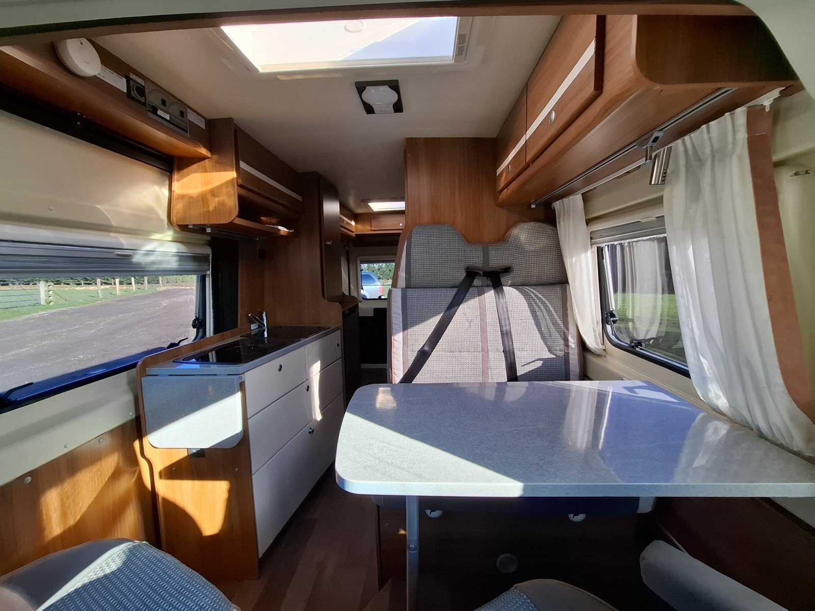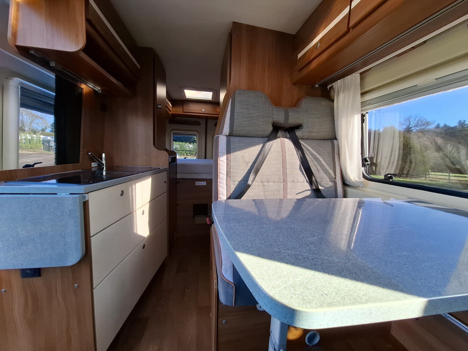 Opposite the nearside side door is a forward facing half dinette seat with two additional seat belts. It is fronted by a foldable table, and further enhanced as a dining/leisure area by rotating the swivel cab seats.