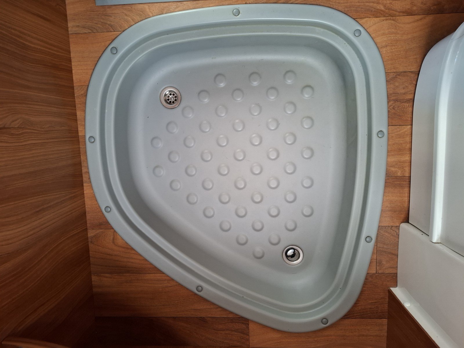 Opposite the kitchen is an integrated bathroom with a toilet, a hand basin, and a shower.