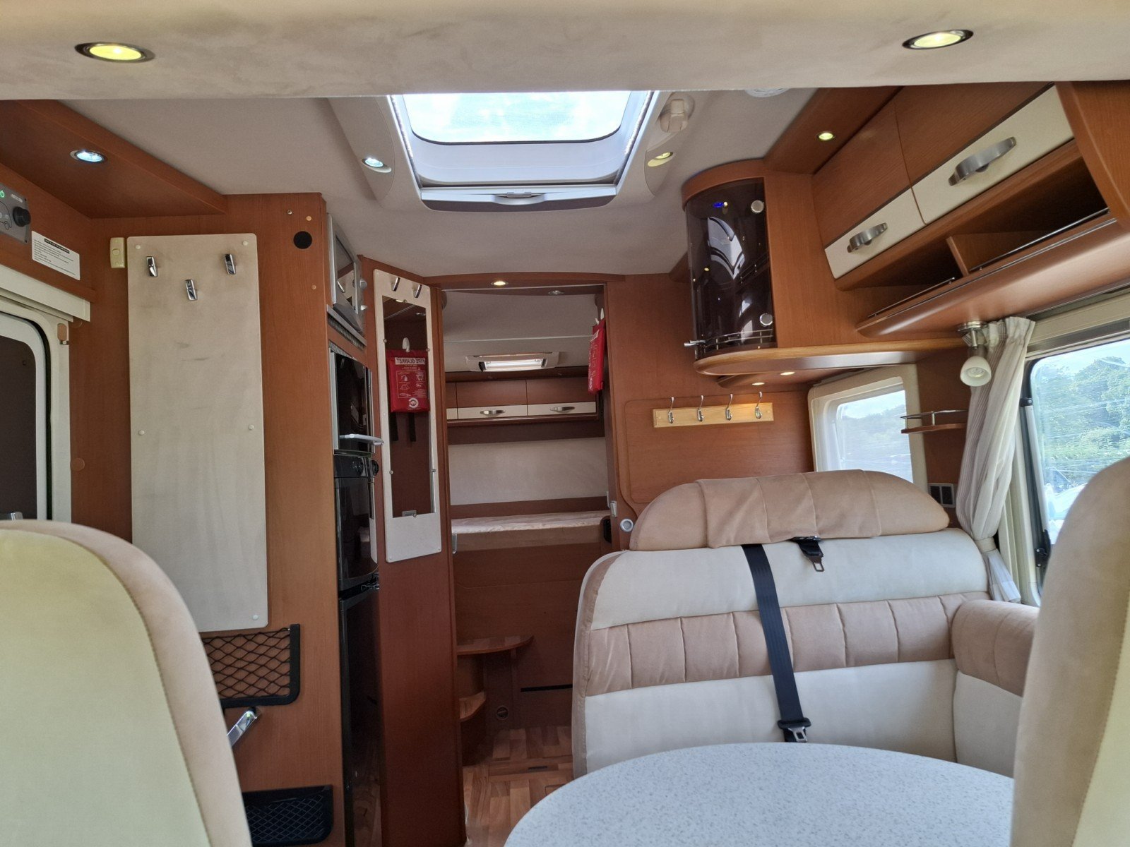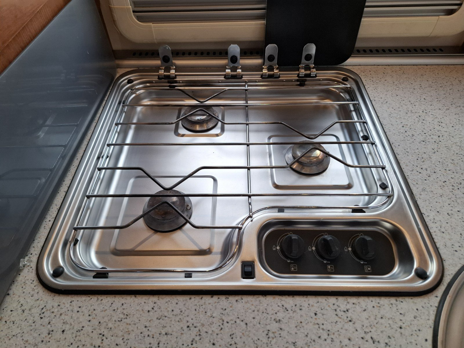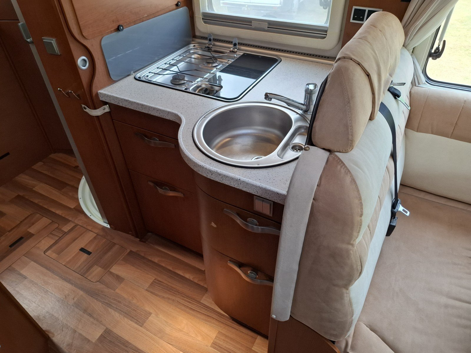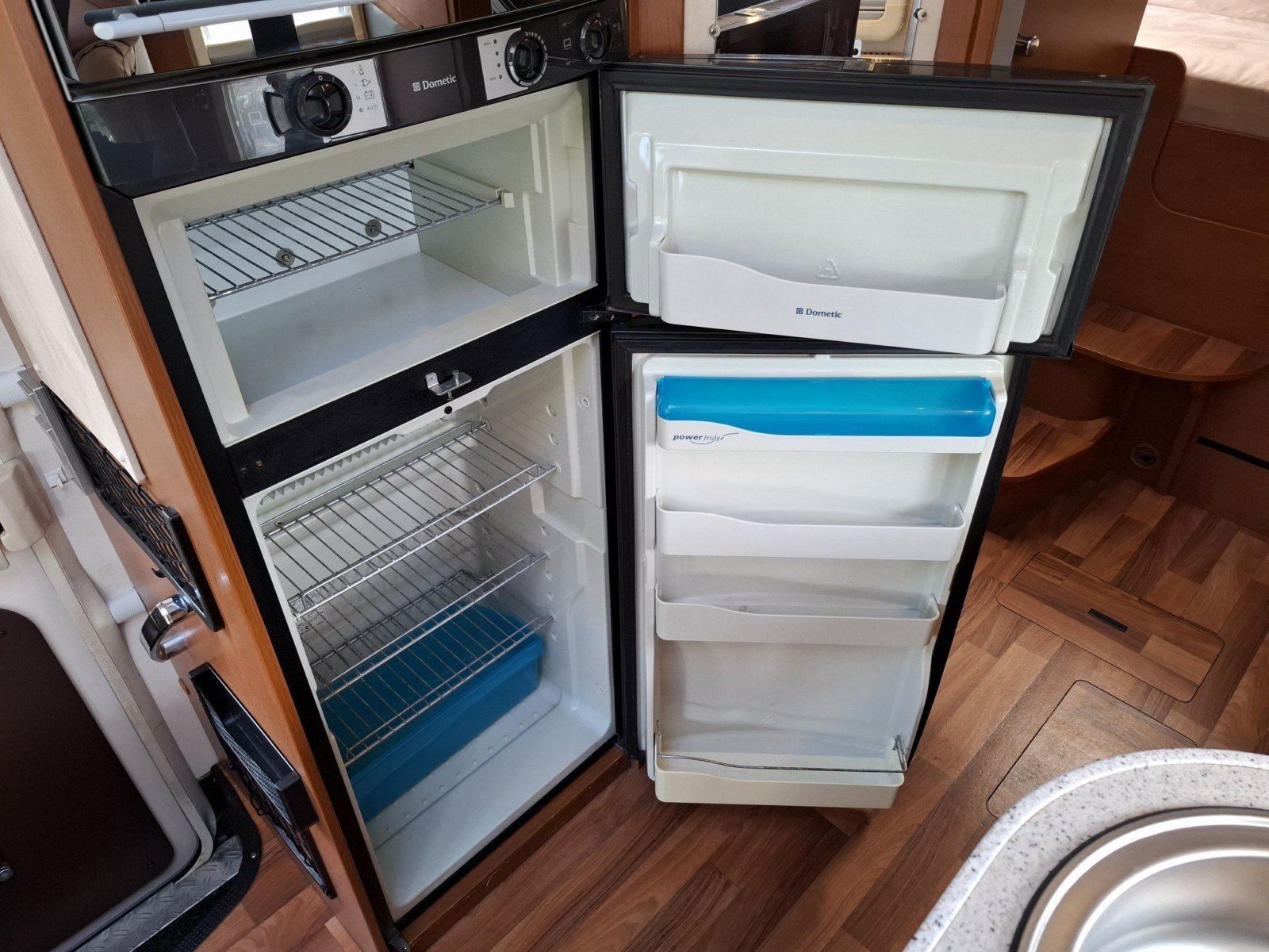 Conveniently adjacent, is the nearside side central kitchen, which features a hob with 3 gas burners, and a sink. Opposite, next to the habitation door, there is a microwave, a combination oven/grill, and a fridge with a separate freezer.
