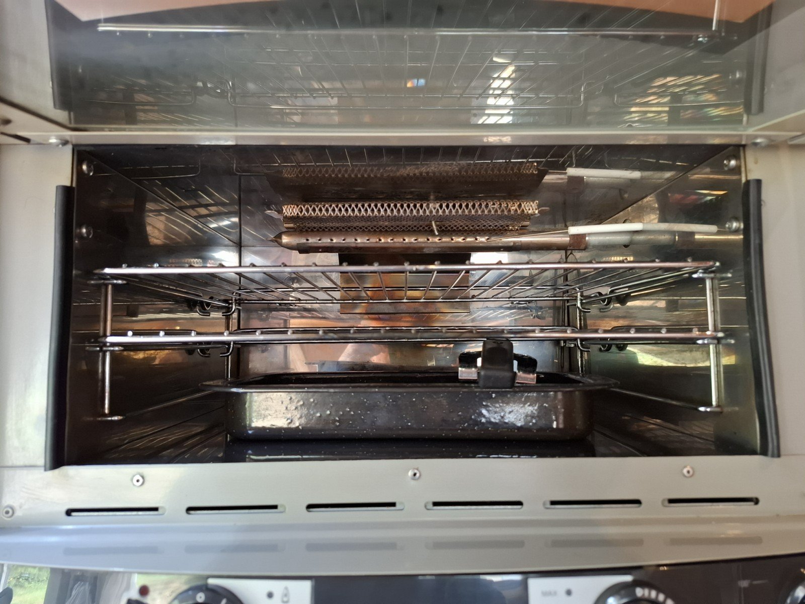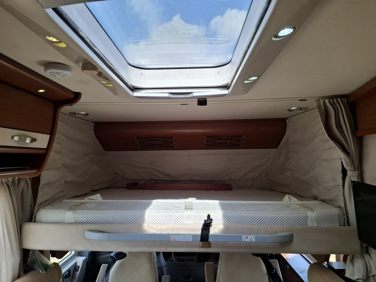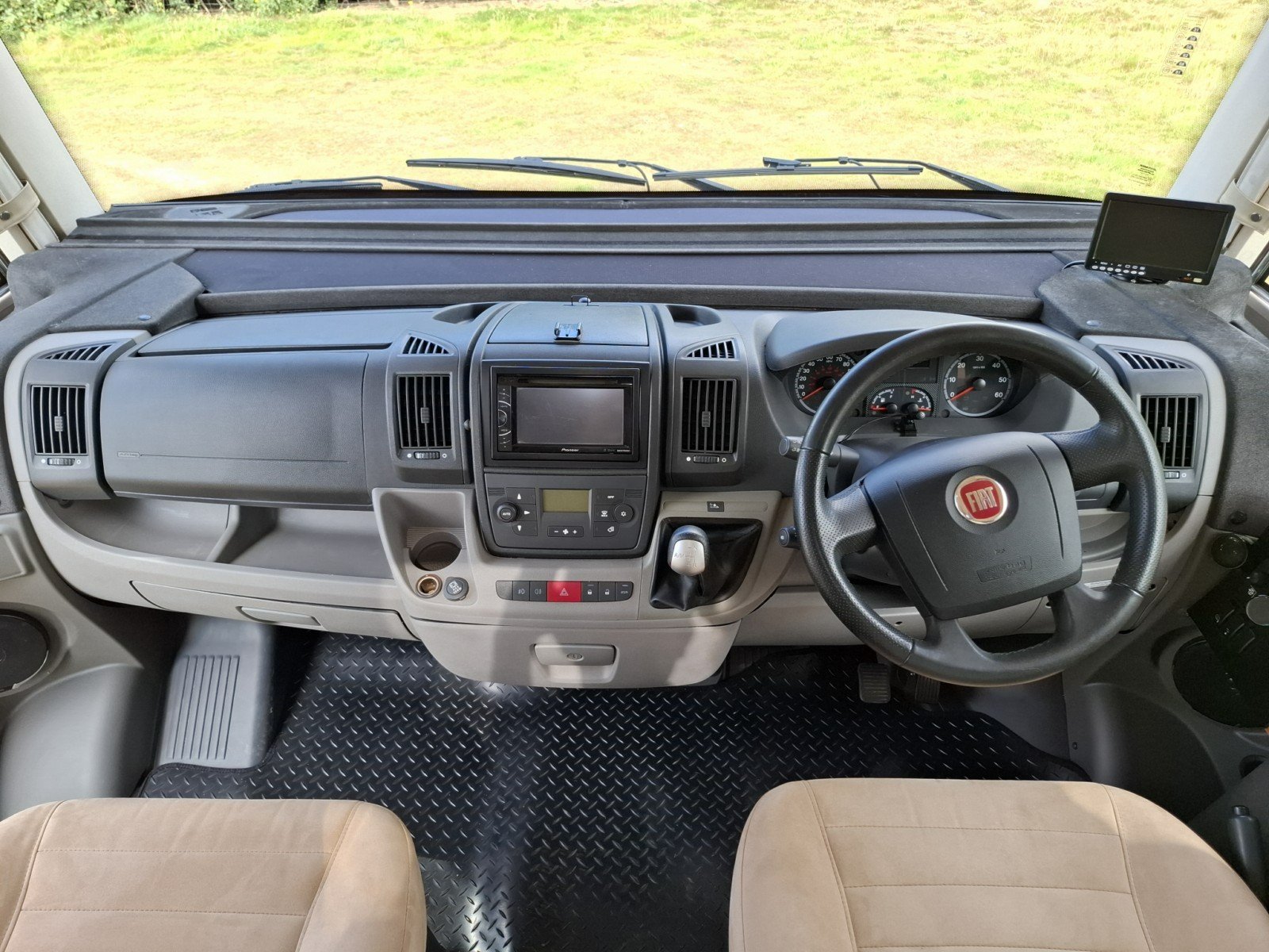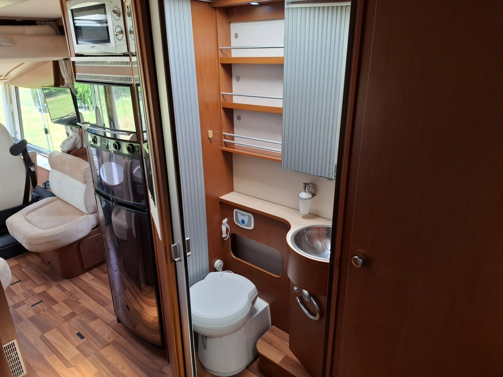Conveniently adjacent, is the nearside side central kitchen, which features a hob with 3 gas burners, and a sink. Opposite, next to the habitation door, there is a microwave, a combination oven/grill, and a fridge with a separate freezer.