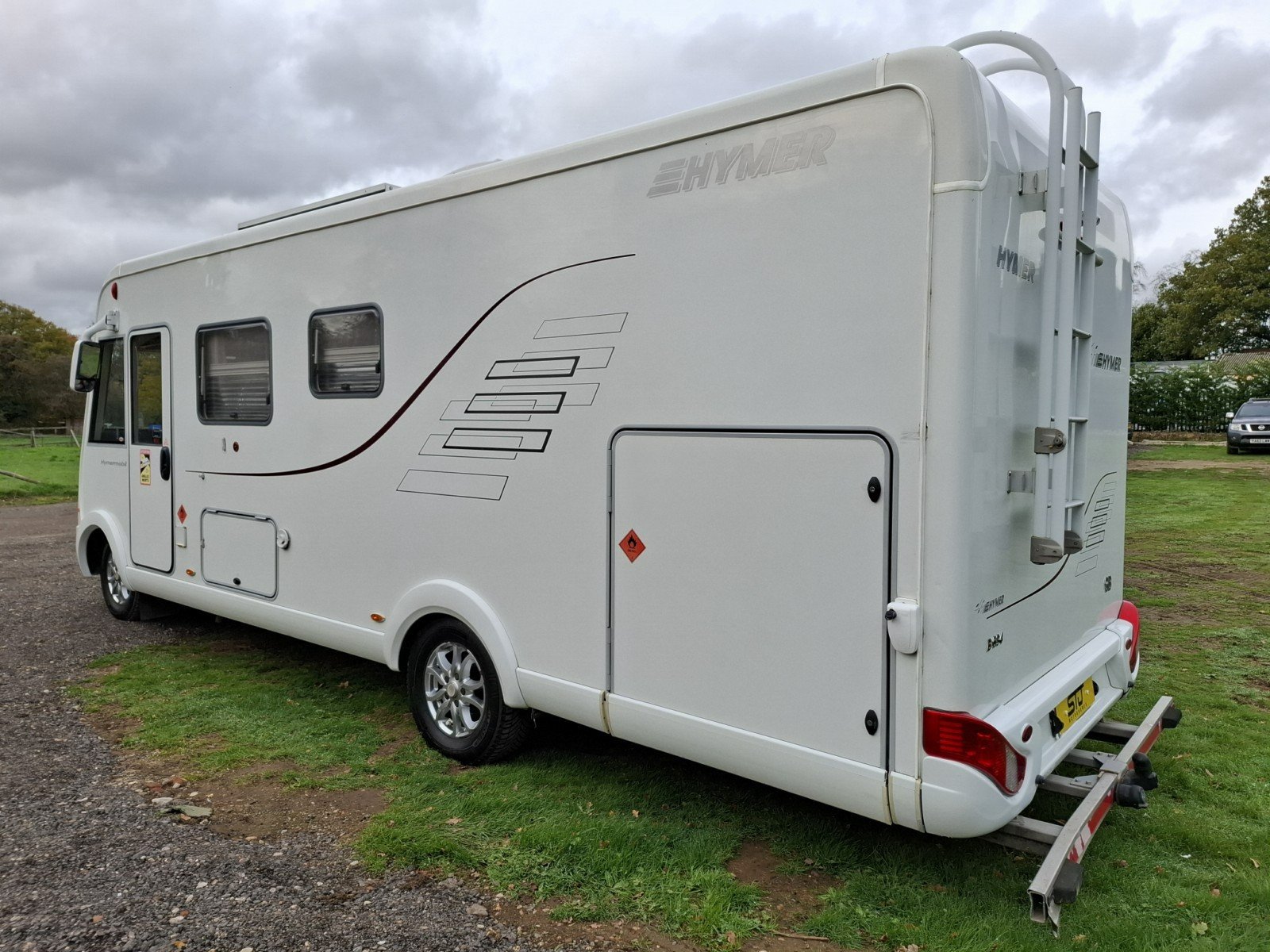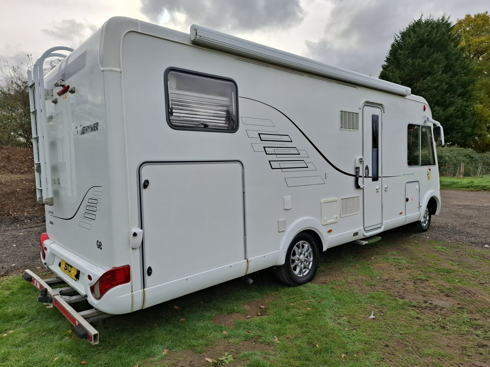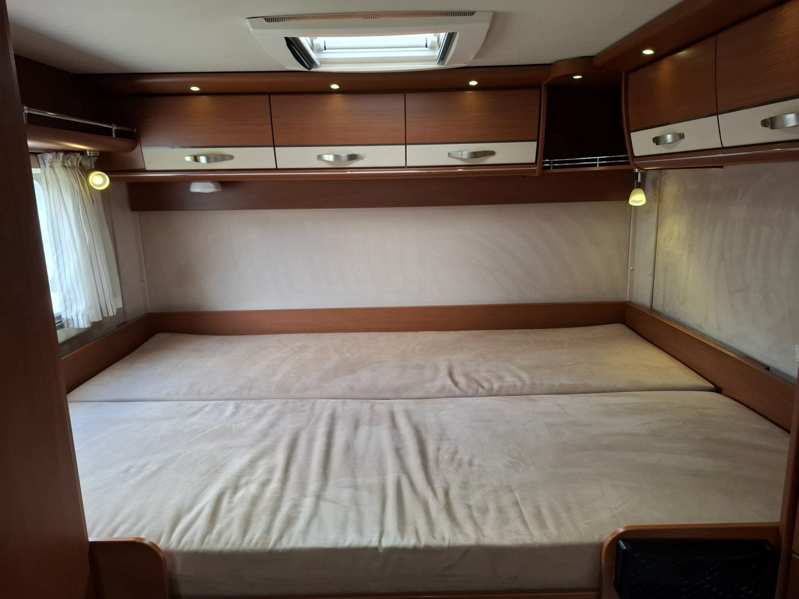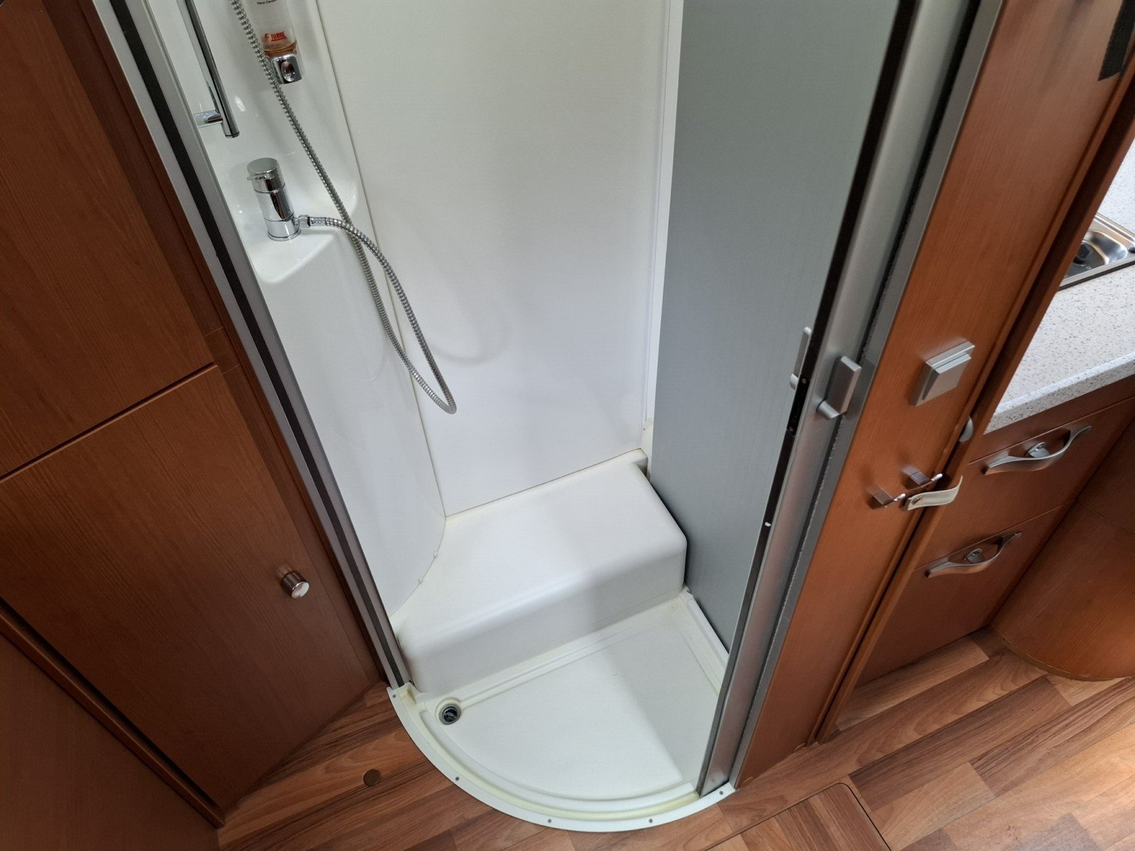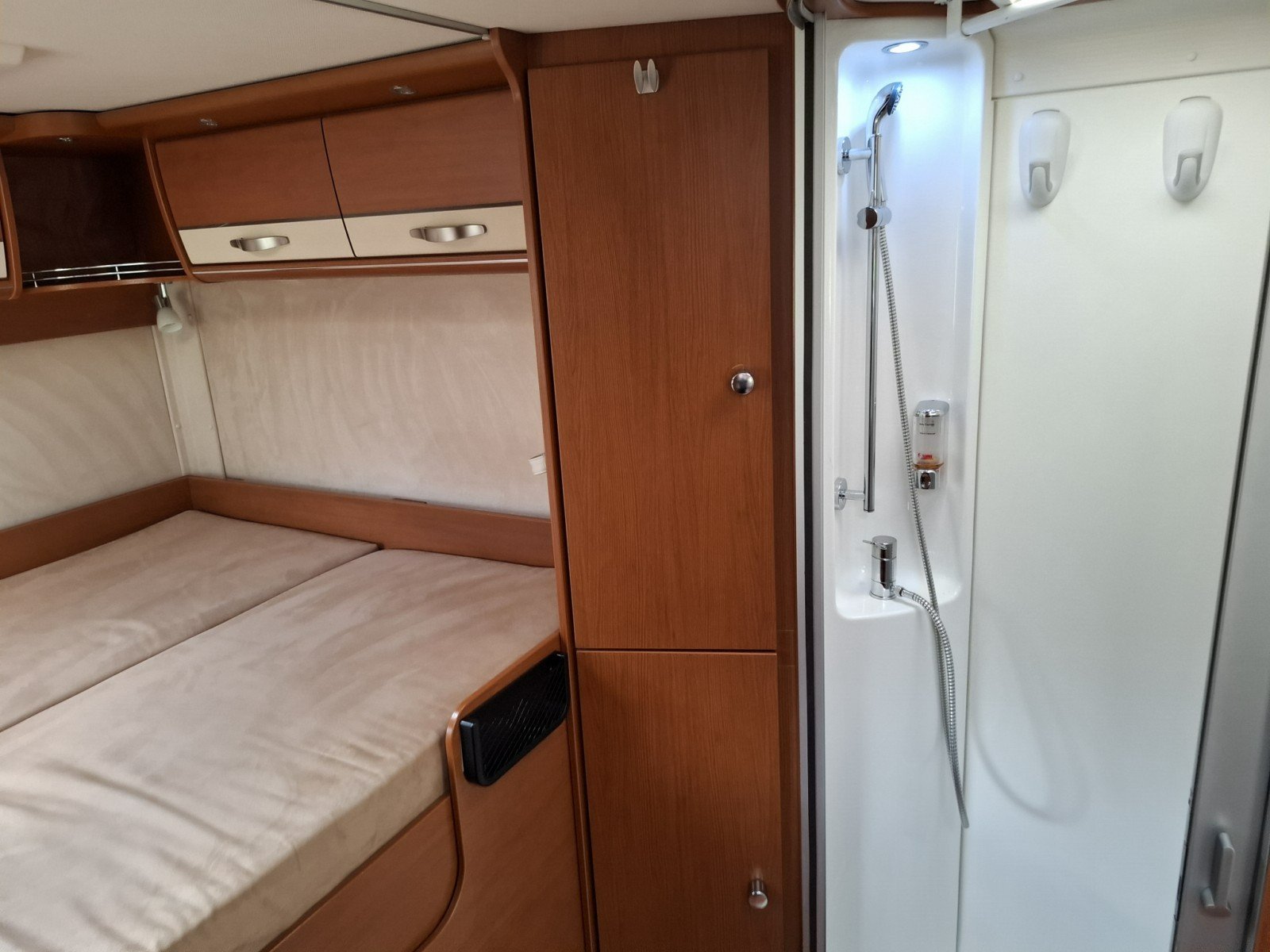 Beyond the kitchen there is storage space either side, followed by an area that can be screened for privacy. This contains a nearside wash room with a toilet, a hand basin, a separate screened shower cubicle opposite, and a raised transverse double berth over the large externally accessed garage at the rear.