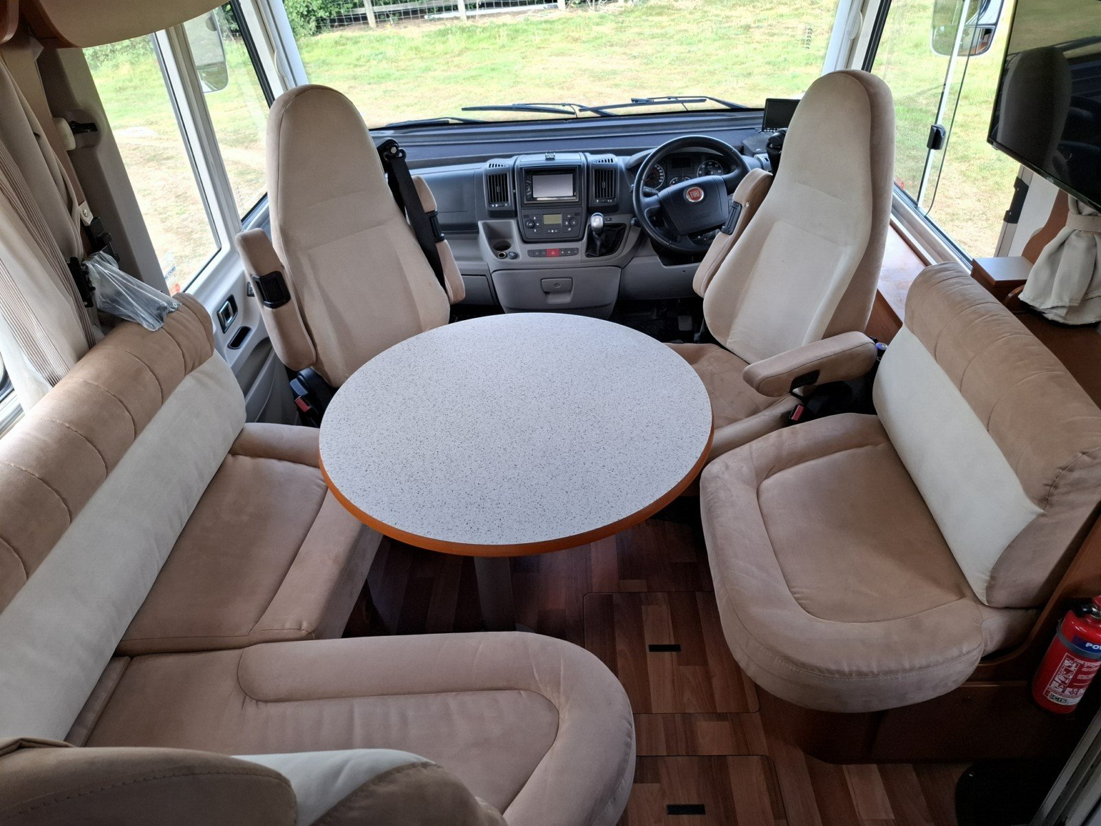 The forward habitation comprises L-shaped seating (with two additional forward facing seat belts) and an opposing side seat around a large circular table, which can be enhanced as a living/dining area by use of the swivel cab seats.