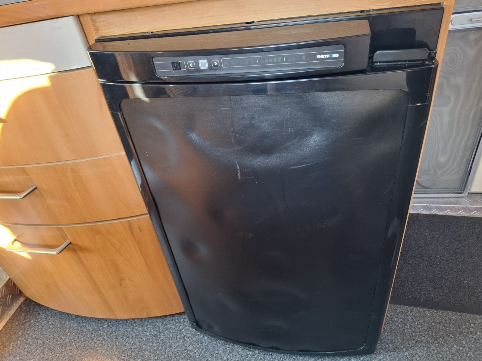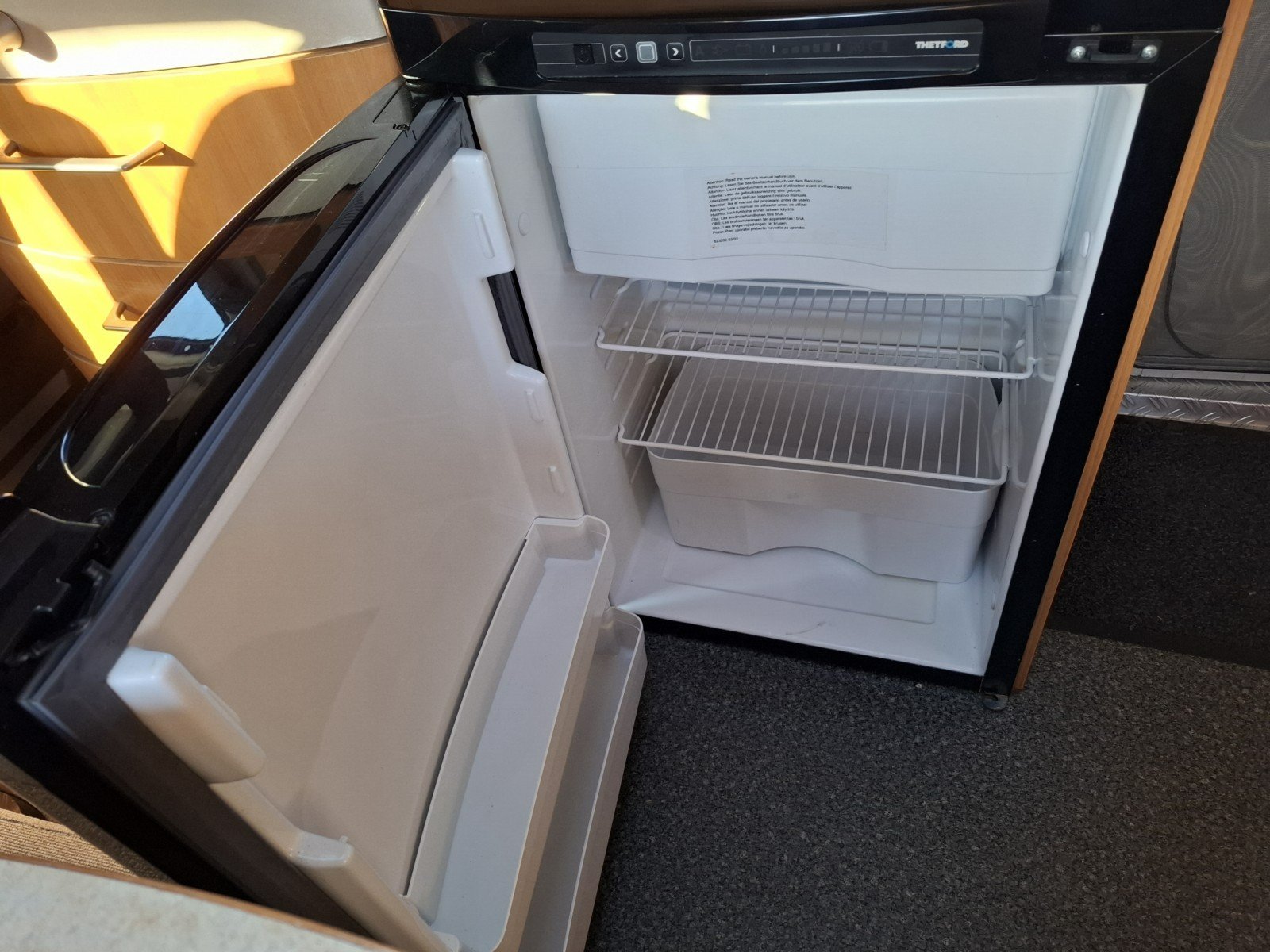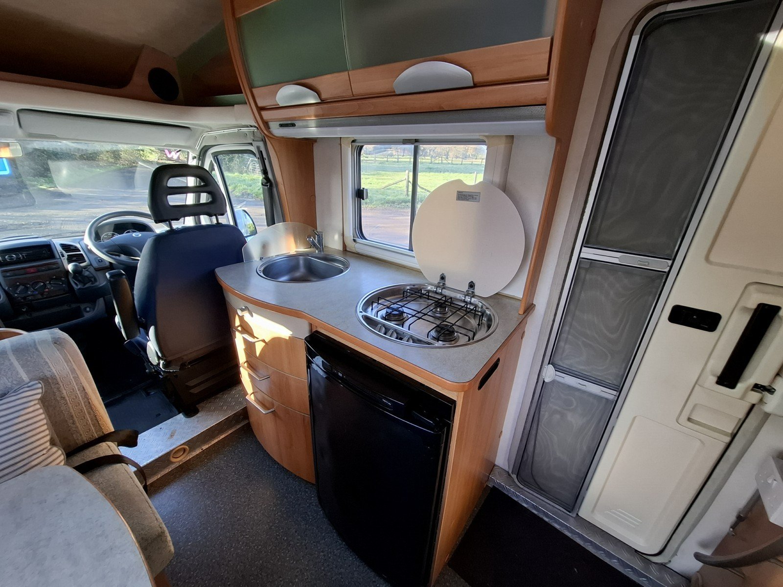 Opposite the dinette, behind the driver’s seat, is the conveniently adjacent side kitchen, with a sink, a hob with 3 gas burners, and a fridge with a freezer box.