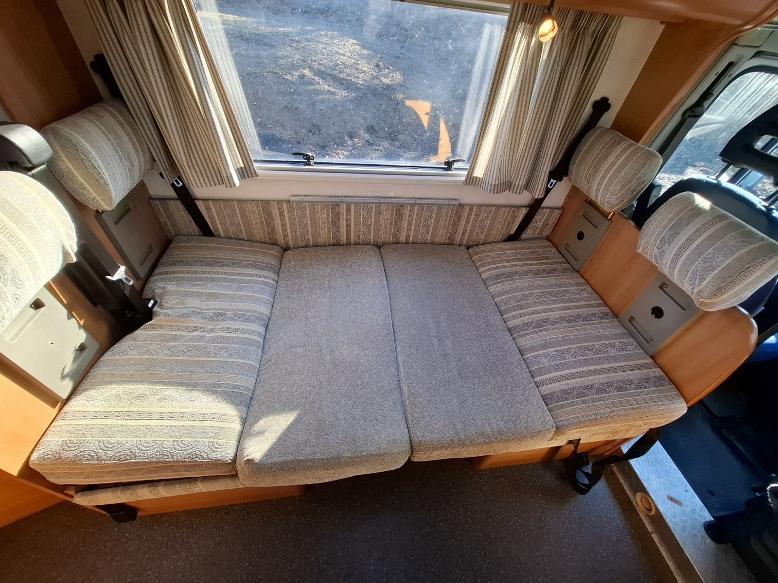 Behind the cab passenger seat is a full dinette for four persons (with two forward facing three-point seat belts, one rear facing three-point seat belt, and one rear facing lap belt). The dinette can be converted into a double berth.