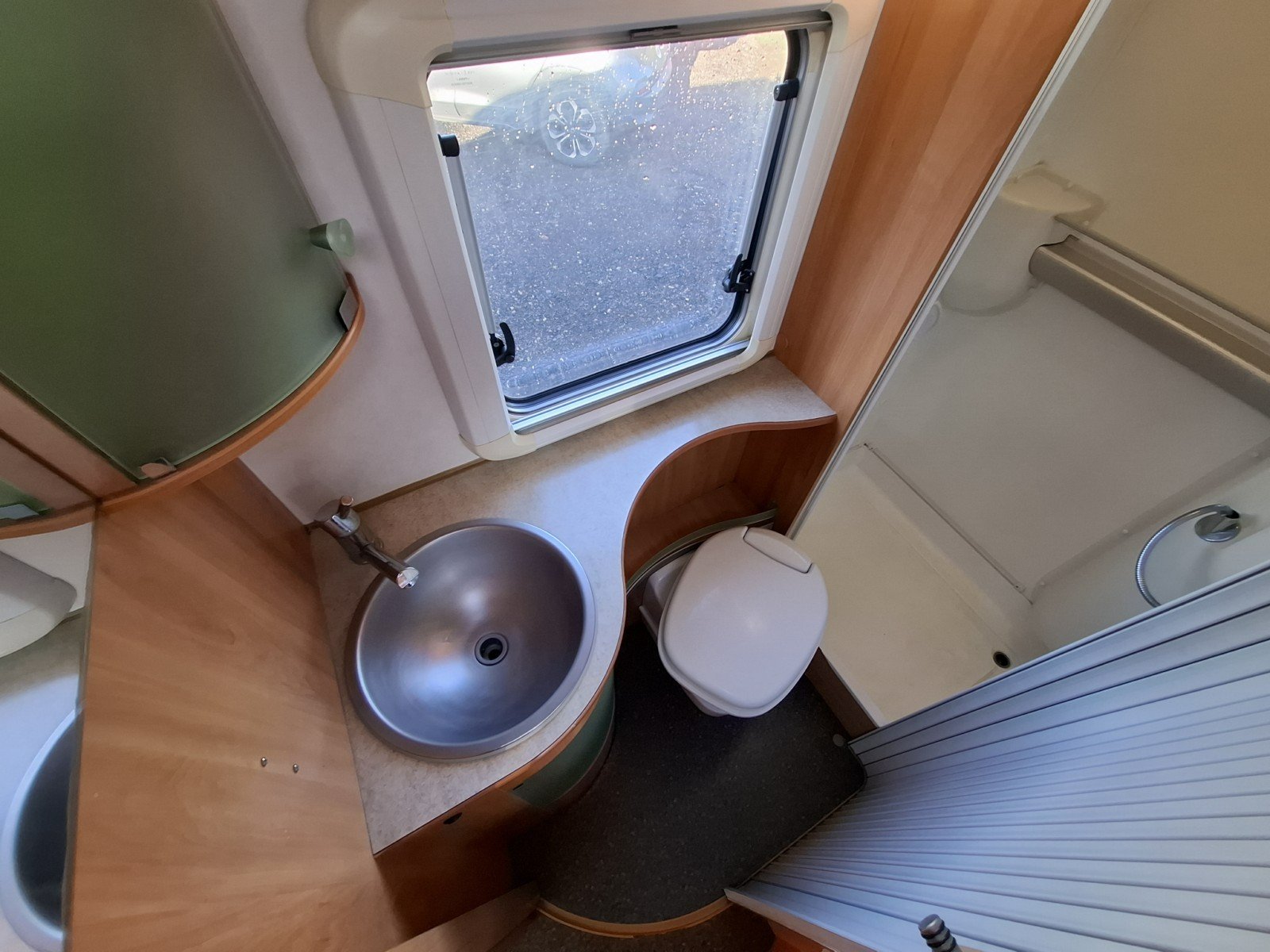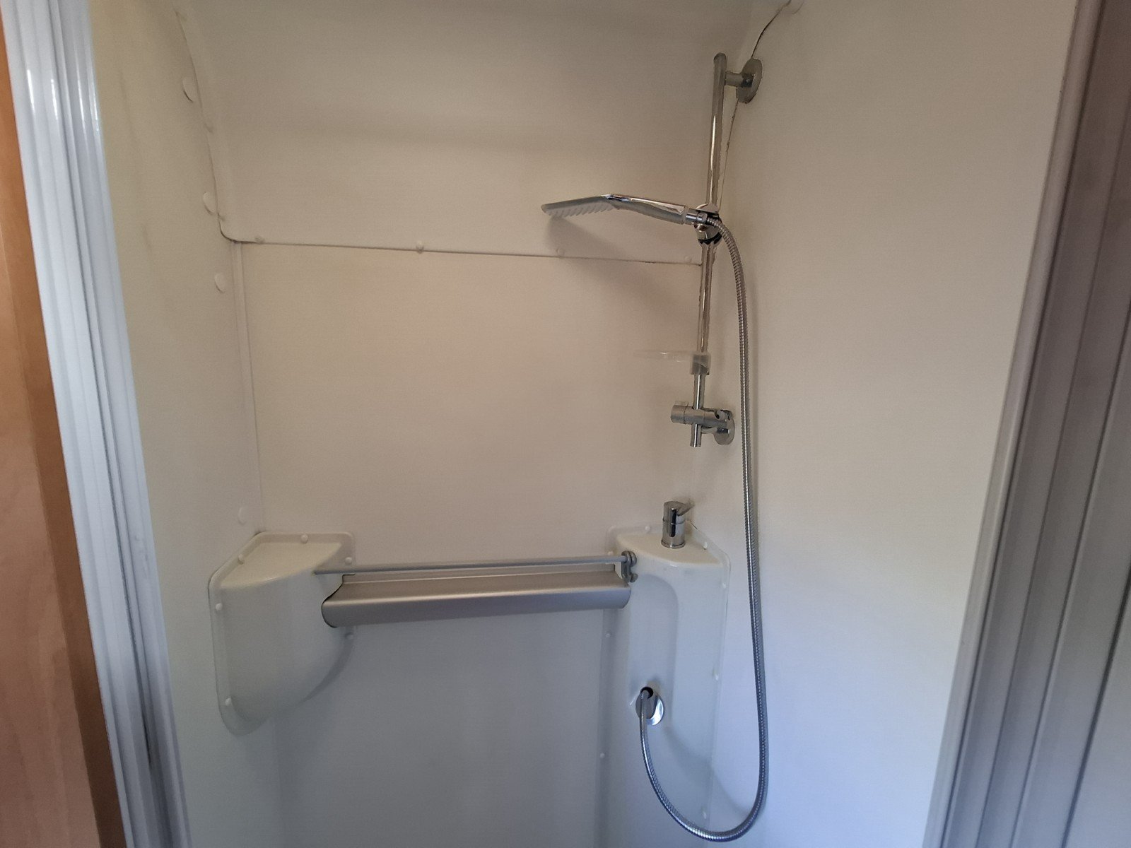 After the kitchen the central habitation door is followed by a wardrobe, and the bathroom which has a toilet, a hand basin, and a screened shower cubicle.