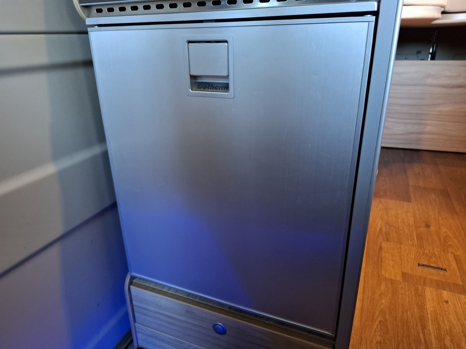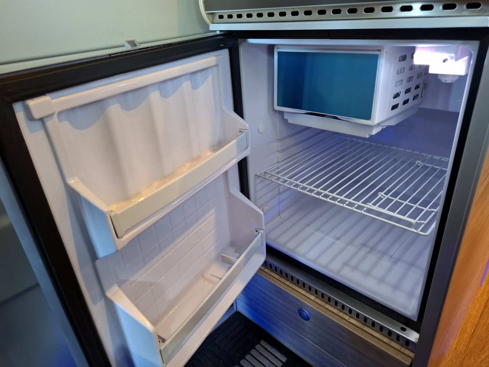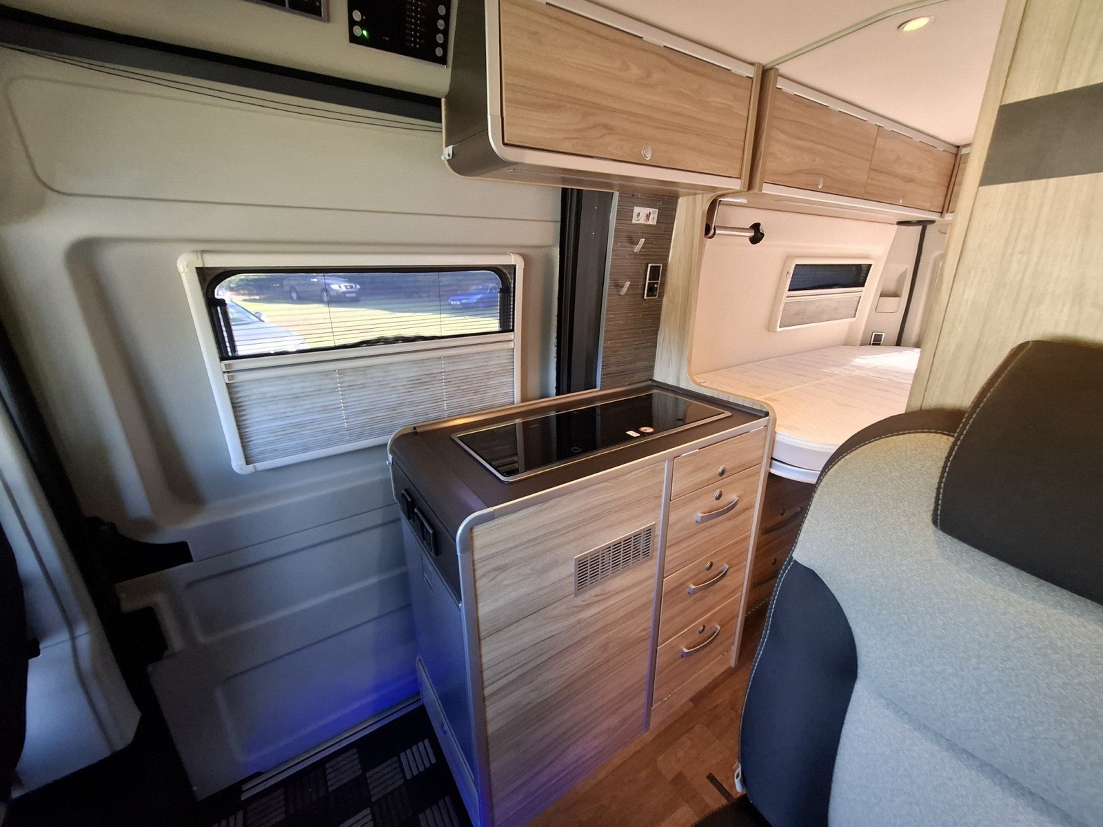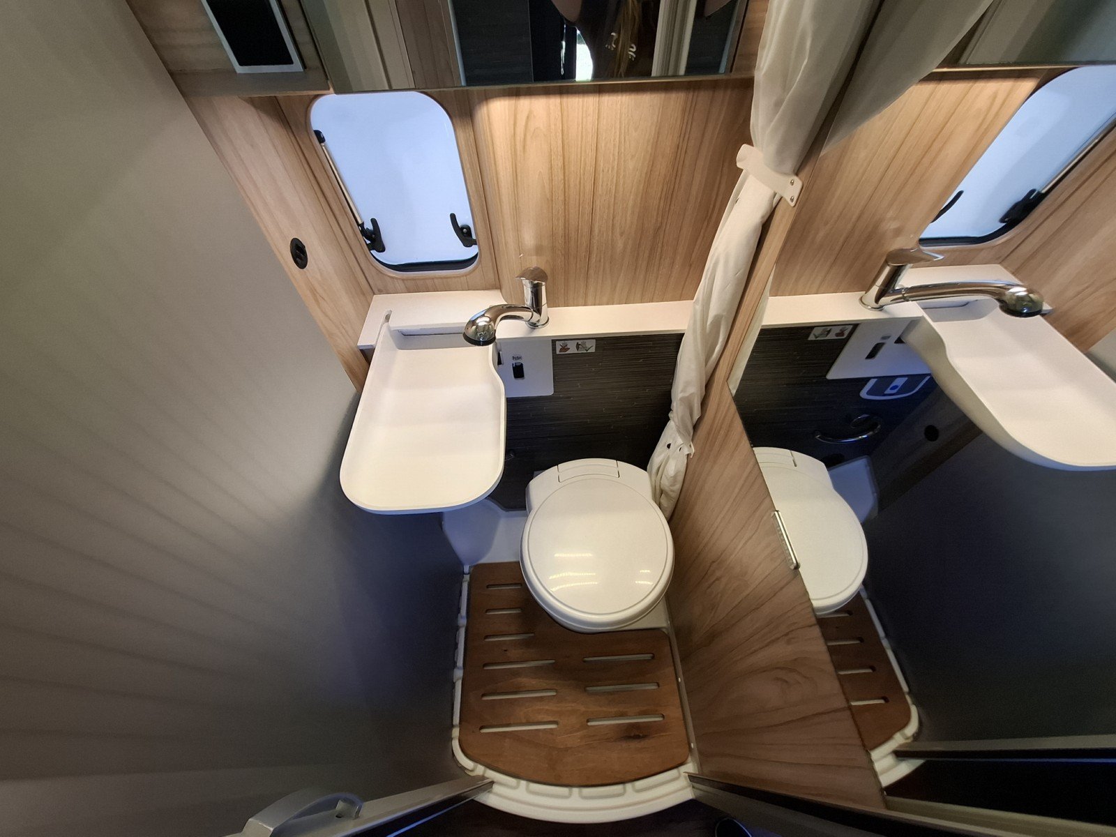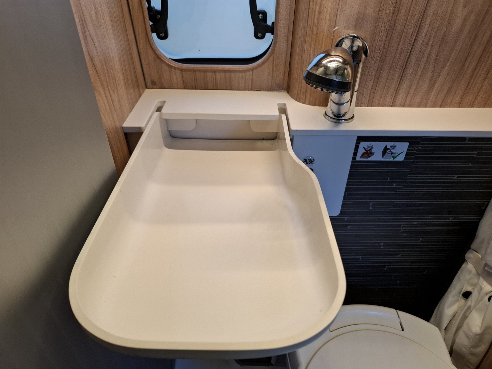Opposite the kitchen is an integrated bathroom with a toilet, a foldable hand basin, and a shower.