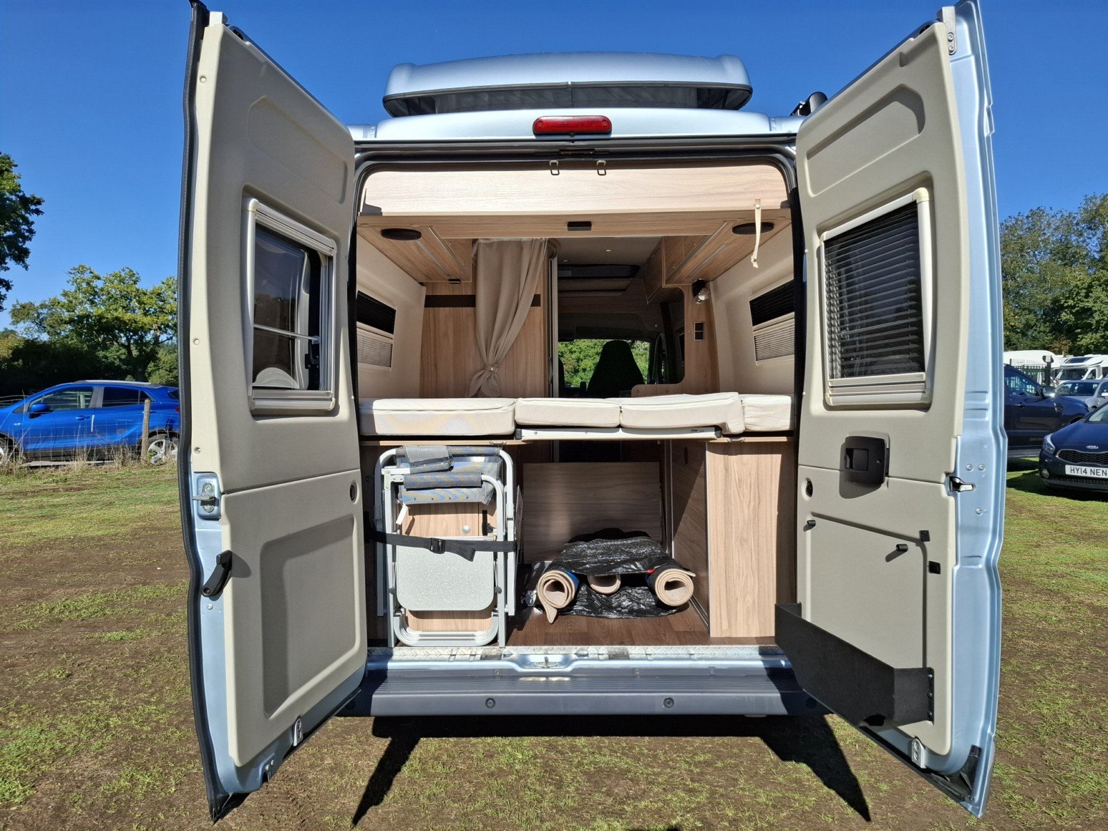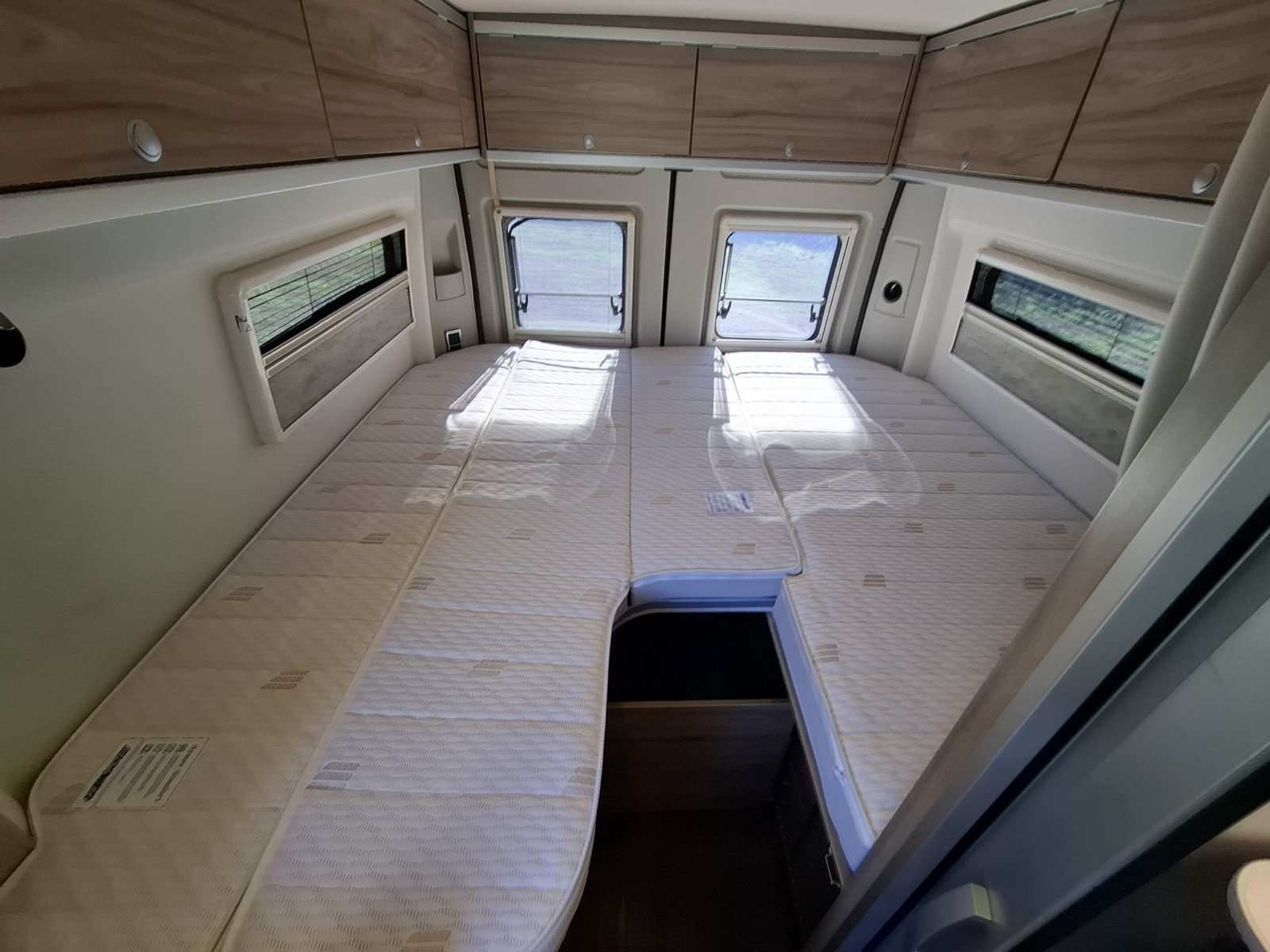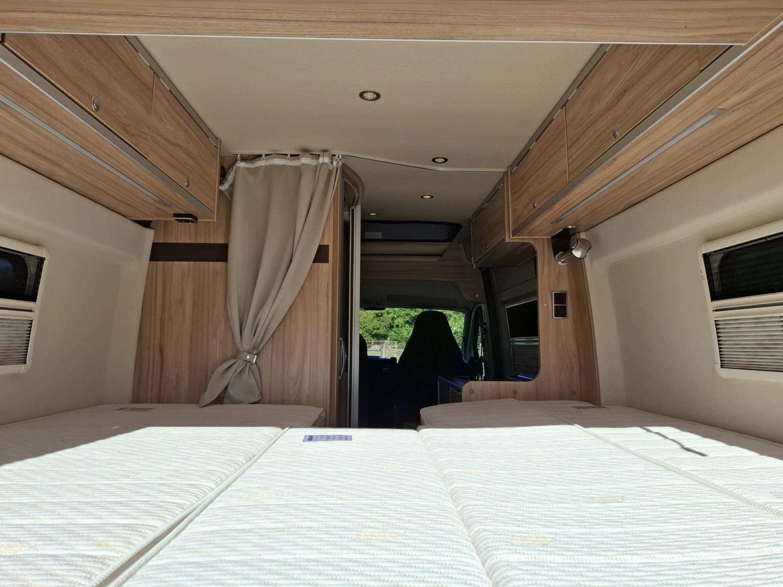 At the rear of the vehicle is a fold up transverse double berth, that can be raised for access via the rear doors.