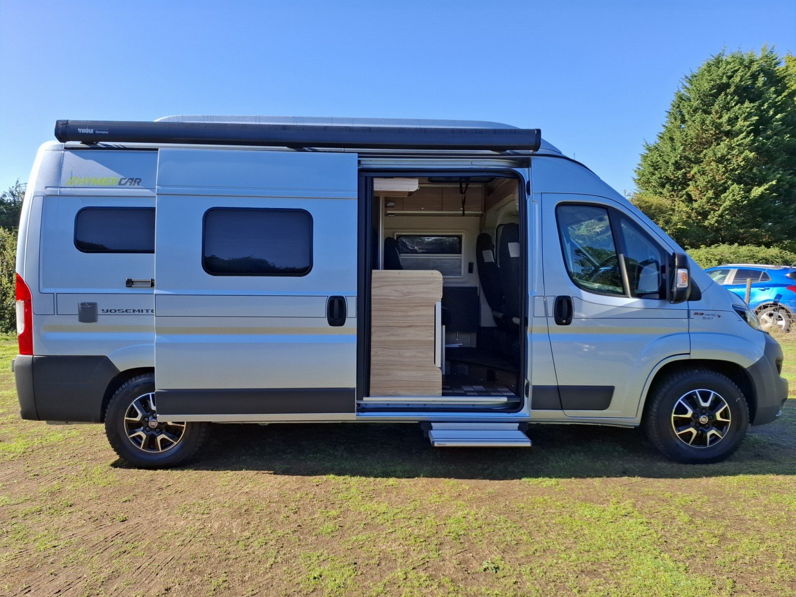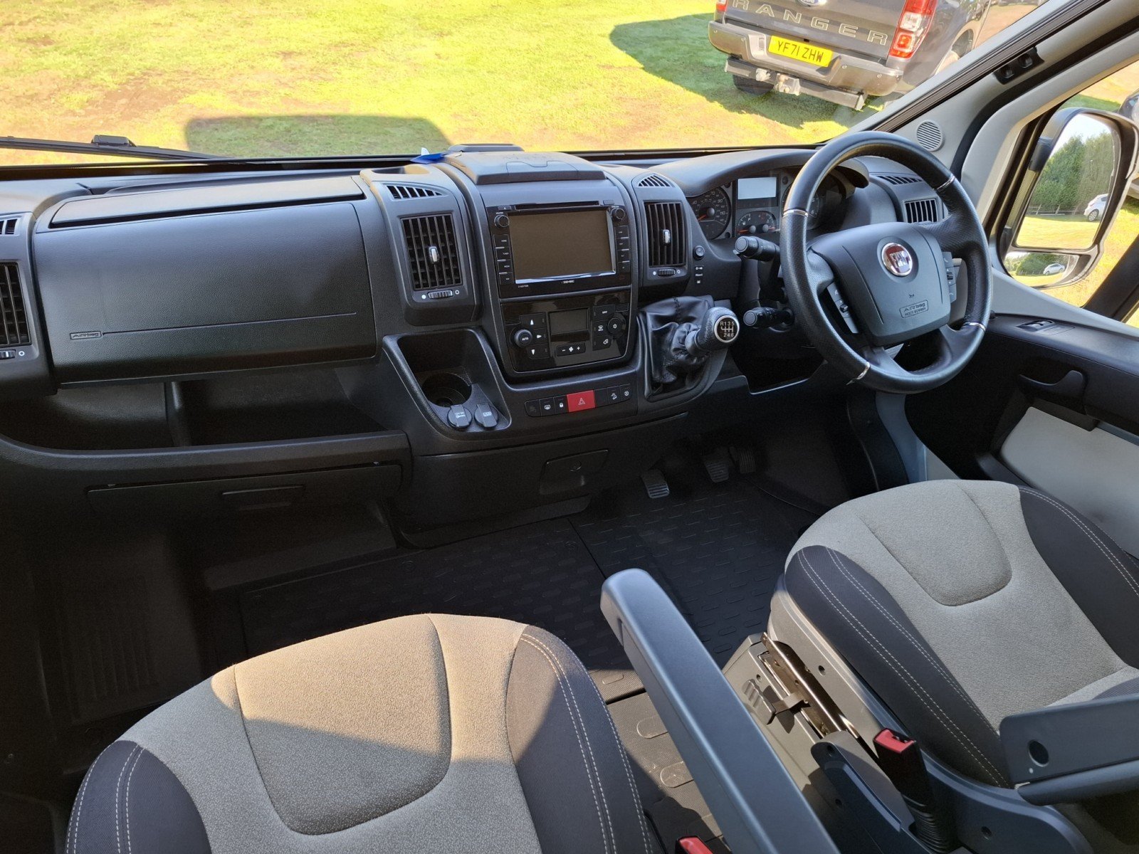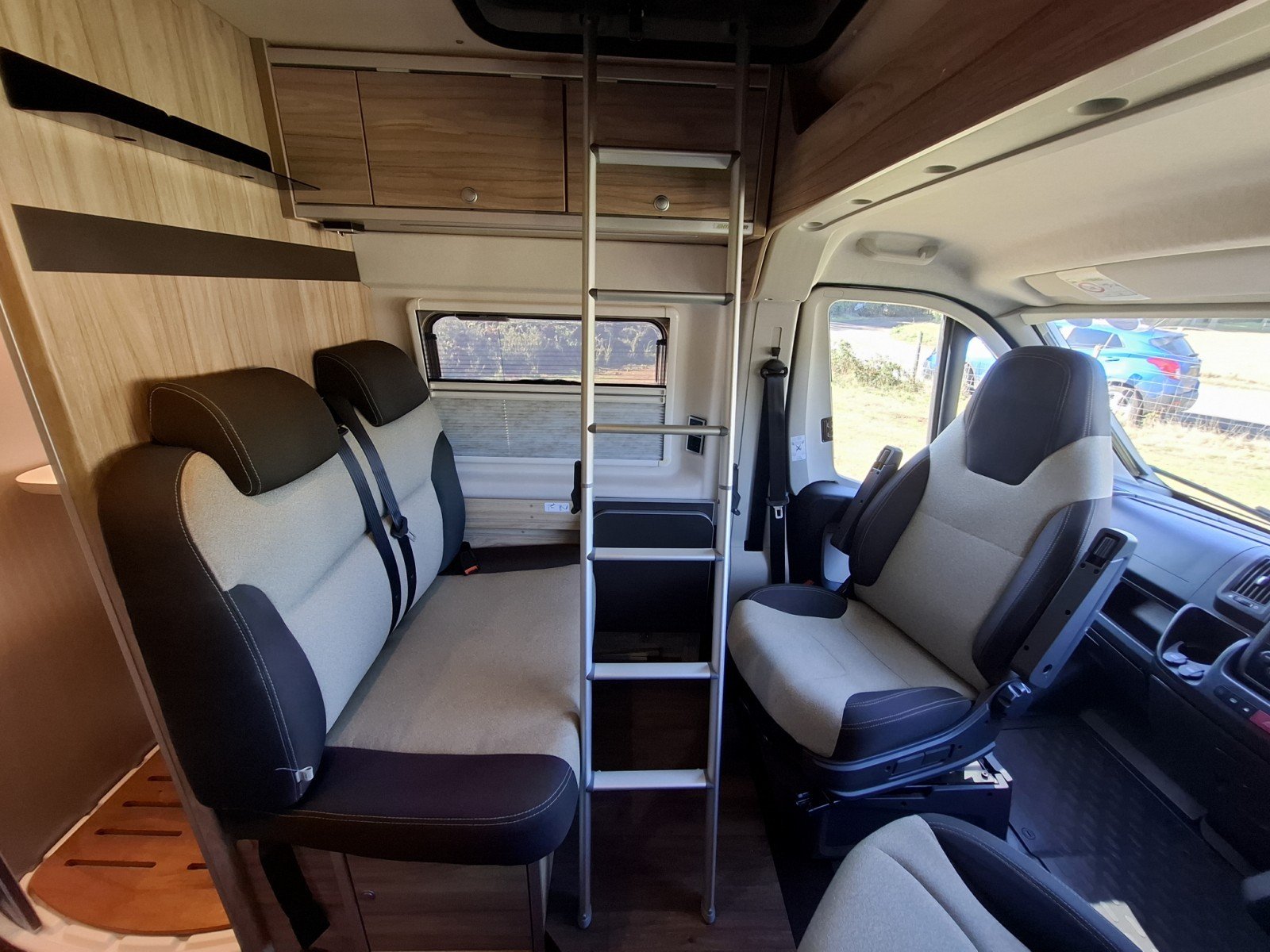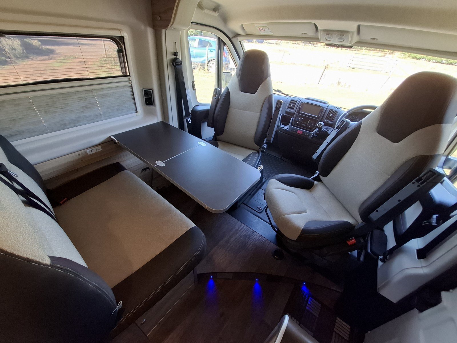 Opposite the offside side door is a forward facing half dinette seat with two additional seat belts. It is fronted by a foldable table, and further enhanced as a dining/leisure area by rotating the swivel cab seats.
