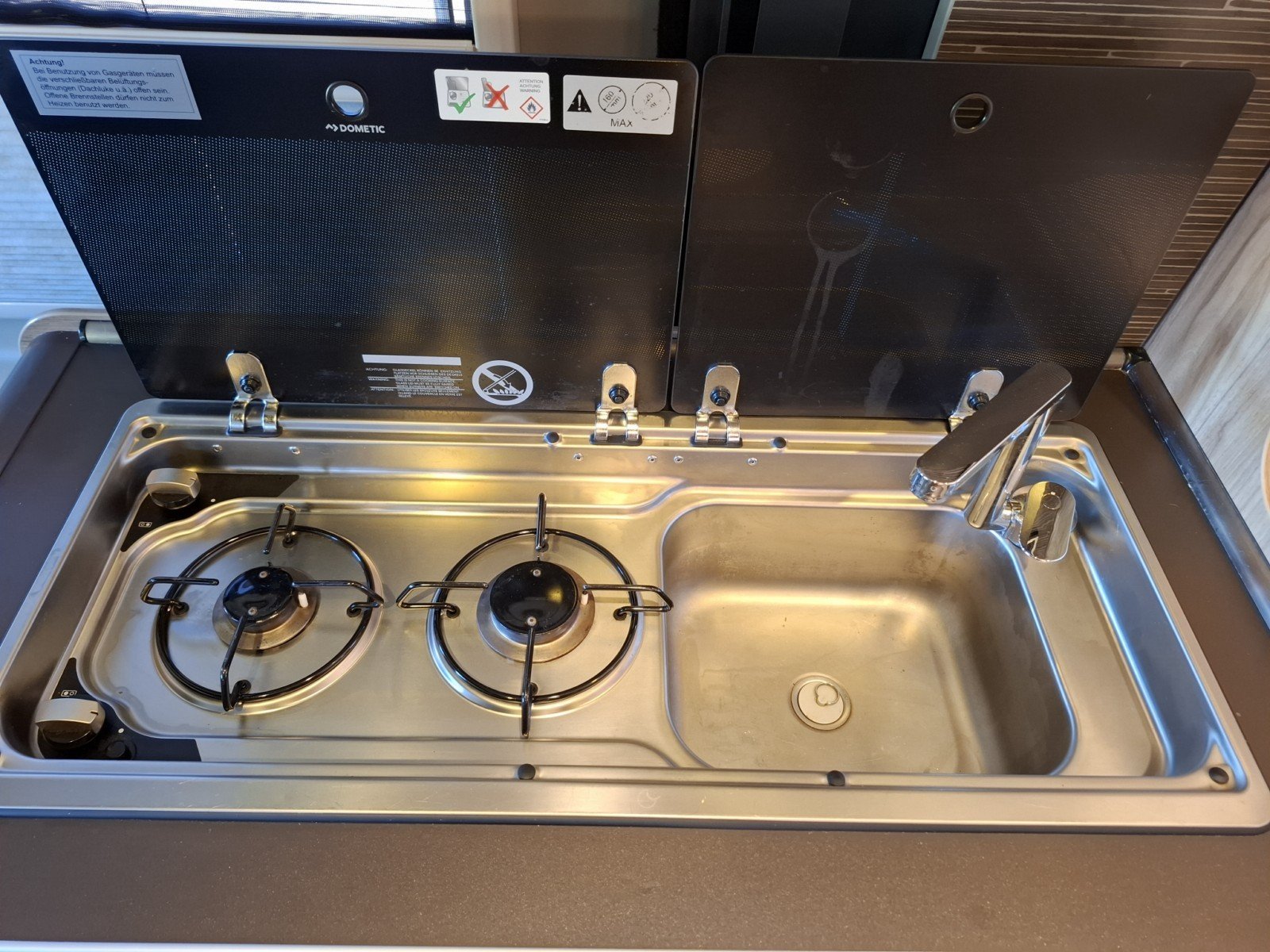 Beyond the side door is an essential kitchen featuring a hob with two gas burners, a sink, and a fridge with a freezer box, with plentiful storage.