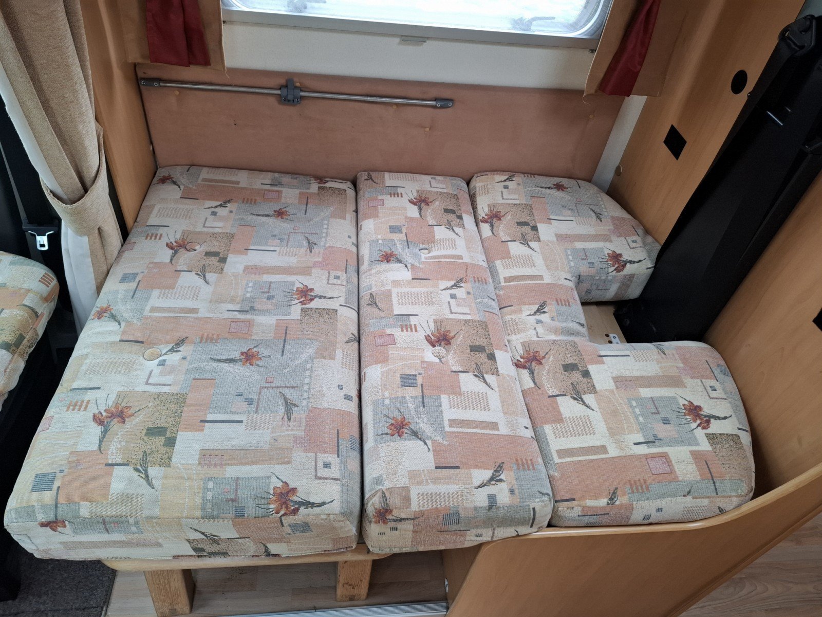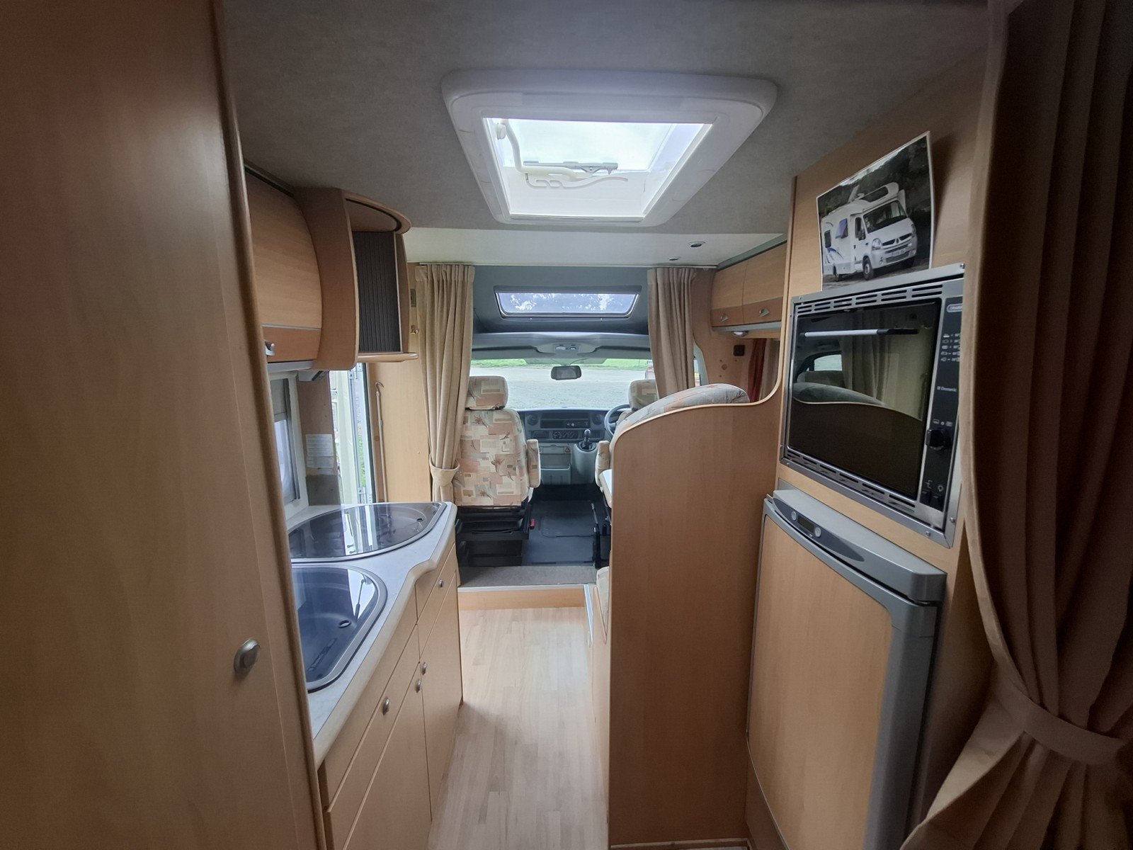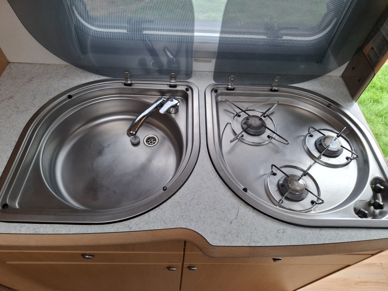 Moving beyond the dinette, on the offside, you will find a combination oven and grill, alongside a fridge equipped with a freezer compartment. Opposite this, there is ample storage, a sink, and a three-burner gas hob – providing a fully functional and convenient kitchen area.